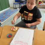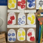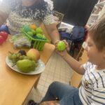 A gyümölcsök jellemzőinek átbeszélését követően hála befőtteket készítettünk a csoport kamránkba gyümölcs nyomdázással. Az előre megrajzolt befőttes üvegek díszítései segítették a gyerekeknek a szín szerinti gyümölcsök kiválasztását a nyomdázáshoz. Átbeszéltük a gyümölcsök színeit, majd buzgón kiválogatták a gyümölcseiket, festeni és gyümölcs nyomdázni kezdtek a gyermekek, majd a kész befőttjeiket felragasztották az előre megrajzolt kamrába.