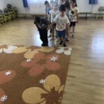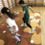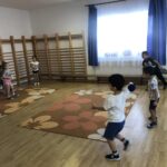 Ki ér hamarabb a célba(bordásfalhoz)?: A gyermekek a földön elhelyezett hópelyhekre lépkedve érhetek el a kijelölt célig.