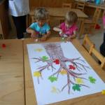 A jól ismert Napindító dallal indultunk el ismét a boldogság útján. A hálafa történetét megismerve készítettünk egy Hálafát, amire jellel ellátott, színes őszi leveleket ragasztottunk. Minden nap ebéd előtt elmondhatták, jelükkel jelöltük, hogy azon a napon ki, kinek, miért hálás. Hálaszívet készítettünk a csoport kedves óvónénijének, aki egy ideig nem lehet velünk. Kiszíneztük a hála jelét, amit hazavihettek….