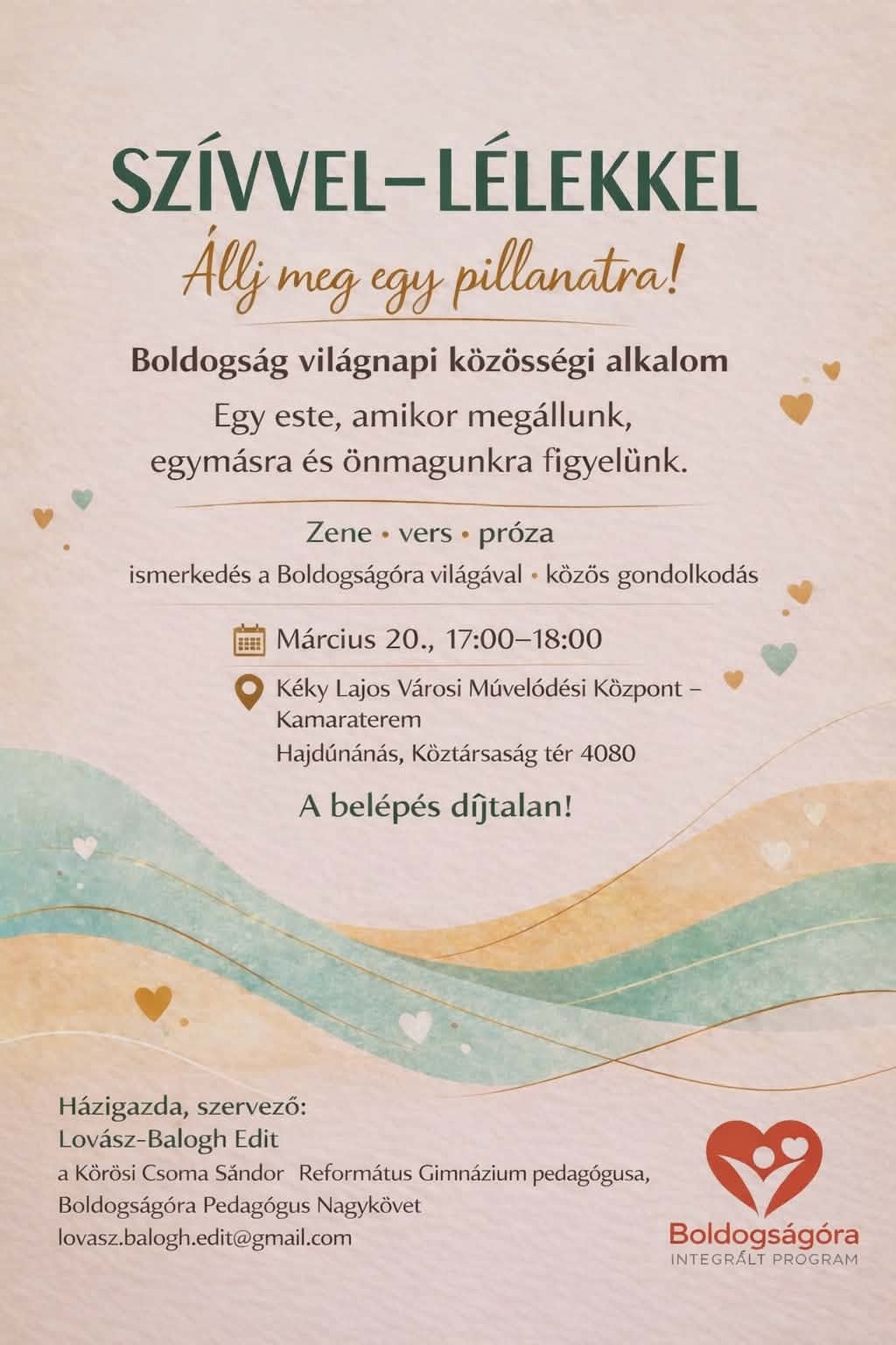 Hagyományteremtő szándékkal került megrendezésre Hajdúnánáson első alkalommal, városi szinten a boldogság világnapi „Szívvel-lélekkel” elnevezésű rendezvényem március 20-án, a Kéky Lajos Városi Művelődési Központ kamaratermében. A rendezvény célja az volt, hogy felhívja a figyelmet az értelmes és boldog élet lehetőségére és a pozitív közösségi élmények fontosságára.