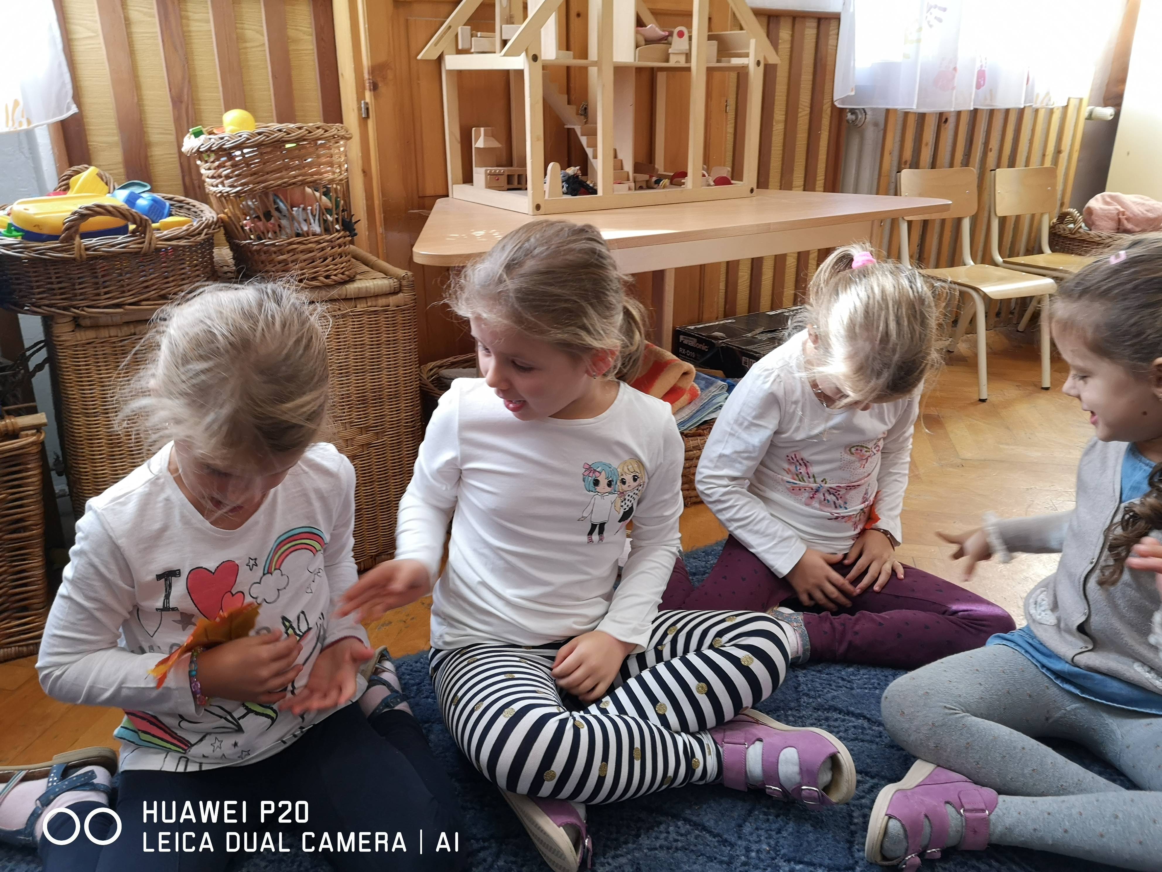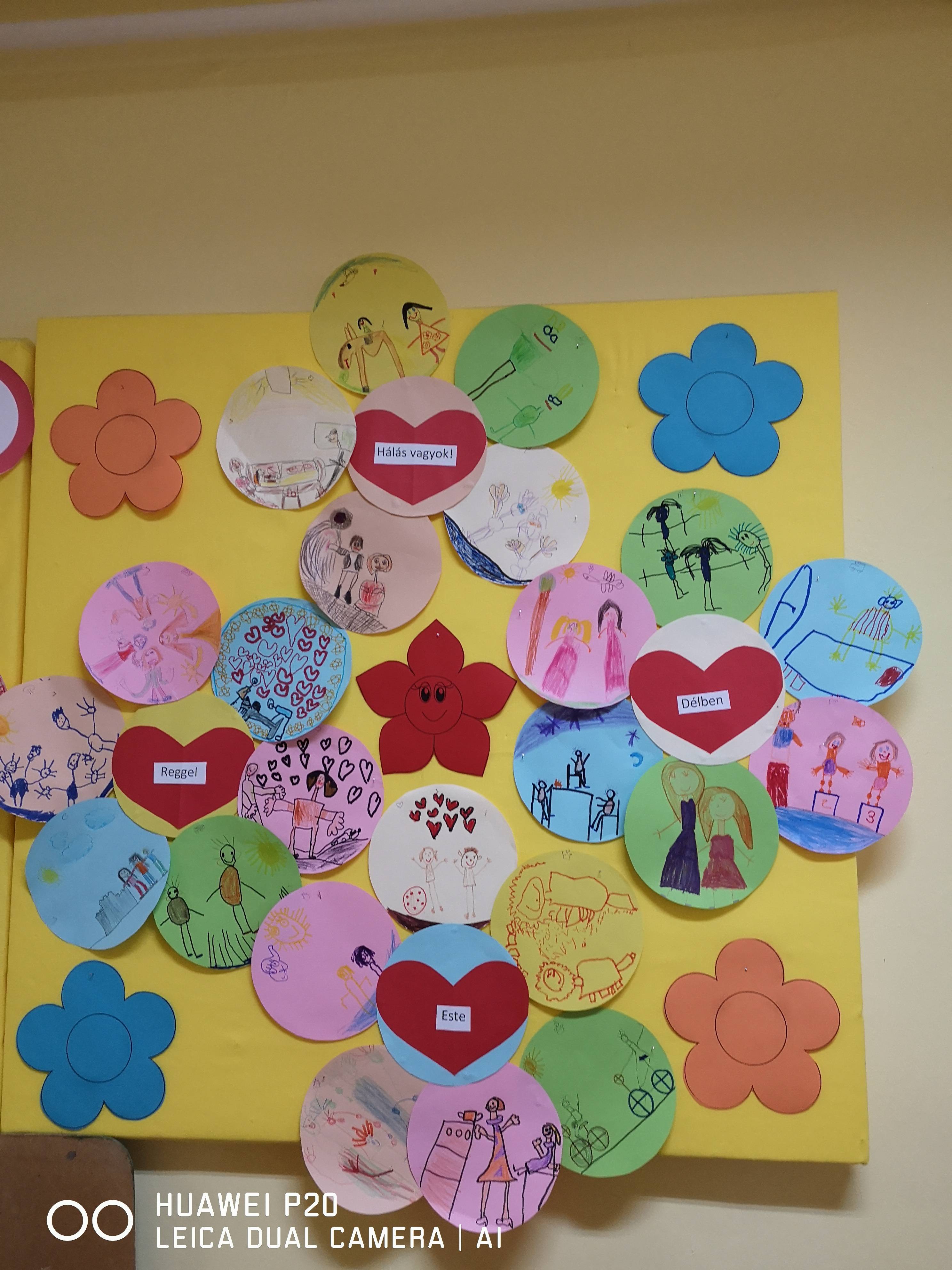 A hála feldolgozását, a hálafa történetének elmesélésével kezdtük. Majd beszélgettünk arról, hogy ki minek hálás. Mindenki elmondhatta, hogyan szokta kifejezni a háláját. Próbáltam őket arra rávezetni, hogy a hála kifejezésének egy mosoly, egy köszönöm, egy ölelés lehet a legegyszerűbb formája. Lerajzoltattam velük a kezüket, melyet nekik kellett kivágni. Ebből készítettük el a hála virágot. Színeztünk, meghallgattuk a hónap dalát, játszottunk a falevelekkel. Zárásként rajzoltunk, megjelenítették, hogy ki miért hálás reggel, délben, este.