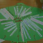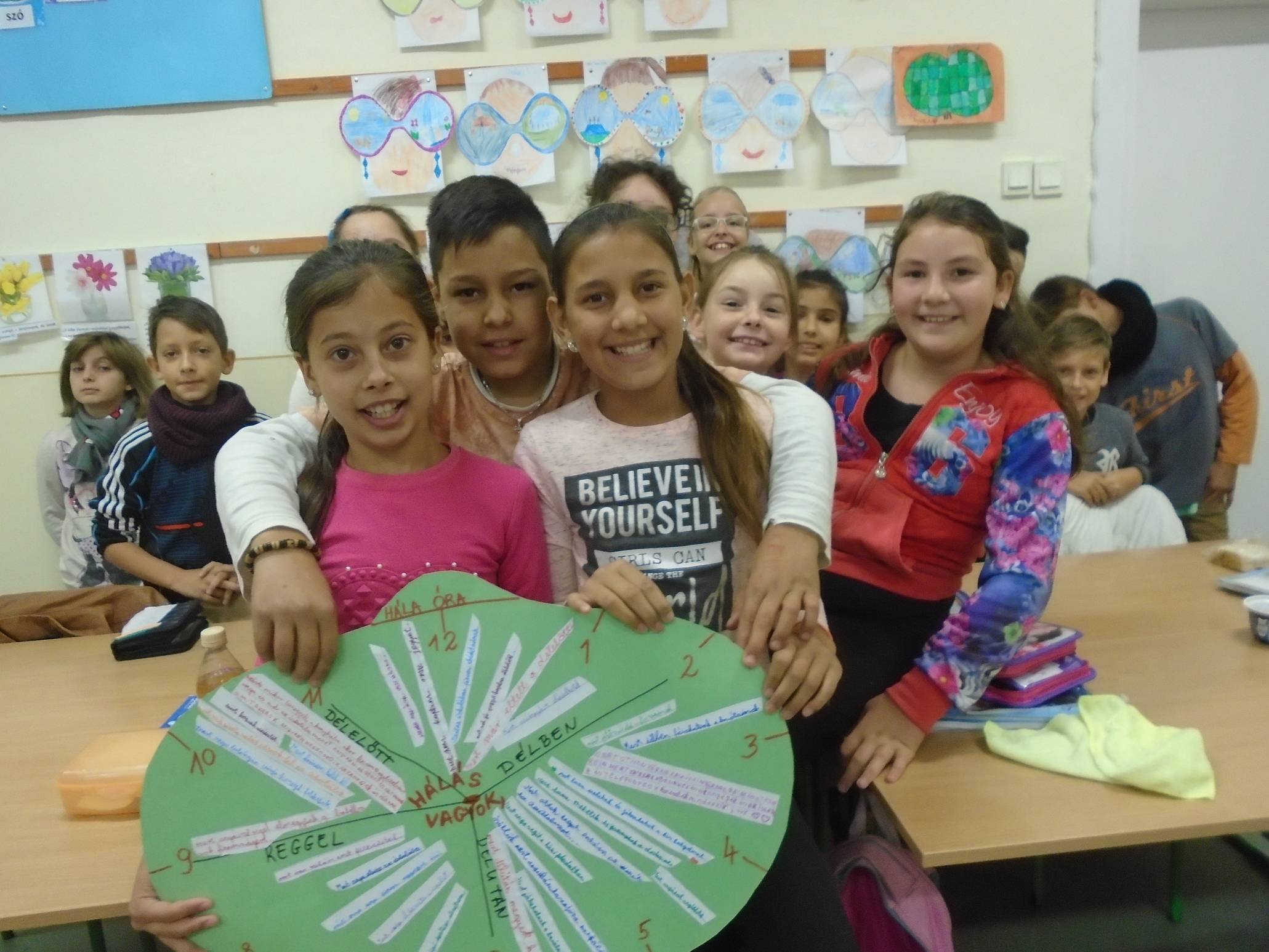 Ezek után mindenki papírcsíkokat kapott, melyre azt lehetett ráírni, hogy minek és kinek lehetünk hálásak reggel, délben és este. A papírcsíkokat felragasztottuk egy tablóra, végül az óra emlékére egy közös képet készítettünk.