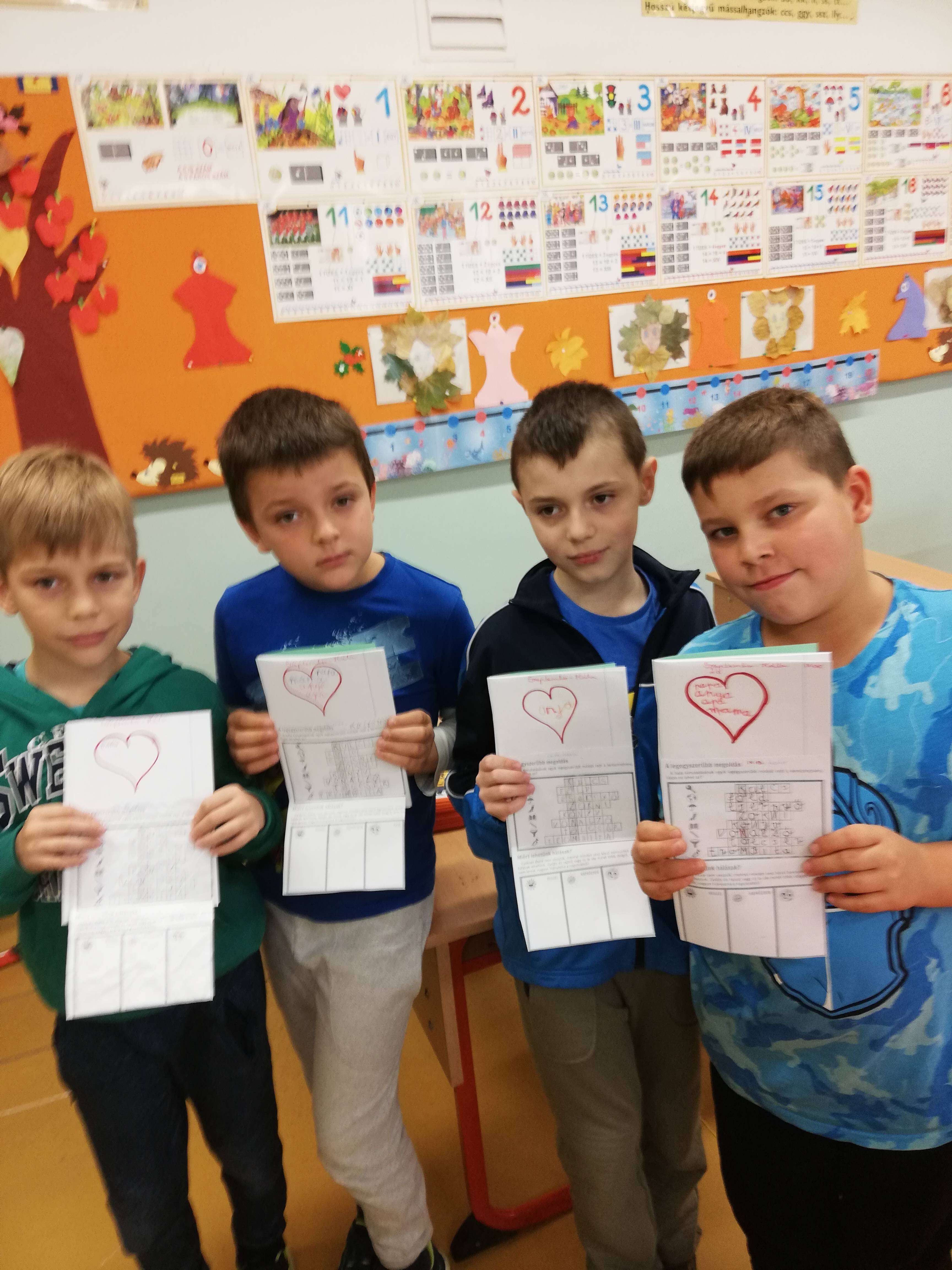 A 2.a osztály 2. csoportjában 4 kis problémás kisfiúval foglalkozom. Ők nehezen kezelhető gyermekek. Amikor első osztályosok voltak, alig lehetett velük szót érteni. Lehet hogy sokan lemondtak róluk, de a iskola vezetői és én közös úton, egy gondolattal azon vagyunk, hogy újabb értelmet nyerjen jövőjük a boldogságórákon.