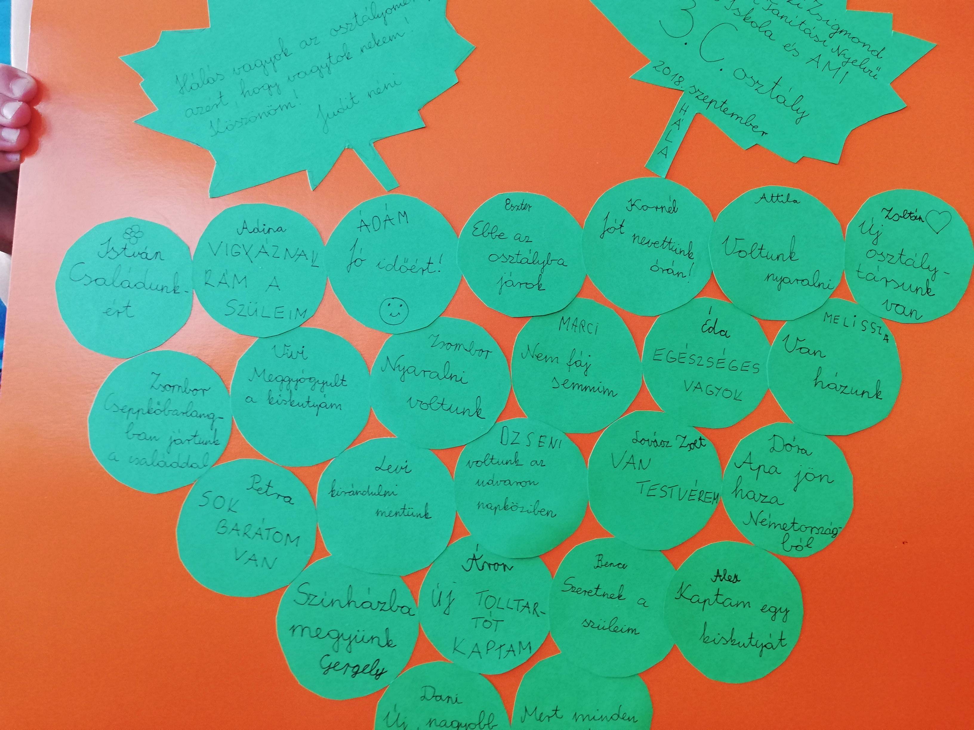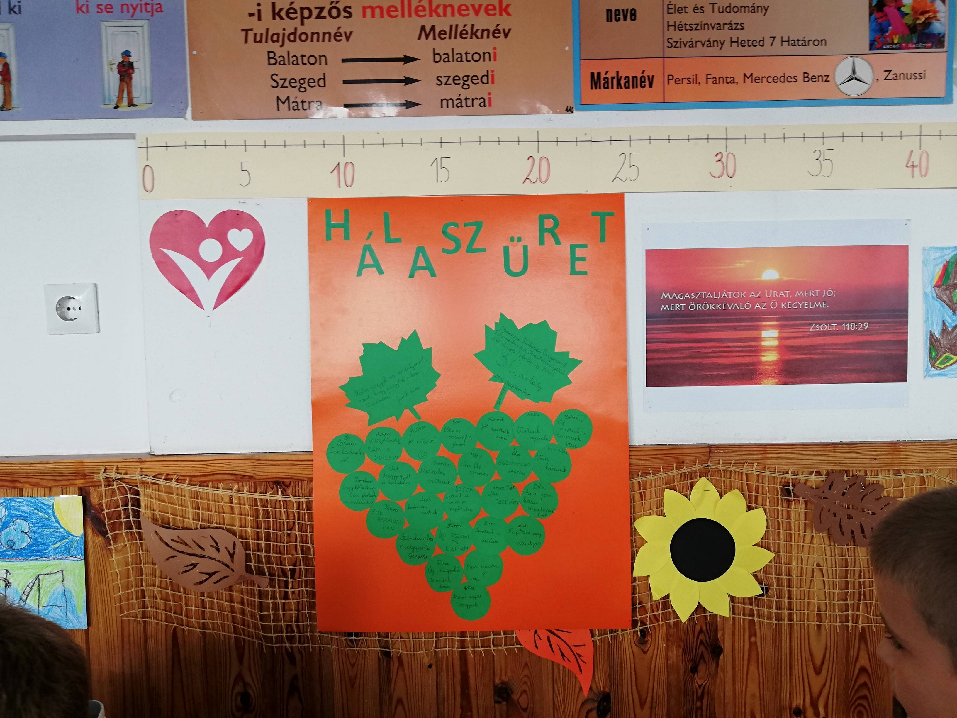 Szüreteltünk, de nem szőlőt, mint itt Hegyalján szokás szeptemberben, hanem a hála gyümölcseit szedtük le első boldogságóránkon. Bő termésünk lett. 25 szem szem szőlő, 25 gyermek hálája, mindez egy fürt szőlőre fűzve, ez a mi osztályunk, a 3.c. A tanítójuk is hálás, hogy ilyen nagyszerű gyerekek között lehet nap, mint nap.