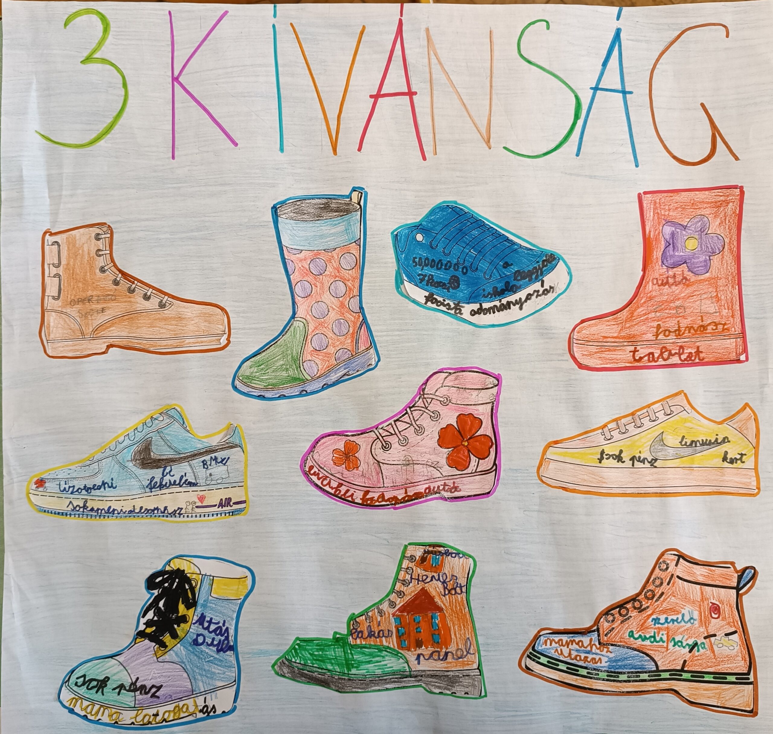 4. Az elkészült „Bakancs listákból” elkészült osztályunk plakátja: a 3 kívánság.