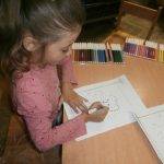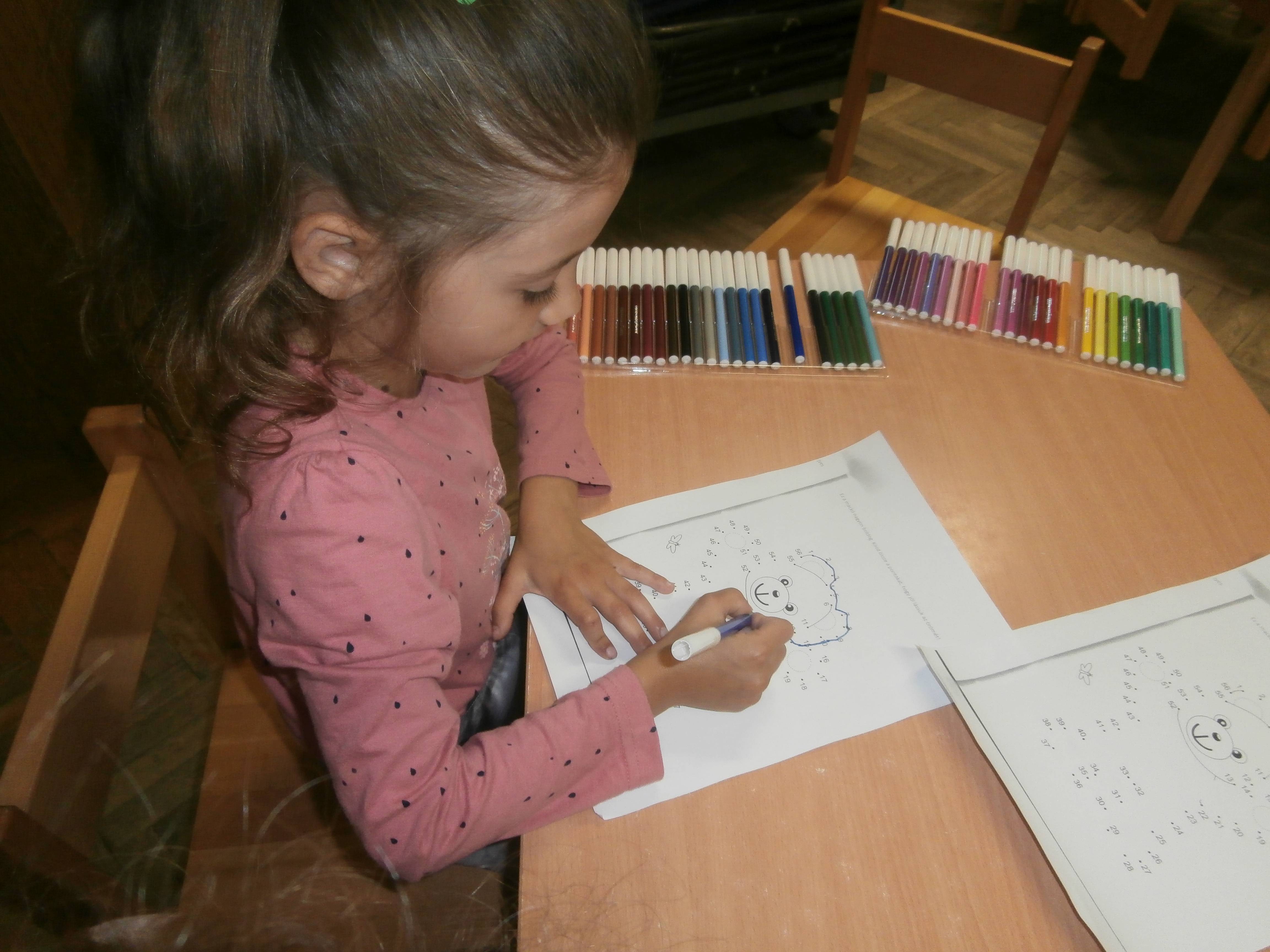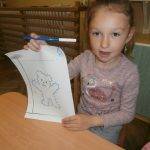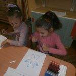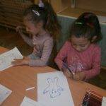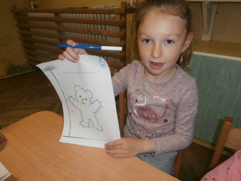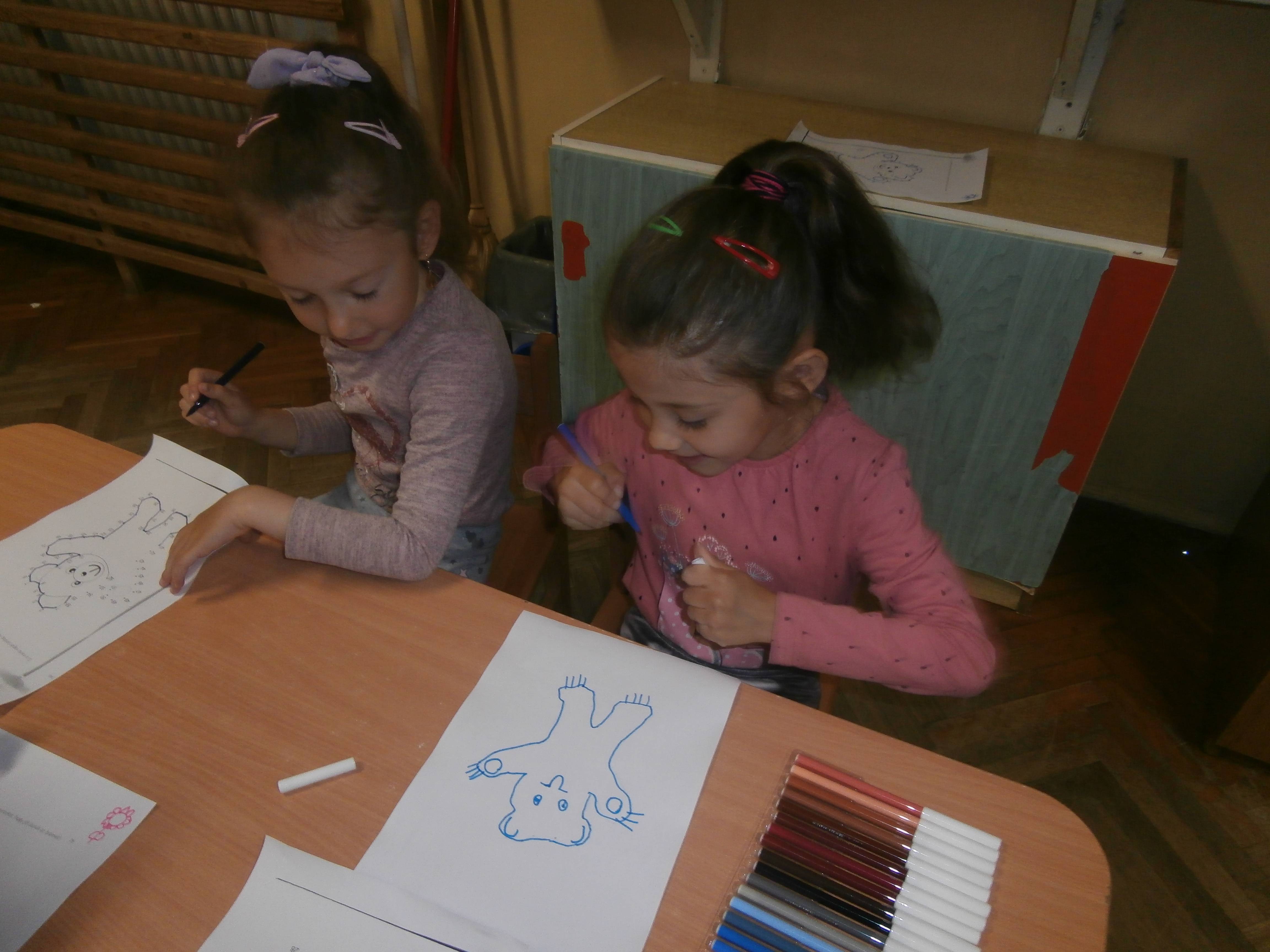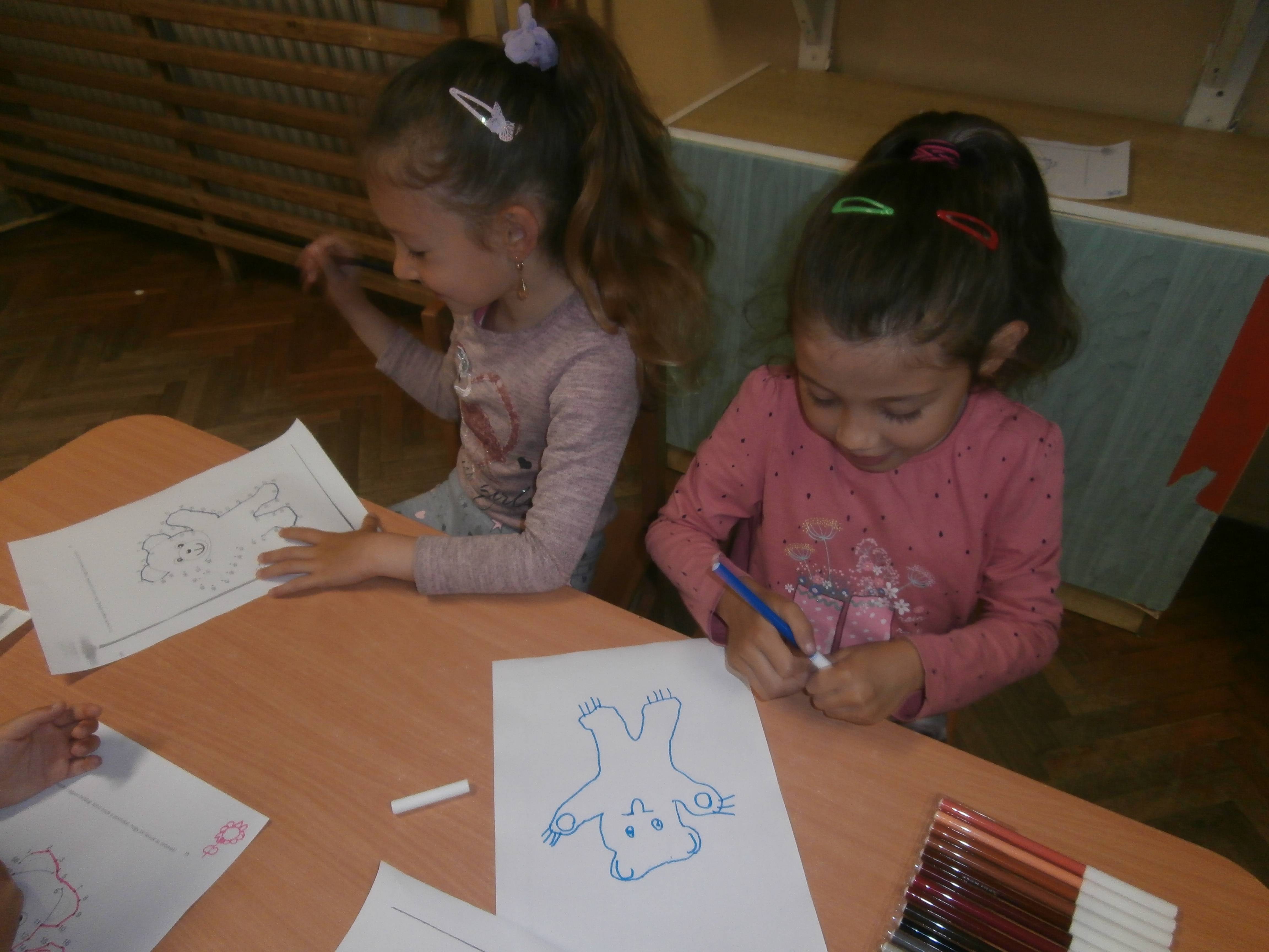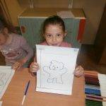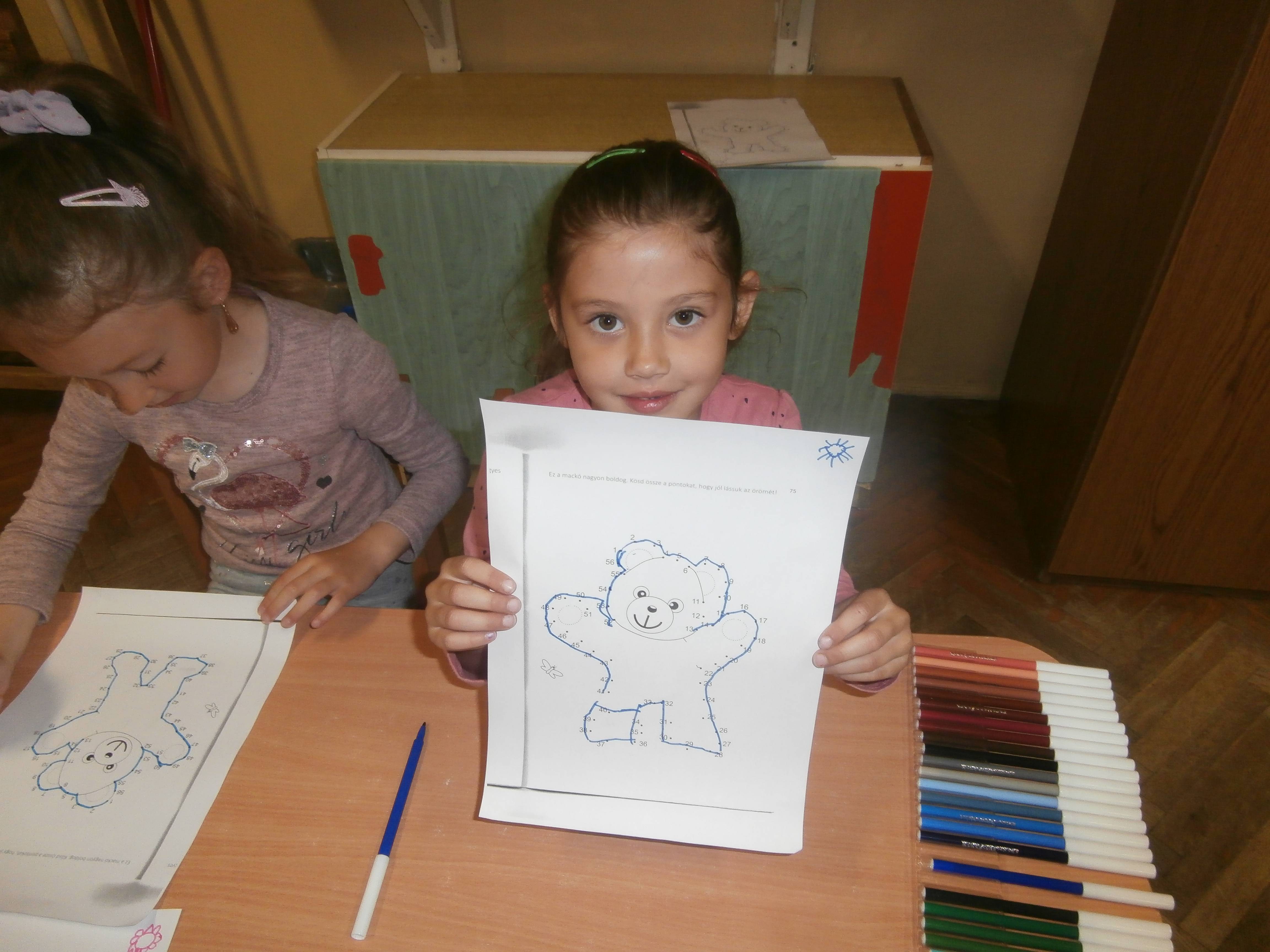 A foglalkozáson zenehallgatás után meséltem. A mesét követően kimentünk az udvarra és a többi óvodás gyermek bevonásával „seprűt táncoltatunk”, a könyv ajánlása szerint nem kiesős formában. Érdekes volt, hogy a barátok megkeresték egymást ebben a játékban. A csoportba visszatérve a munkafüzetből kimásolt macit rajzolták körbe a gyerekek.