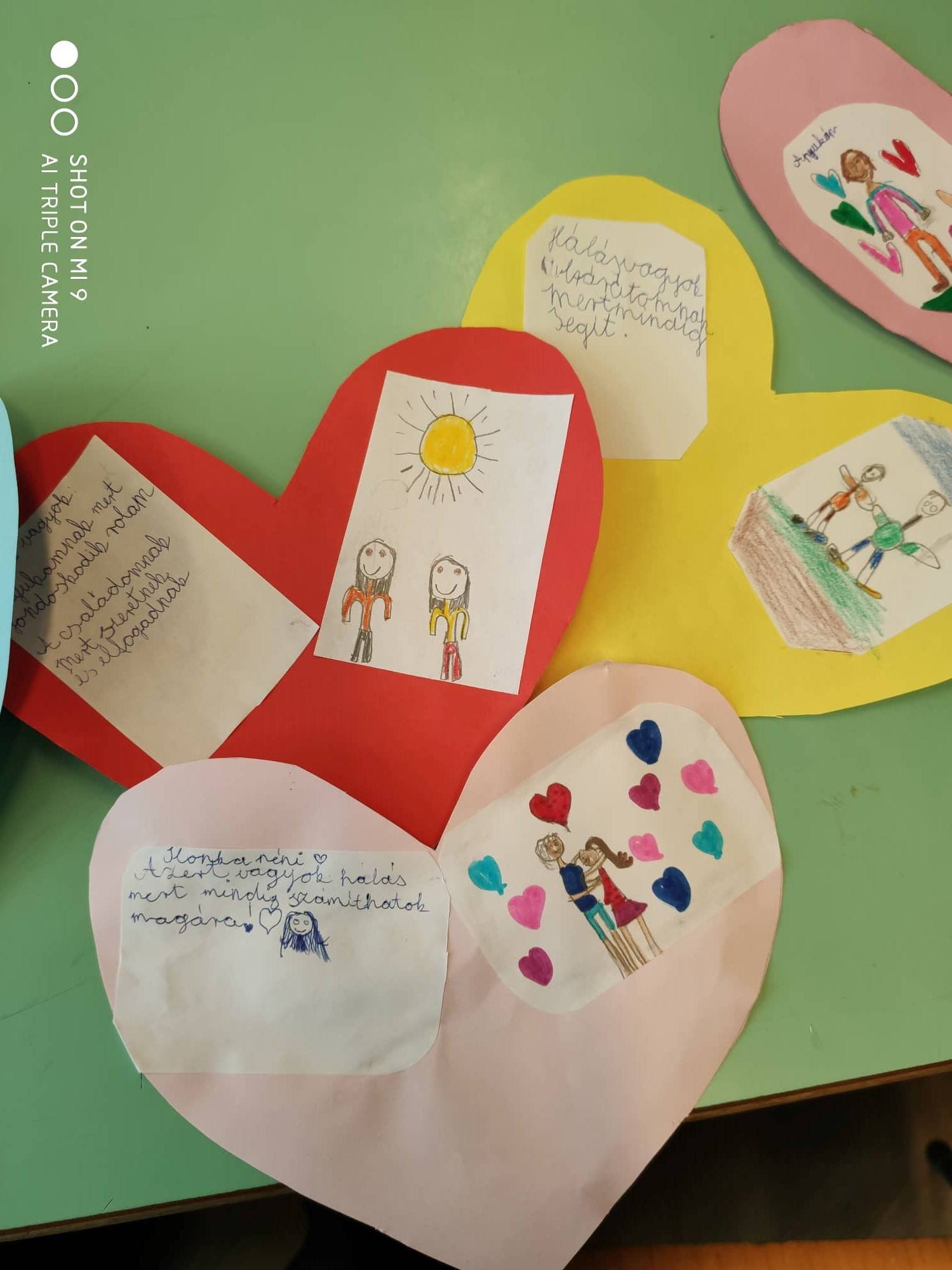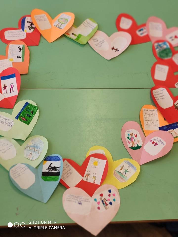 A gyerekek Hálaszíveket készítettek és leírták vagy lerajzolták kinek lehetnek hálásak és miért.