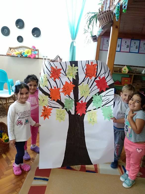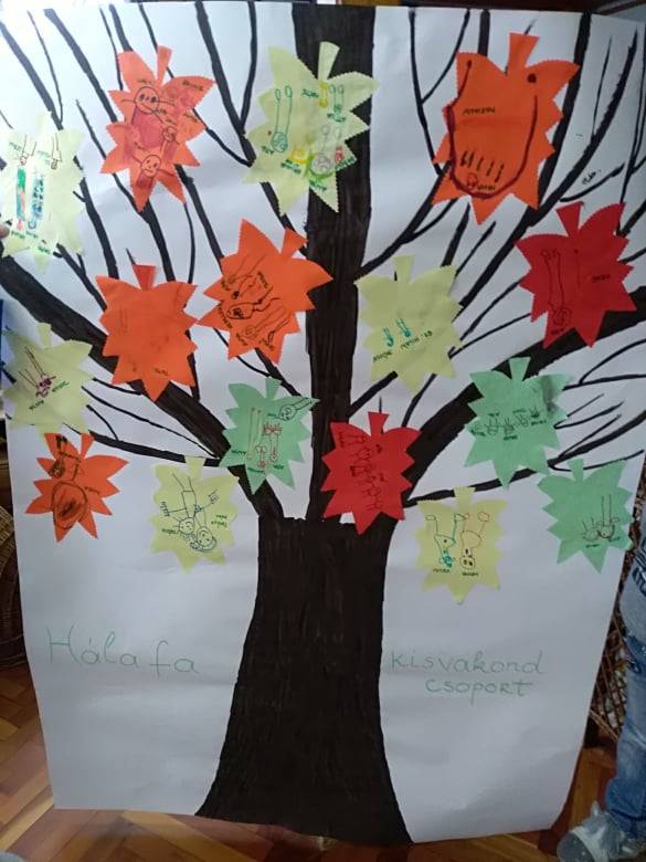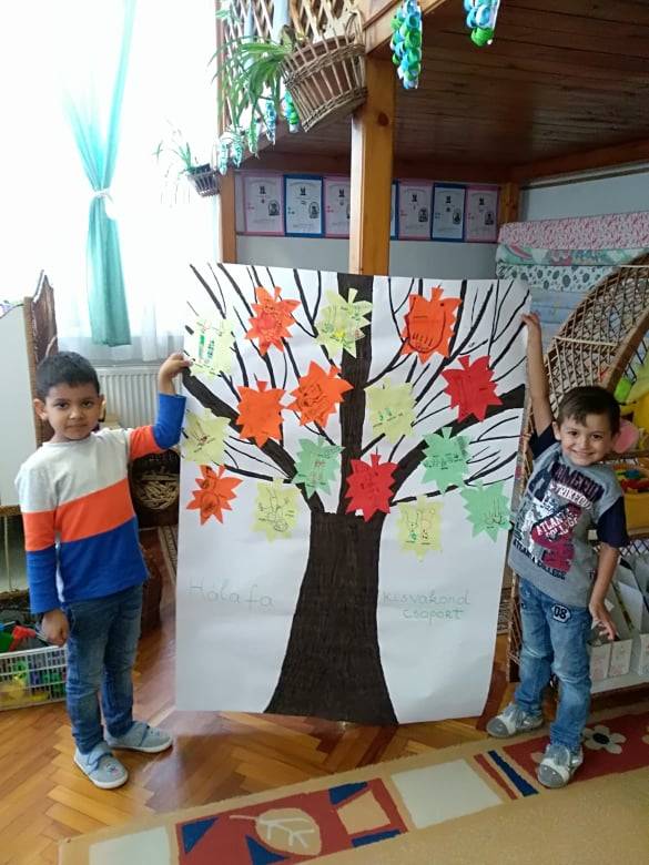 A kis vakond csoportban a mai napon a boldogságfokozó hála témával foglalkoztunk. A szeretet fogalmával közelítették meg magát a hála szót. Számukra a hála egyenlő volt a beszélgetéseink során a szeretettel. Örömmel és csillogó szemekkel vettek részt ezen téma feldolgozásában. Relaxáló gyakorlattal kezdtünk, ” Irka-firka” mely egyfajta felszabaduló érzést váltott ki belőlük. Idézem őket: „milyen jó volt” , „csináljuk még egyszer” Ezt követően a szőnyegen körben ülve egymás kezét megfogva énekeltük a dalt: ” Szép nap ölelj most át engem”. Adott mindenki egymásnak éneklés közben egy ölelést is, kifejezvén egymás iránti szeretetüket. Ezt követően elkészítettük közösen a mi kis hála fánkat, mely az óvoda folyosójának falát díszíti, amit bármikor megtekinthetnek. Önmagukat és azt a személyt rajzolták az őszi levelekre akièrt hálát èreznek. Végezetül egy mesével zártam a napot, mely egy hálás fáról szólt. Úgy érzem sikerült megvalósítanom, és átadnom azt az érzést ami a hálával kapcsolatos, mert szeretettel tiszta szívvel nagy érdeklődéssel és ragyogó tekintetekkel vettek részt tevékenységeimen. Jó volt adni és kapni is! 🙂