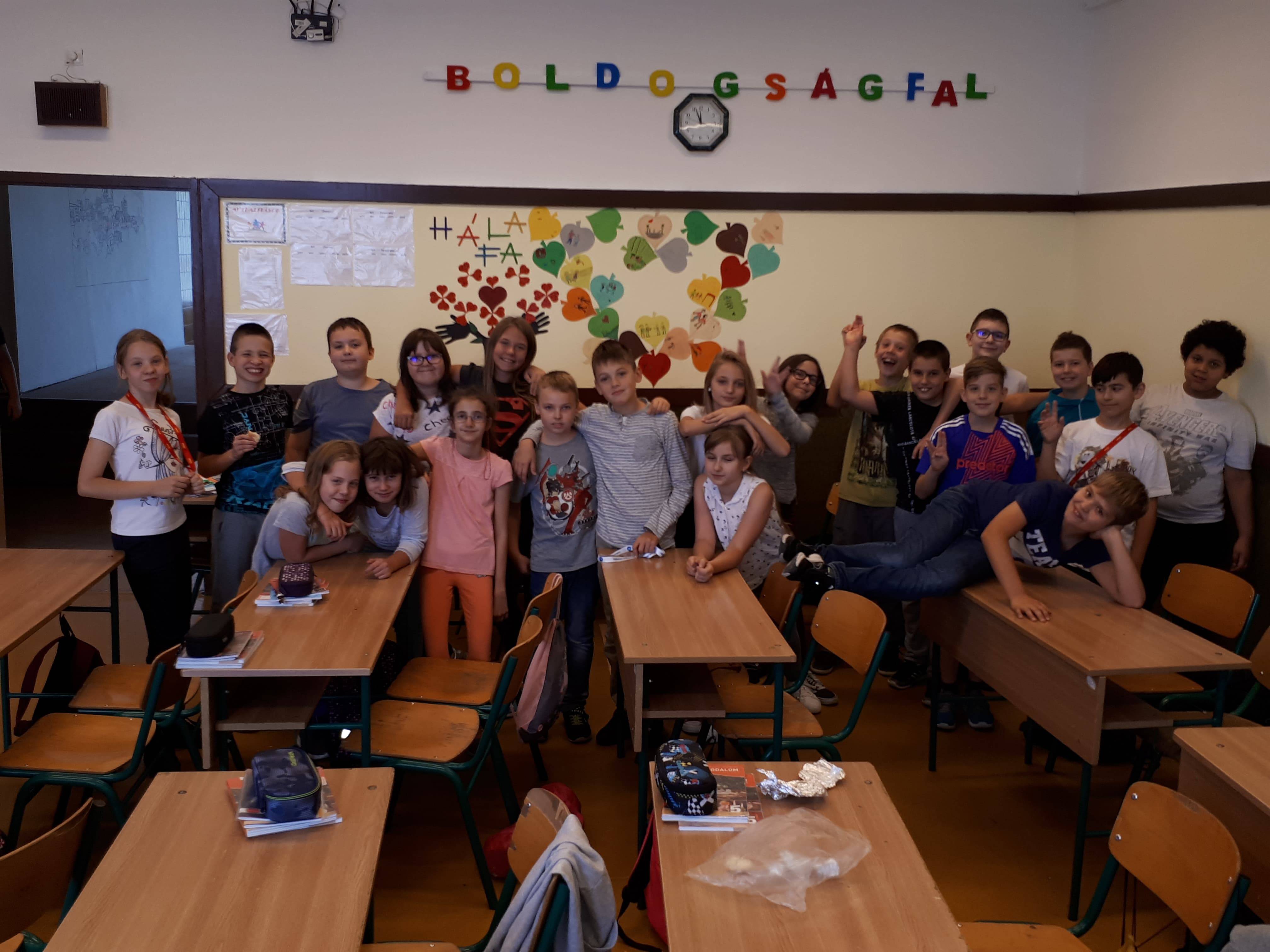 Osztályommal a 2018/2019. tanévben csatlakoztunk a boldogság óra programhoz. Fontosnak tartom, hogy a gyerekek a mindennapi iskolai és azon kívüli életét pozitív irányba tereljük. Különböző módszerek segítségével olyan új és hasznos tartalmakkal megtöltve fejlesszük, amelyek később is meghatározóak lesznek számukra és a jóllétük alapjául szolgálhatnak. A lelki egyensúly megtalálása, a motiváció elősegítse érdekében a pozitív pszichológia eszközeit véve alapul. A csapatépítés, tolerancia, empátia, odafigyelés kulcsfontosságú, ebben látom elsősorban jelentőségét a boldogság óráknak. A szeptemberi hónap témája, a hála kapcsán egymásra építve több órán keresztül beszélgettünk, ismerték meg egymás gondolatait és érzéseit a gyerekek. Elkészítettük a névre szóló hálafánkat, és szív formájú falevelekre a gyerekek leírták és rajzokkal illusztrálták kiknek és miért hálásak, miért mondanak köszönetet.