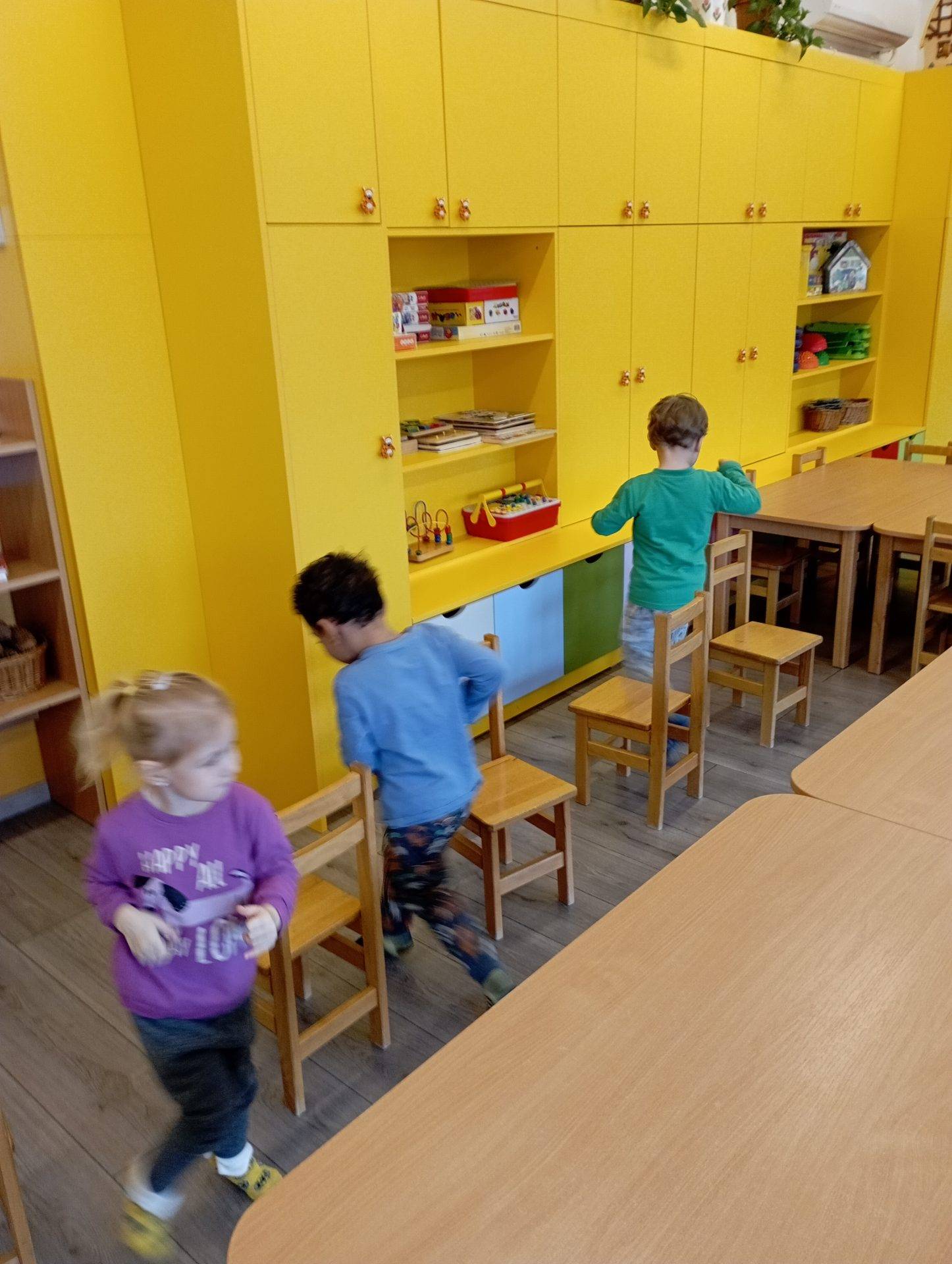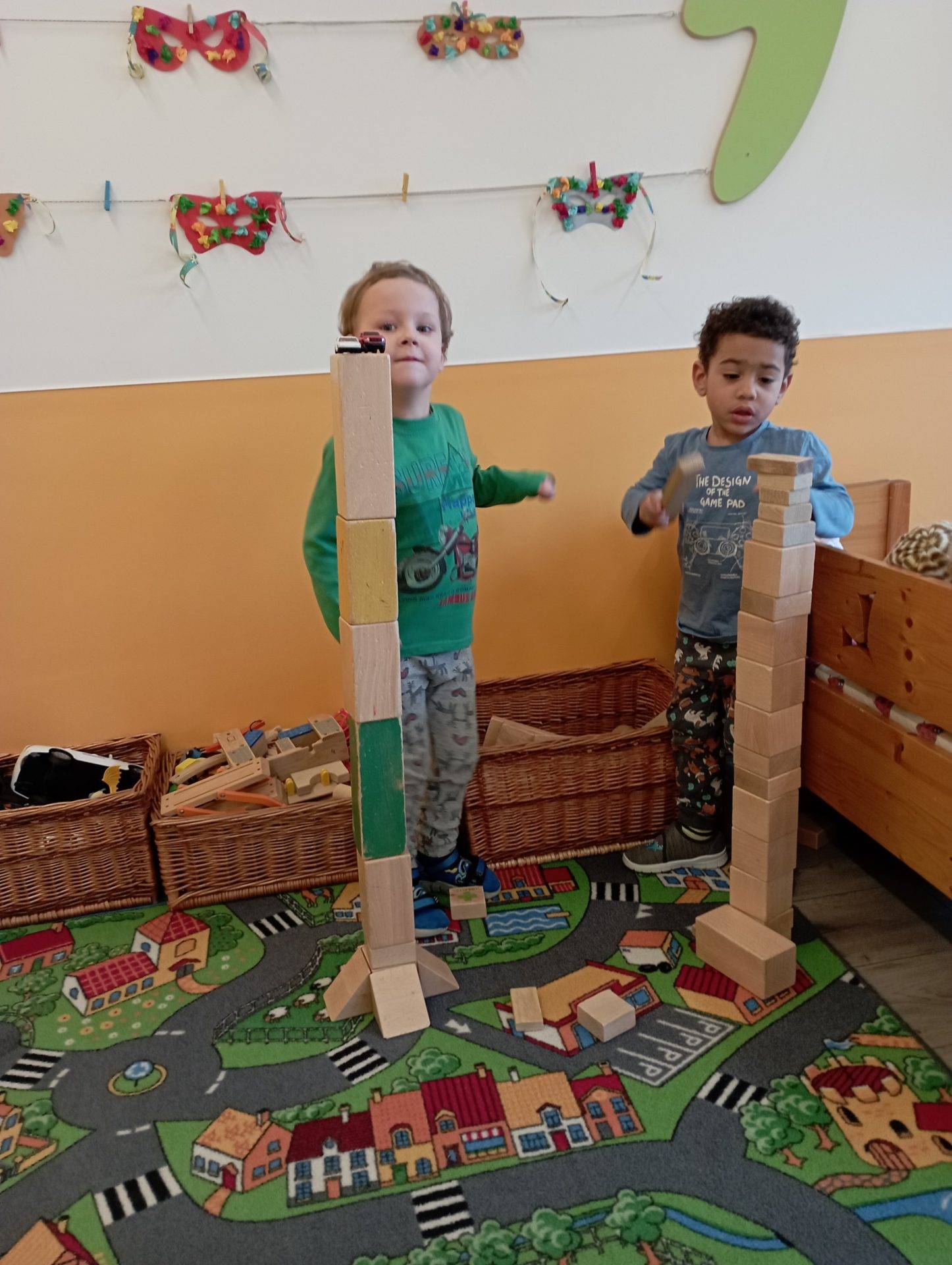 A gyerekek a játszószőnyegen szívesen építenek fakockából magas tornyot. Fontos felhívni a figyelmüket ennek veszélyére, mert a dőlő torony balesetveszélyes. Így most különösen örültek a kihívásnak, hogy versenyezhettek, ki épít magasabb tornyot.