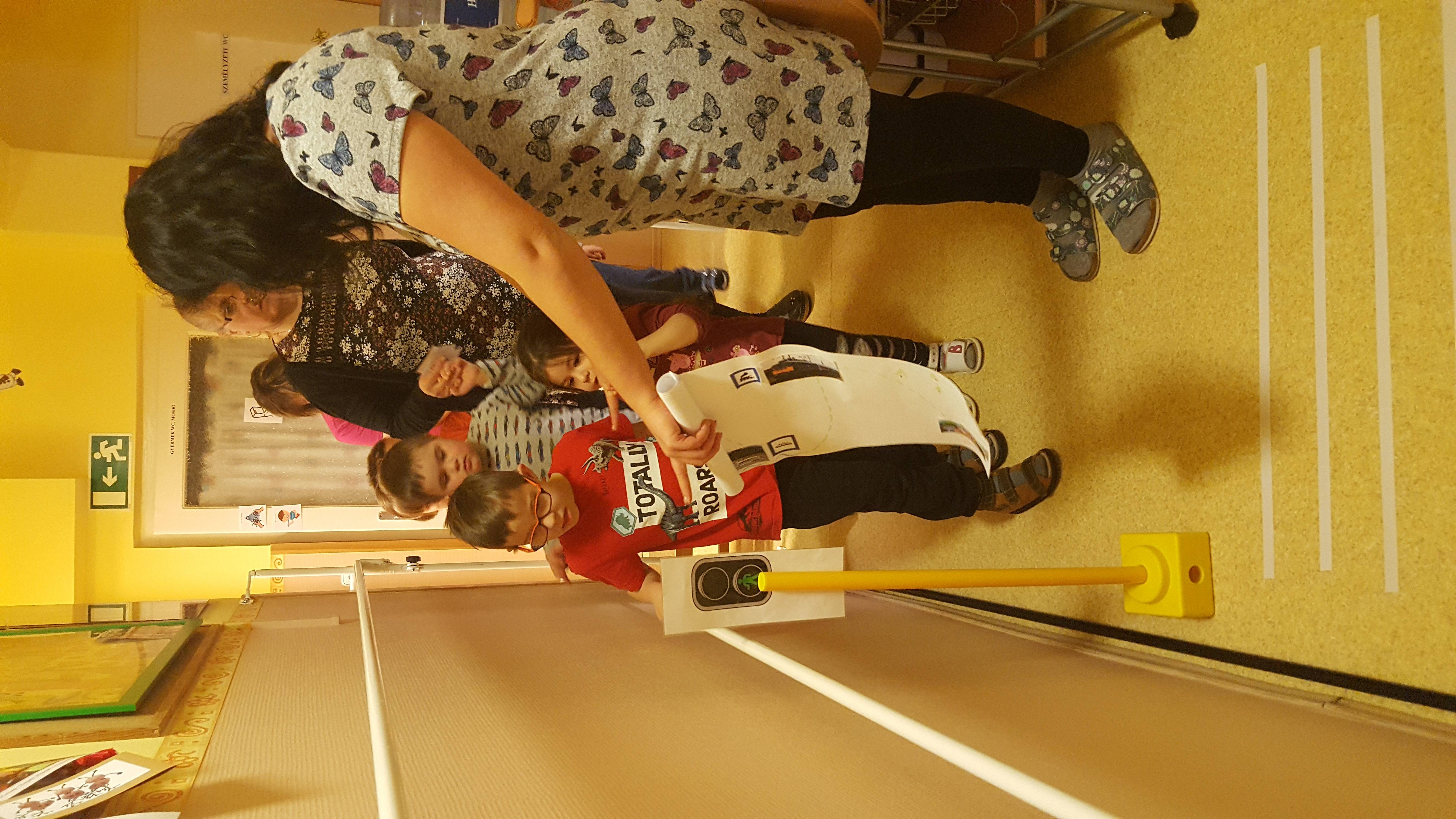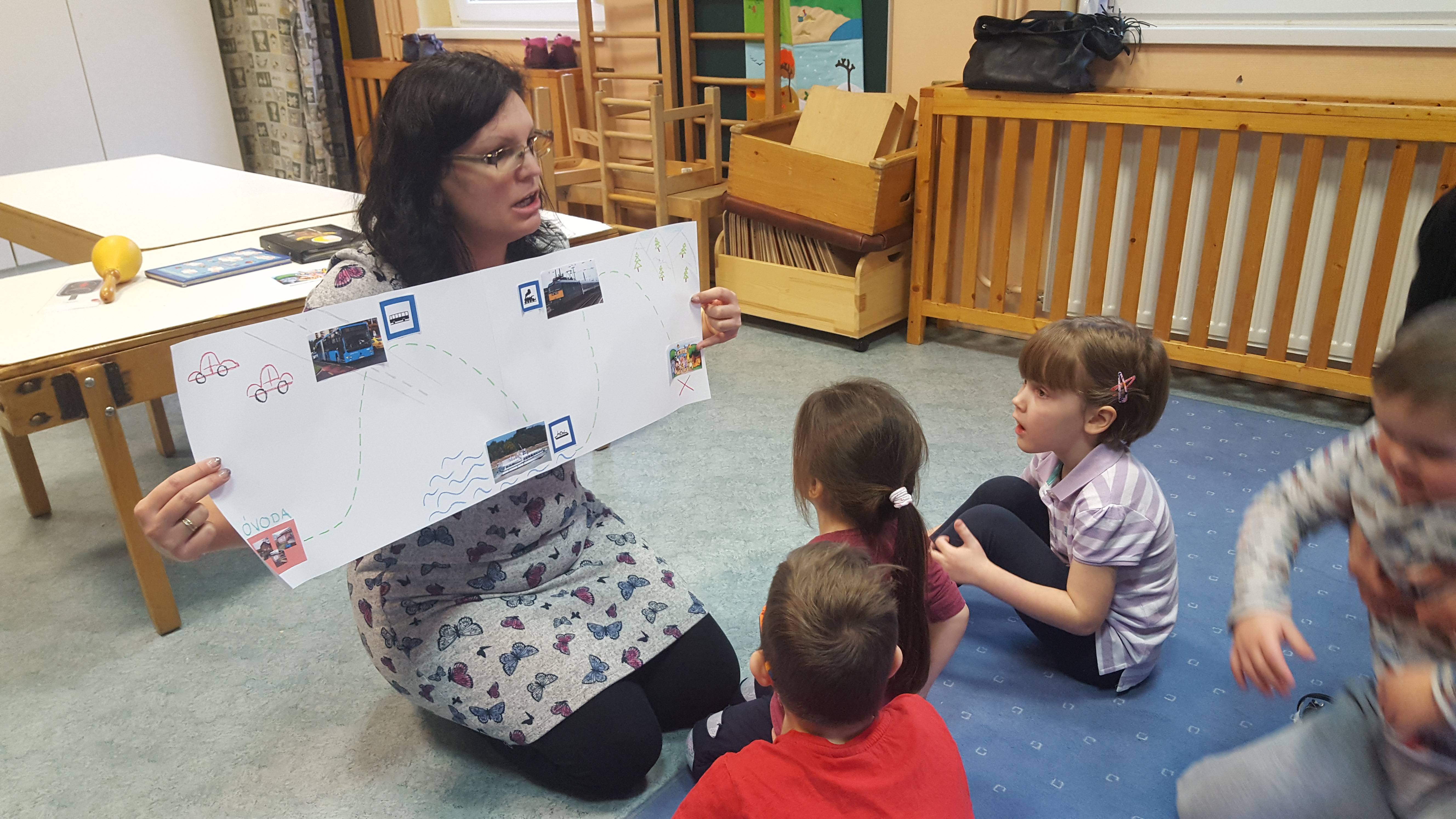 • Megvalósítás: Az „utazás” folyamán fel kell ismerniük a közlekedési eszközökhöz tartozó táblákat, valamint be kell tartani a gyalogos közlekedés főbb szabályait a kialakított gyalogátkelőhelyen. A térképet követve végig jártuk az utat a képzeletbeli állatkertig. A buszt és a vonatot kisszékekből építettem meg, a hajót egy óriás babzsák illusztrálta. A járművekhez adekvát versekkel, dalokkal, mondókákkal gazdagítottuk az élményt. Az állatkertben látott állatokról hasznos információkat adtam át. Az utat visszafelé is meg kellett tenni a térképre, valamint az emlékezetükre hagyatkozva.