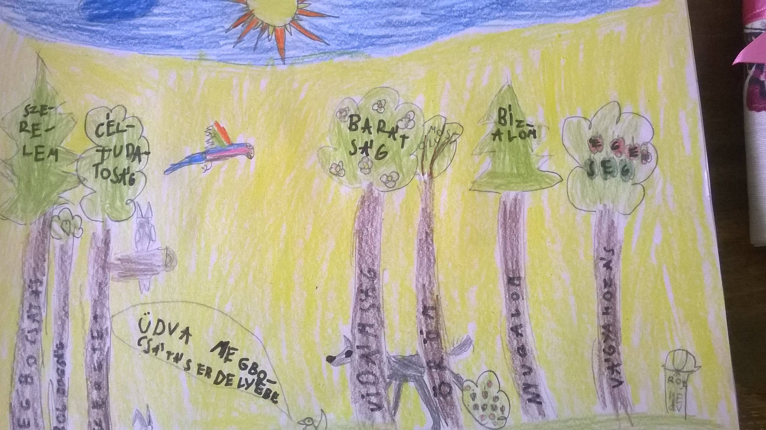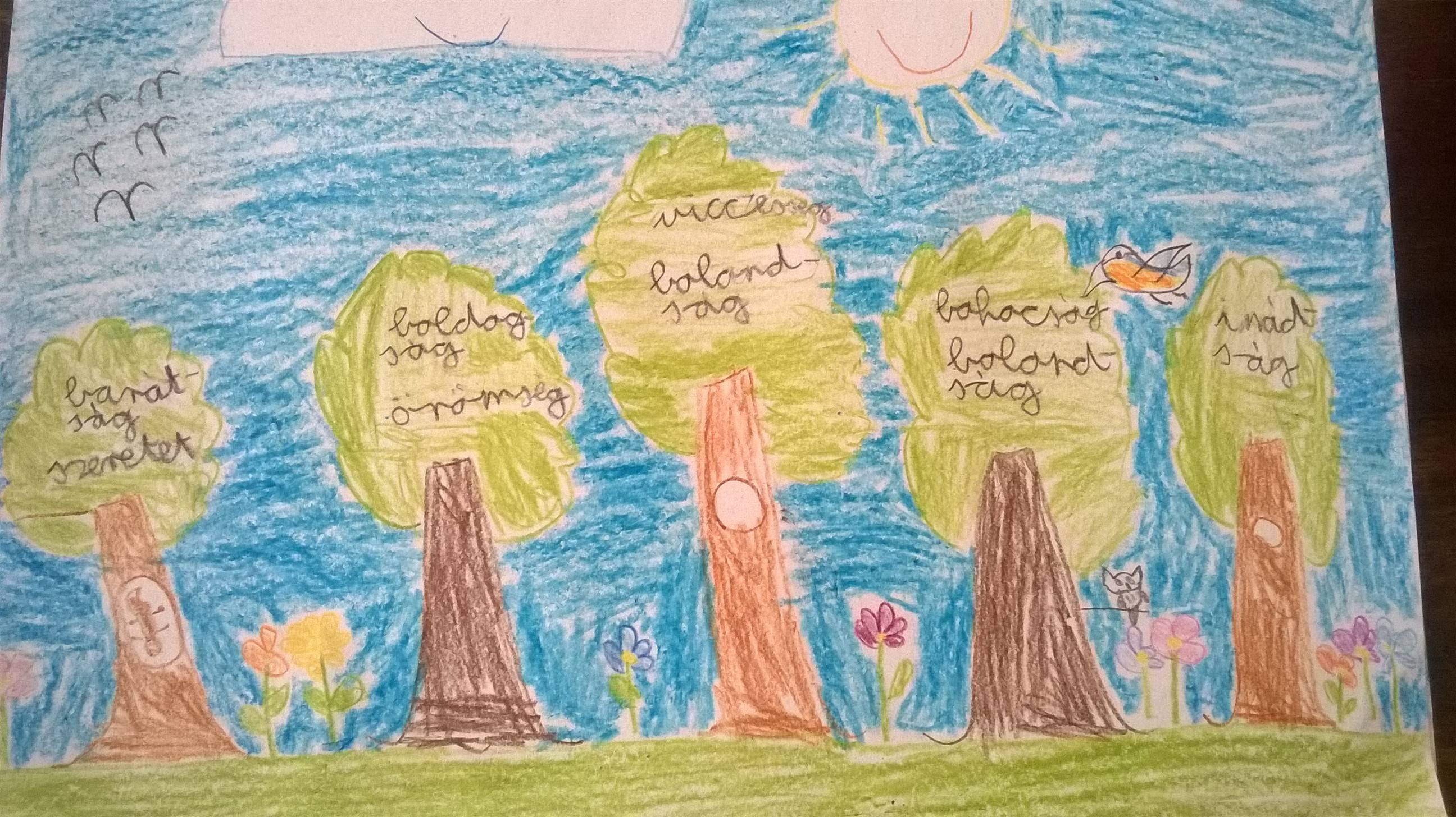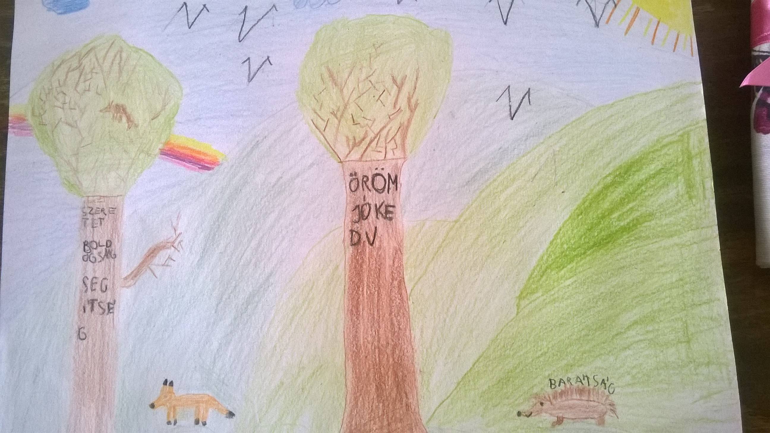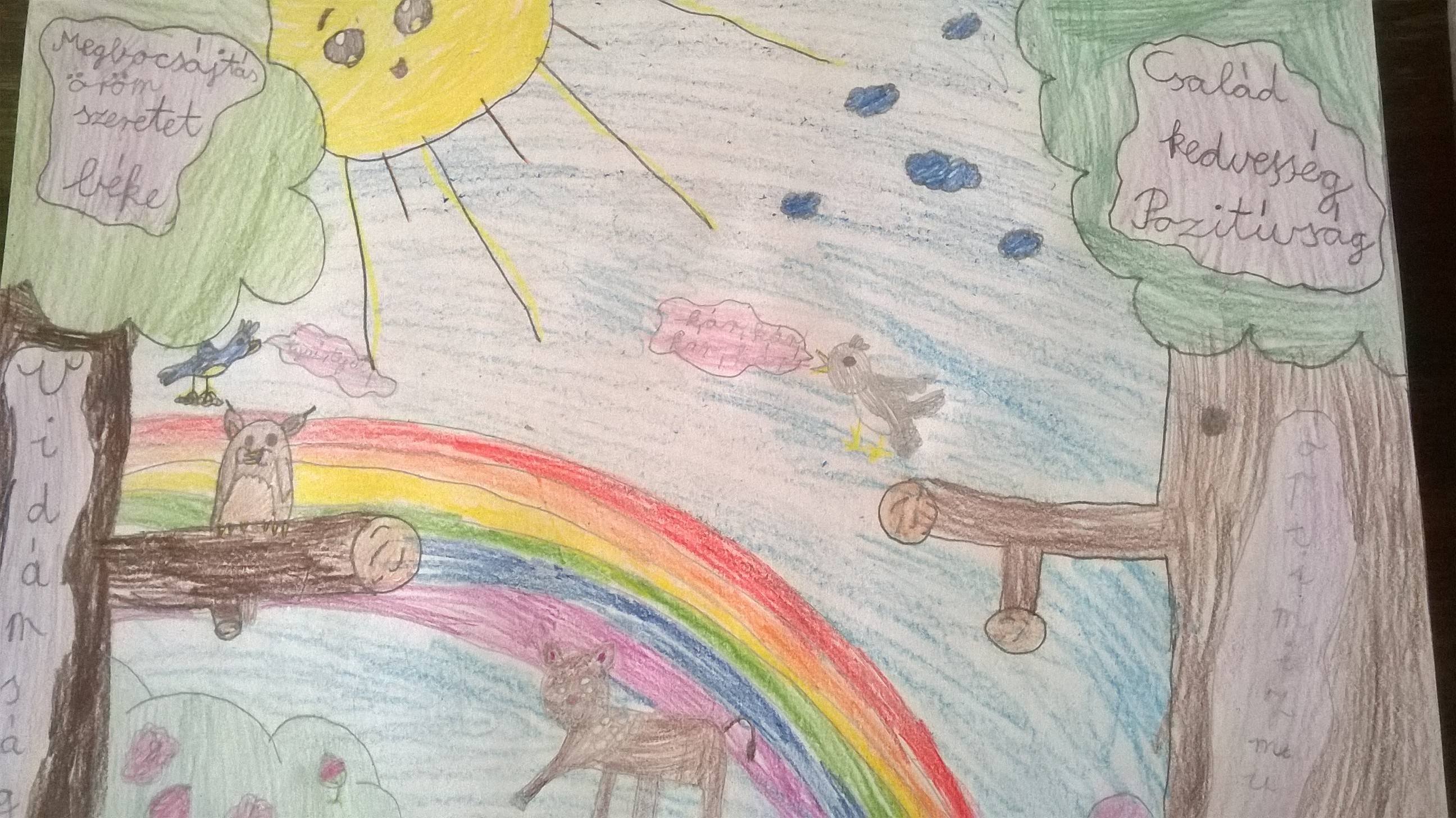 Az áprilisi boldogságórát egy játékkal kezdtük: a gyerekek improvizáltak olyan szituációkat, amelyben véletlenül megbántottak/megsértettek valakit. Ezután bocsánatot kellett kérniük, a másiknak pedig meg kellett bocsájtani. Arról beszélgettünk, mennyire volt nehéz a megbocsájtás. Ezután megkülönböztettük a véletlen és a direkt megbántást/megsértést. A tanteremben kijelöltük a megbocsájtás erdejét és a harag labirintusát. A gyerekek beálltak arra a helyre, amelyikre hajlamosnak érezték magukat. Azért haragszom mert…. Szeretek megbocsájtani, mert… – befejezték a mondatokat. Megbeszéltük, miért fontos a lelki egészségünk szempontjából a megbocsájtás. Példákat mondhattak a gyerekek arra, hogyan bántódtak meg, miként tudtak megbocsájtani. Kit mivel bántottak meg és hogyan engesztelték ki. Felidézték, milyen felszabadító érzés a megbocsájtás, a bocsánat kérés. Ezután lerajzolták a haragos és a megbocsájtó gyerek arcát. Eljátszottuk a szabadulás útját. Megbeszéltük, mely tulajdonságok segítenek a megbocsájtásban: türelem, szeretet, önbizalom…stb. Lerajzolták a megbocsájtás erdejét, ahol a fák mind egy-egy ilyen tulajdonság képviselői. Meghallgatjuk a hónap dalát.