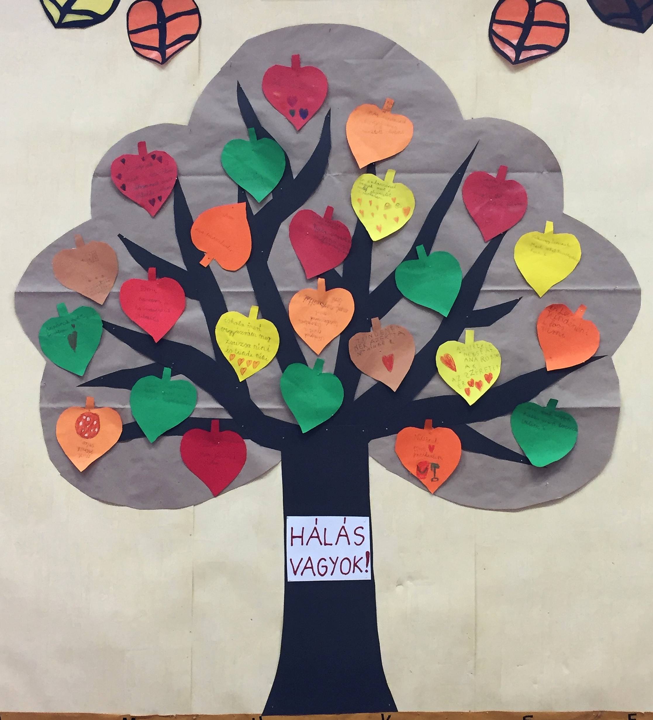 A Hétszínvarázs 2. olvasókönyv Ültess fát! című történetéből indultunk ki. Mi is ültettünk egy fát, mégpedig egy hálafát. A gyerekek kinyírták hozzá a színes leveleket, majd röviden ráírták, hogy kinek, és miért hálásak osztálytársaik vagy tanítóik közül. Mindenki hangosan elmondta az osztály előtt, hogy mit írt, mielőtt feltettük a leveleket a fára. A gyerekek nagyon élvezték, s büszkén mondták: Hálás vagyok xy-nak, mert …