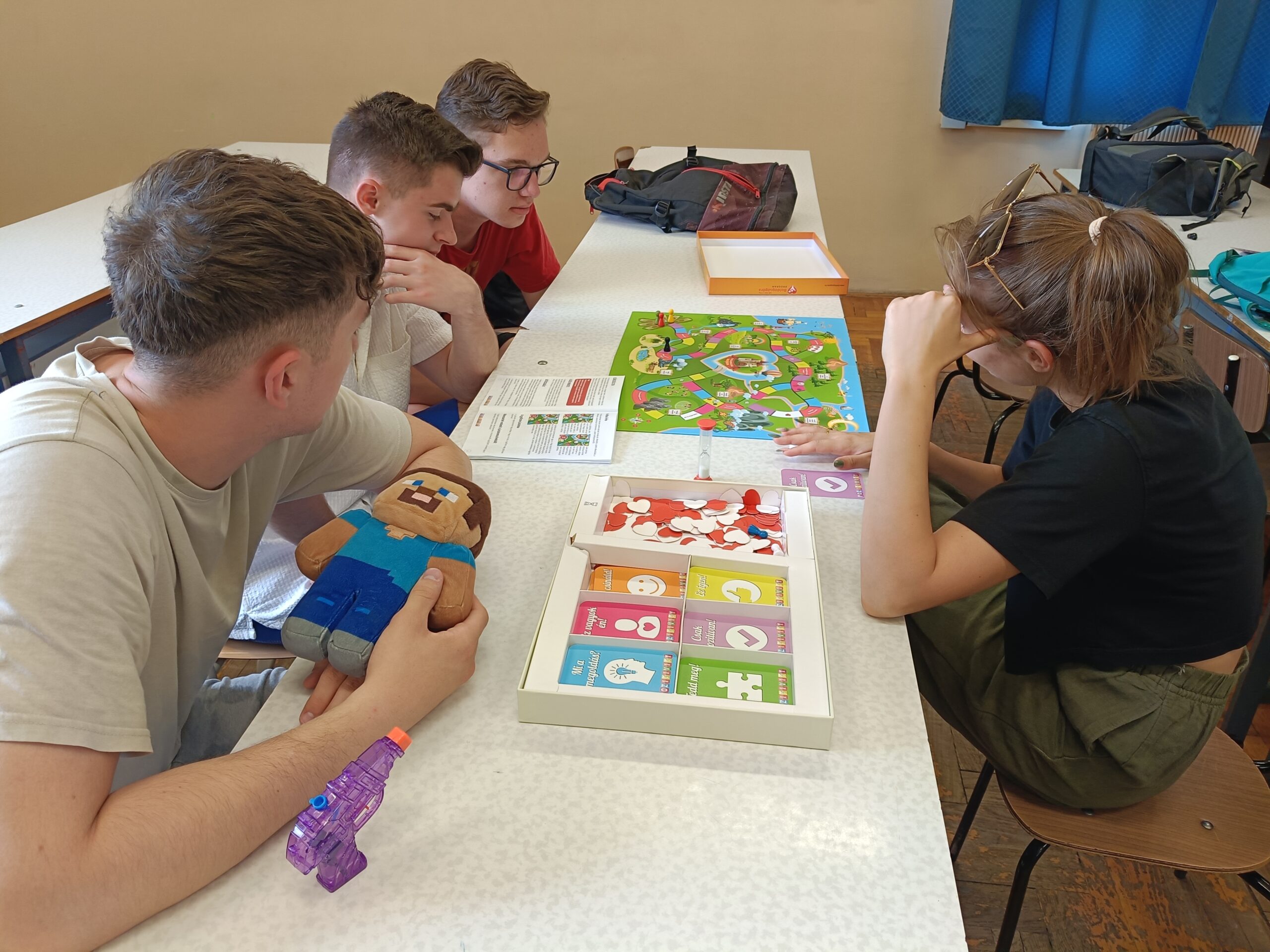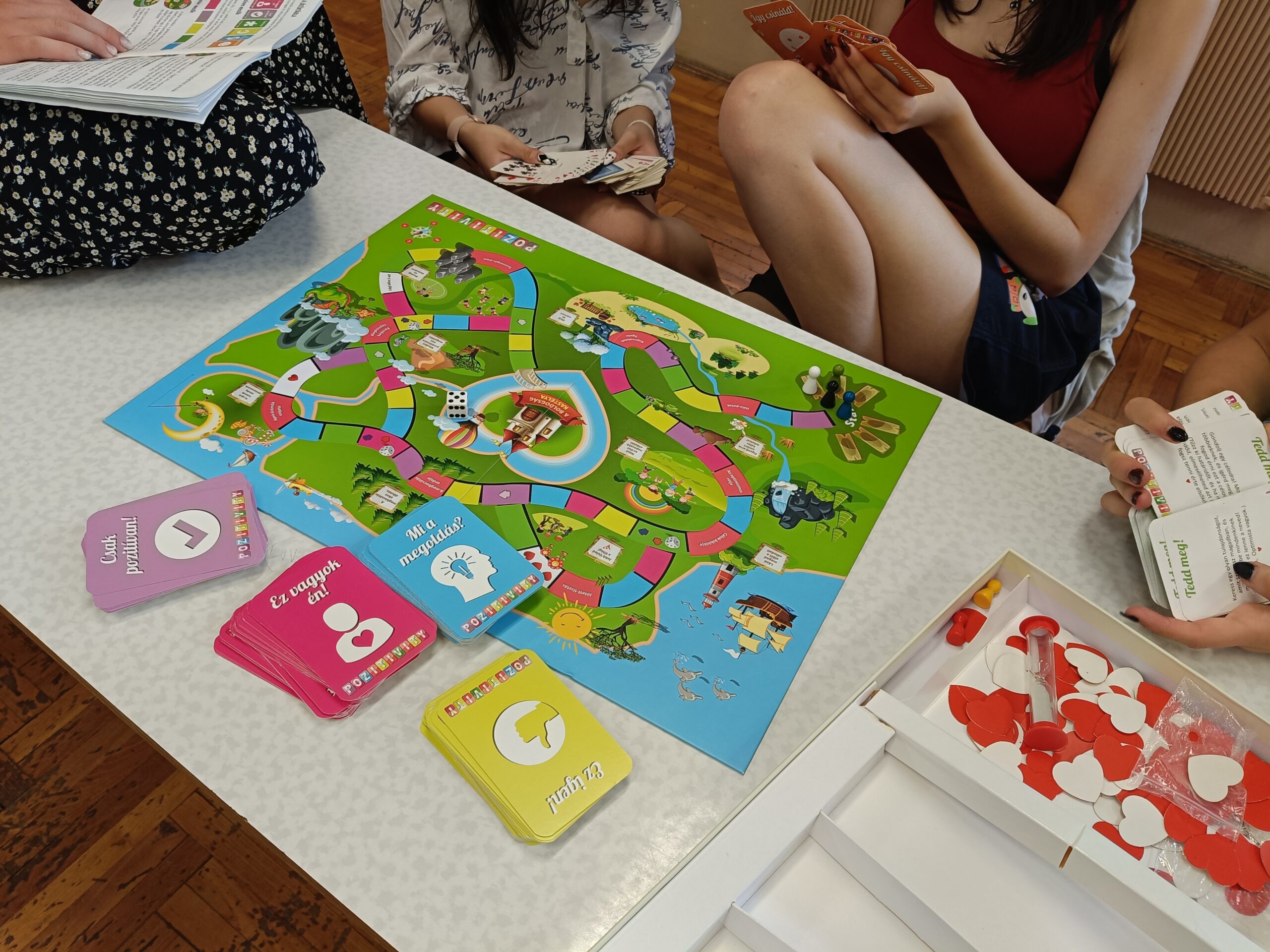 Az órára bevittük a Pozitivity társasjátékot, amit kisebb csoportokban kipróbálhattak a diákok. Nagyon elnyerte a tetszésüket, igazán jókedvre derültek a feladatok megoldása közben.