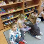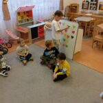 Hétfőn a reggeli körünket, mint mindig, simogatás körbeküldésével kezdtük, aztán oldalra fordulva megmasszíroztuk az előttünk ülő pajtásunk hátát a „Mit csinál a kis kezem?” kezdetű versikére, majd hátra fordulva viszonoztuk a kedveskedést. Mágnes táblára színes szíveket ragasztottam, minden színből kettő volt, erről lehetett választani. Az egyiket magukra, a másikat a barátjukra. Közben azt is elmondták, miért őt választották. Aztán székfoglalót játszottunk. A szabályt úgy módosítottam, hogy akinek nem jutott szék, az beleülhetett a pajtása ölébe. Nagy sikert aratott az új játék, lelkesen hívták pajtásaikat, hogy megmentsék a kieséstől.