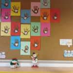 Csütörtökön barátság képet készítettünk. Puzzle darabokra rajzolták magukat a gyerekek, amiket kisebb csoportokba úgy lehetett összeilleszteni, ahogy barátkoztak. Nagy képet is készítettünk tenyérlenyomatokból, hiszen így együtt vagyunk a Maci csoport, így is összetartozunk.