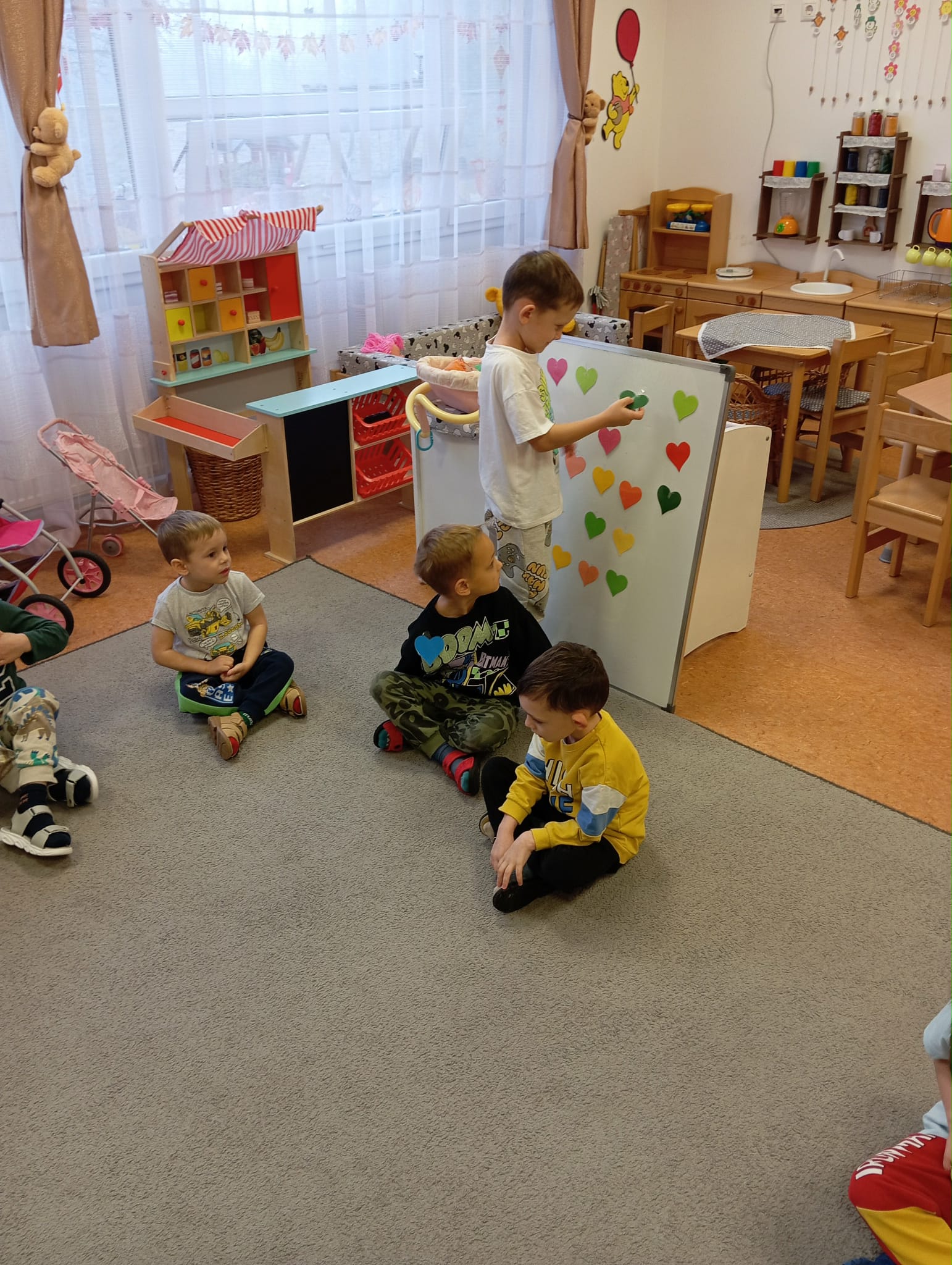 Hétfőn a reggeli körünket, mint mindig, simogatás körbeküldésével kezdtük, aztán oldalra fordulva megmasszíroztuk az előttünk ülő pajtásunk hátát a „Mit csinál a kis kezem?” kezdetű versikére, majd hátra fordulva viszonoztuk a kedveskedést. Mágnes táblára színes szíveket ragasztottam, minden színből kettő volt, erről lehetett választani. Az egyiket magukra, a másikat a barátjukra. Közben azt is elmondták, miért őt választották. Aztán székfoglalót játszottunk. A szabályt úgy módosítottam, hogy akinek nem jutott szék, az beleülhetett a pajtása ölébe. Nagy sikert aratott az új játék, lelkesen hívták pajtásaikat, hogy megmentsék a kieséstől.