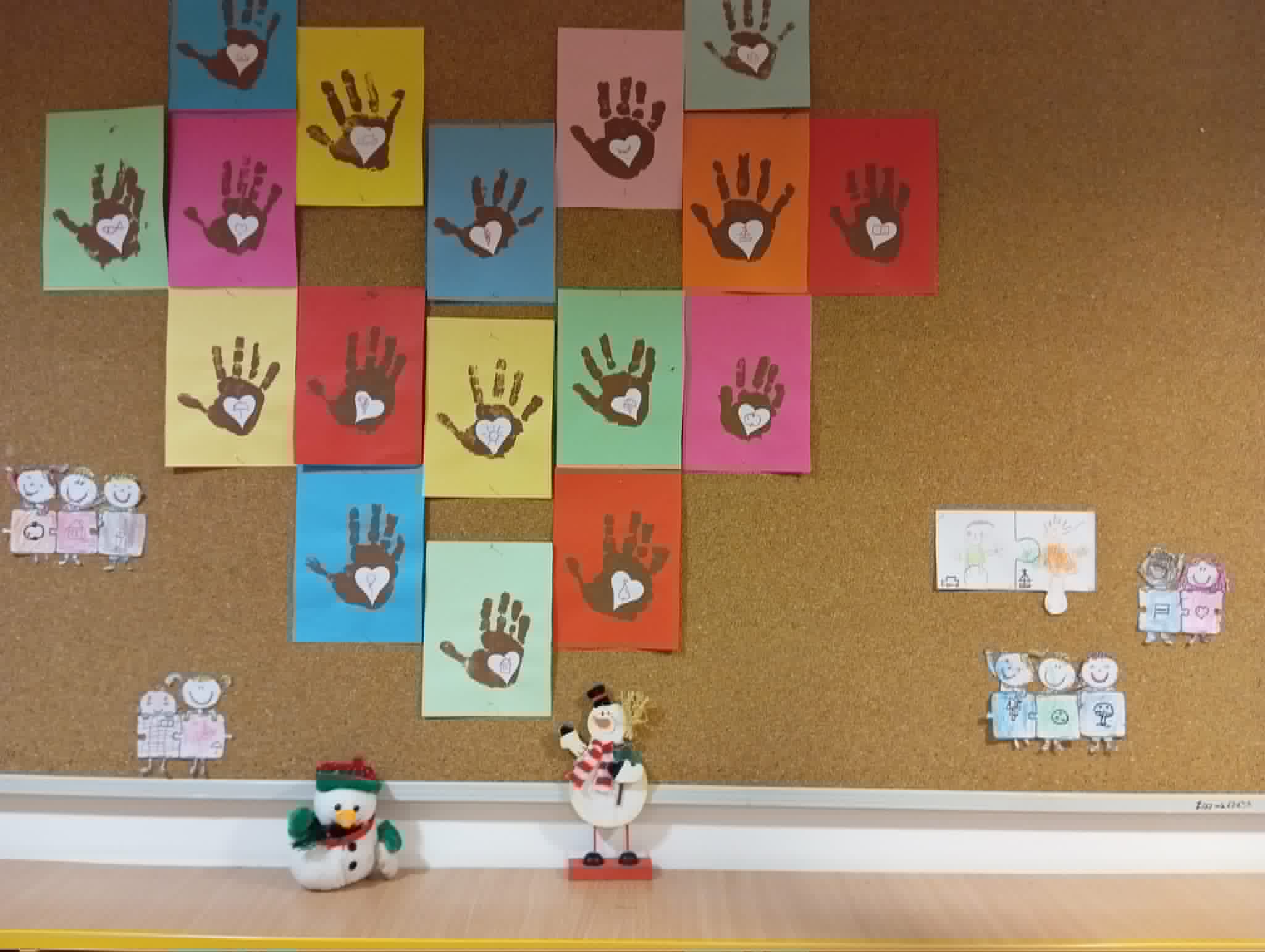 Csütörtökön barátság képet készítettünk. Puzzle darabokra rajzolták magukat a gyerekek, amiket kisebb csoportokba úgy lehetett összeilleszteni, ahogy barátkoztak. Nagy képet is készítettünk tenyérlenyomatokból, hiszen így együtt vagyunk a Maci csoport, így is összetartozunk.