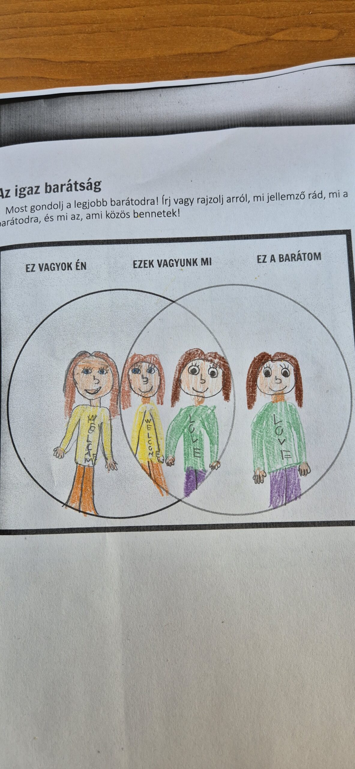 Minden héten tartunk boldogság órát. A hónap témája különösen fontos és jól körbejárható a gyerekek számára. Elsősorban a családtagok és barátok köré építettem a feladatokat. Interaktív bemutatással magyaráztam a fogalmakat. A gyerekek készítettek képregényt,melyen egy támogató cselekedetet jelenítettek meg. Készítettek halmazos feladatot, saját maguk, a társuk és kettőjük rajzával. Sokszor elénekeltük a hónap dalát. Az órai eleji játékok között volt a „melegzuhany” játék, amelyet nagyon szerettek a gyerekek.