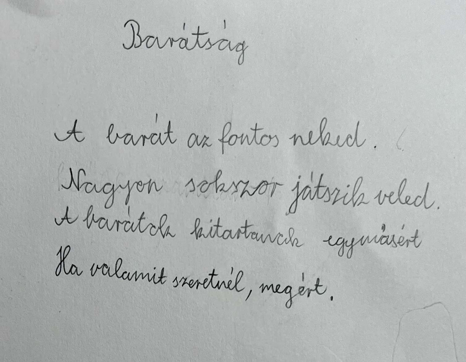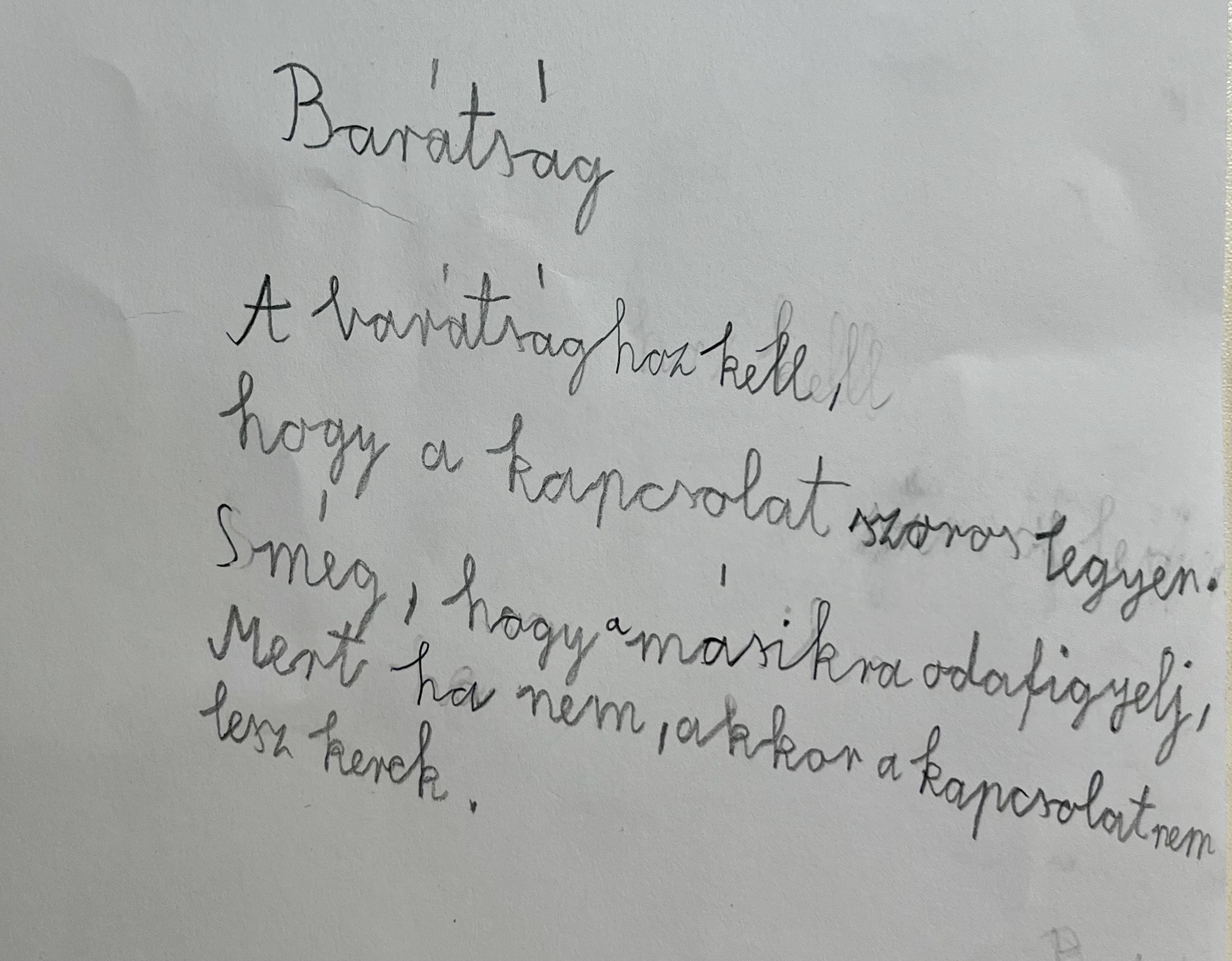 A novemberi hónapban a társas kapcsolatok ápolásával foglalkoztunk. Az első osztályosokkal páros munkában memóriakártyákkal együtt játszottunk. A harmadik osztályosok sztorikocka segítségével együtt alkottak egy közös történetet, amelyben az együtt gondolkodás, a fantázia, az egymás elfogadása és a kreativitás volt a fókuszban. Az elsősök megfogalmazták az 5 legfontosabb gondolatot a barátságról és ezt le is rajzolták egy barátságötösben. (Szeretet, együttműködés, egymás meghallgatása és elfogadása, humor és kedvesség). A harmadikosok verset írtak a barátságról. Nagyon jó hangulatban teltek az órák, hiszen mindenki az osztályban lévő barátjával együtt munkálkodhatott. Színes, vidám és értékes gondolatok fogalmazódtak meg a foglalkozásokon.