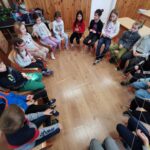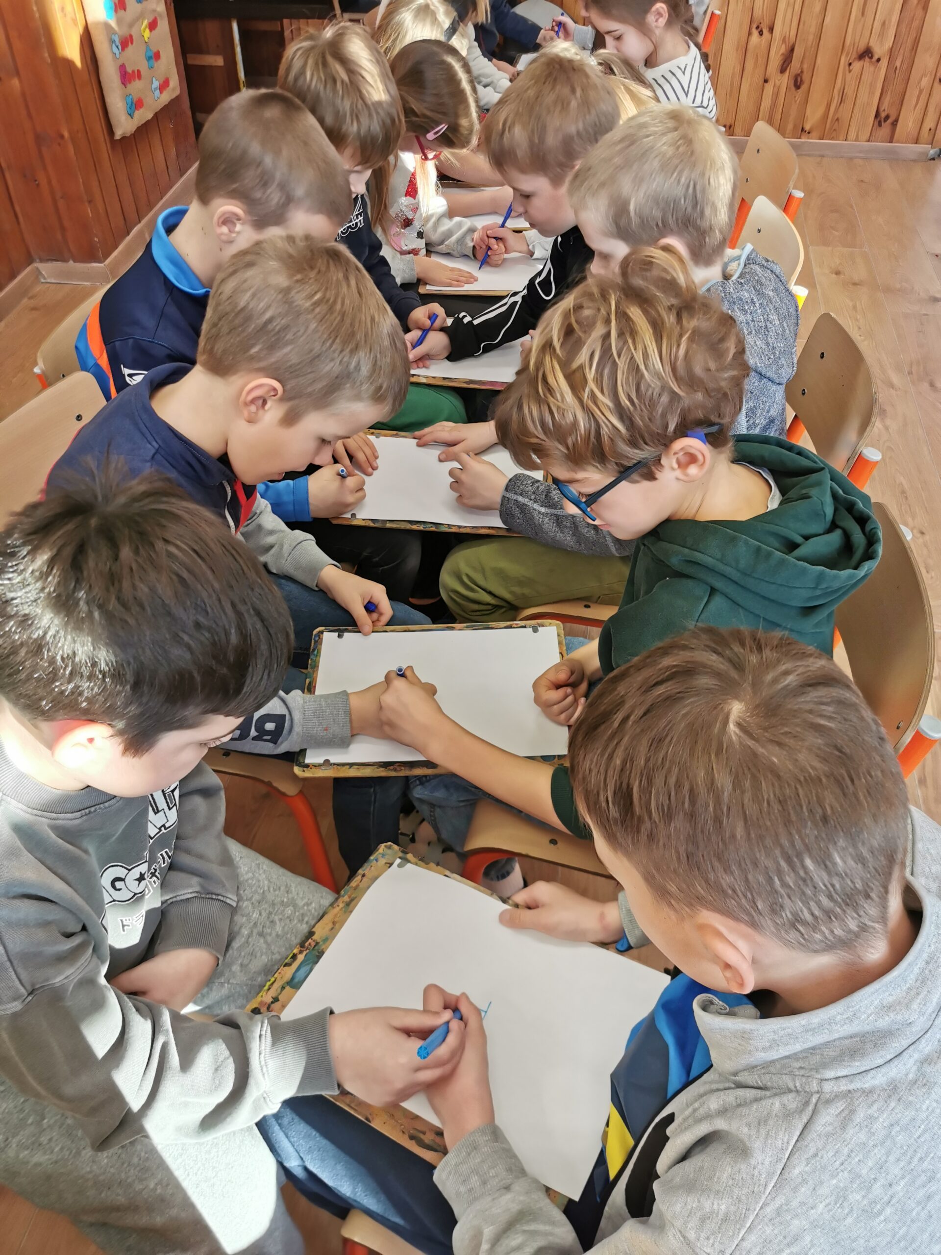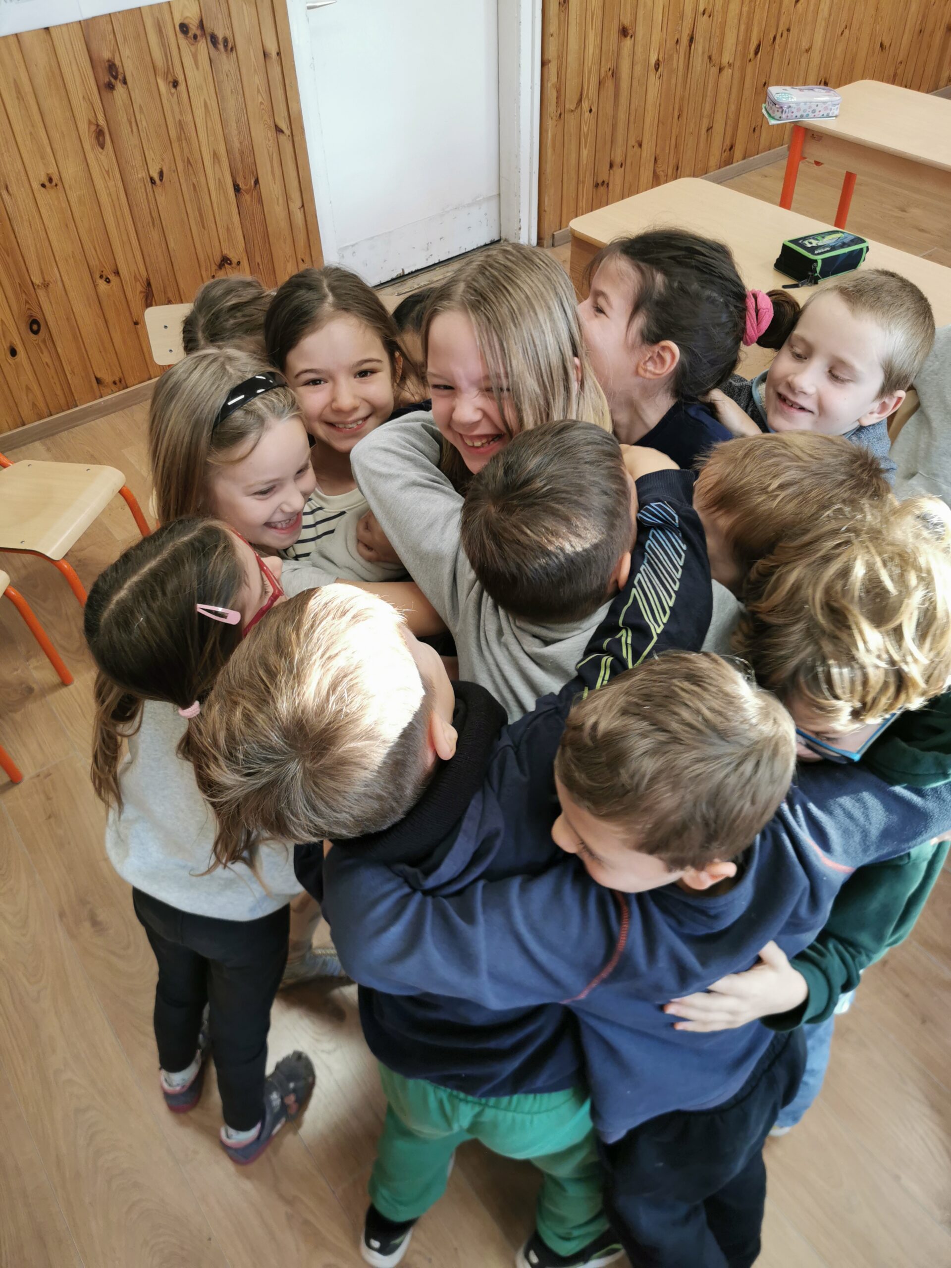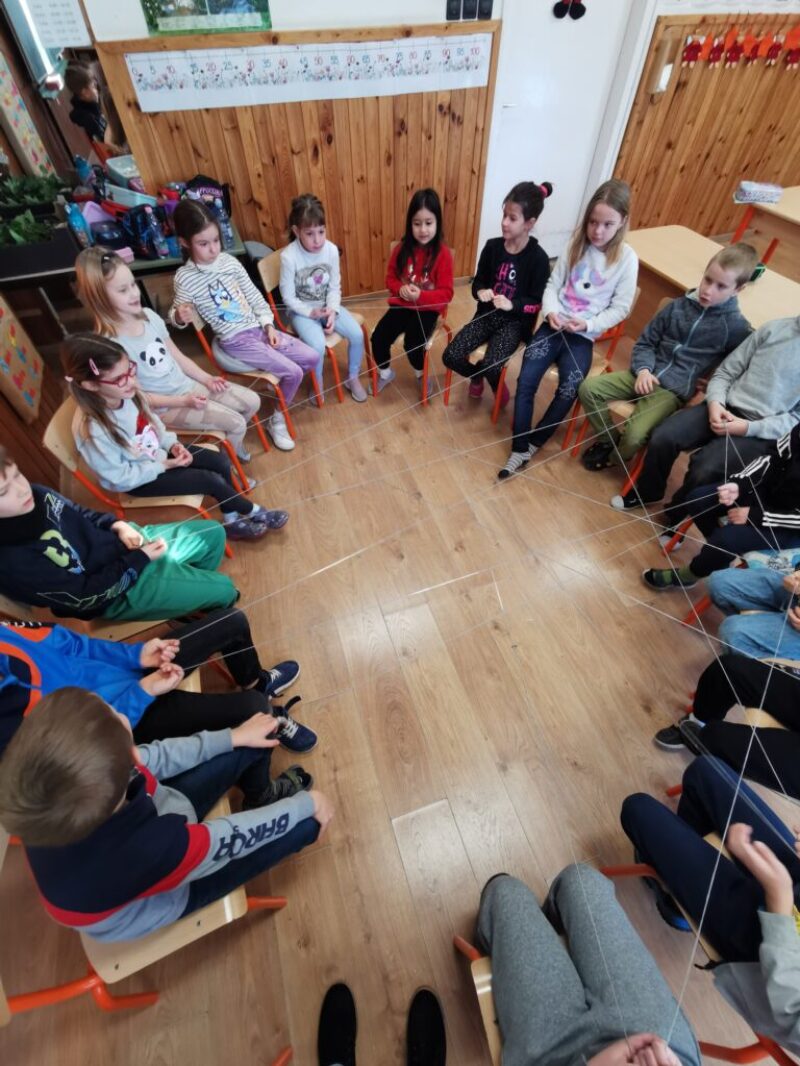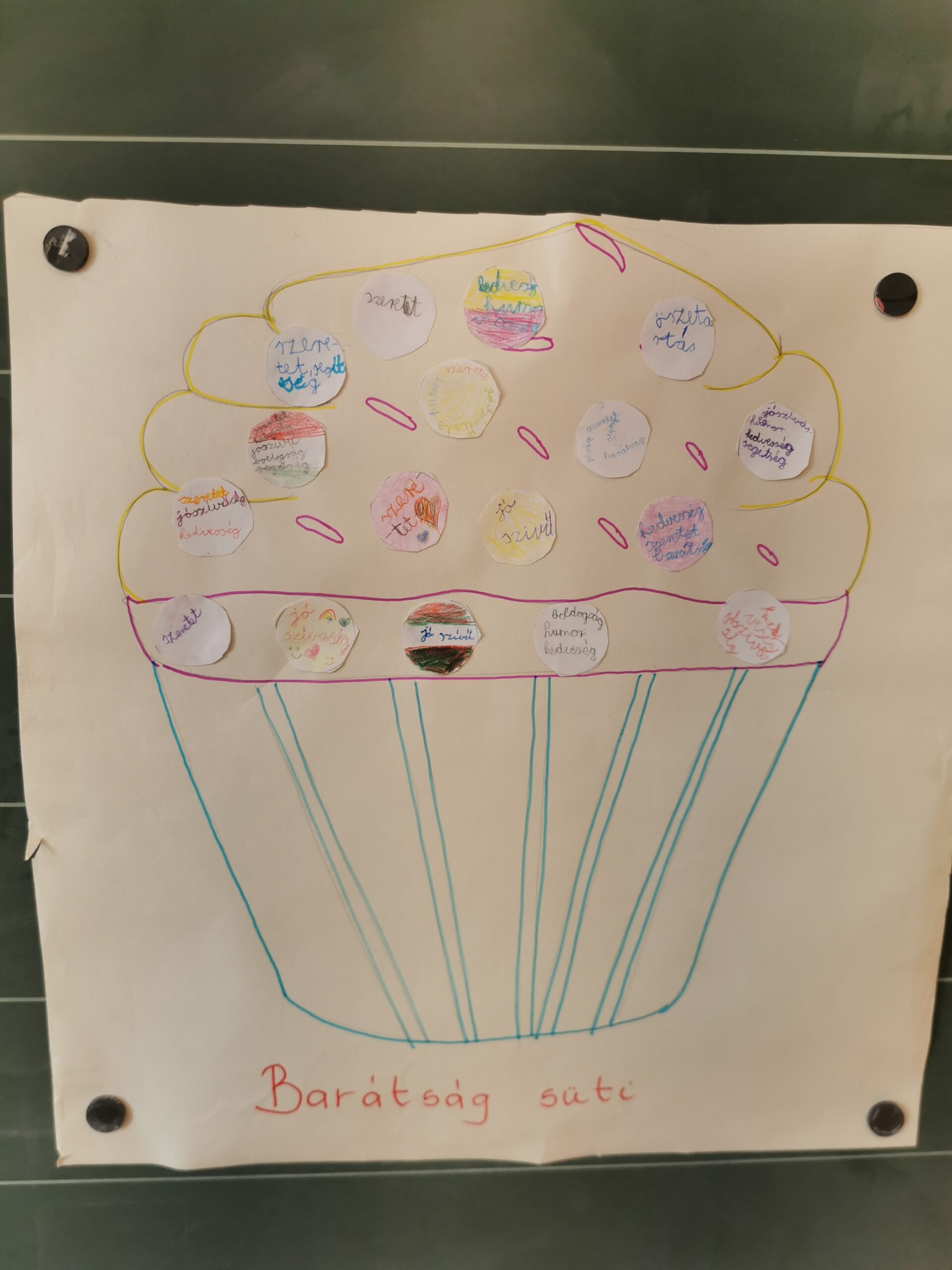 A boldogságórát relaxációval kezdtük, Bagdi Bella „Ellazulni jajj de jó” dala alapján. Majd megnéztük Bogyó és Babóca Barátság c. történetét. Beszélgettük a barátságról, mitől jó egy jó barátság. Képzeletben megsütöttük a Barátság sütinket, amihez összeszedtük a hozzávalókat, és egy muffin formára ragasztottuk a különböző ismérveket, hogy mi minden kell egy barátsághoz. Ezt követően elkészítettük a barátságpókhálót, amit nagyon élveztek a gyerekek. Egy kisgyereknek, akinek aznap nagy szüksége volt a figyelemre, szeretetet adtak a többiek hatalmas ölelés formájában. Az óra végén játszottunk egyet, mindenki a barátjával párba állt/ült és közösen, egymásra figyelve 1 filctoll segítségével kellett rajzolniuk. Megbeszéltük, hogy olykor segítjük, olykor támaszkodunk a barátunkra. Ez a feladat nagyon jól tükrözte ezt.