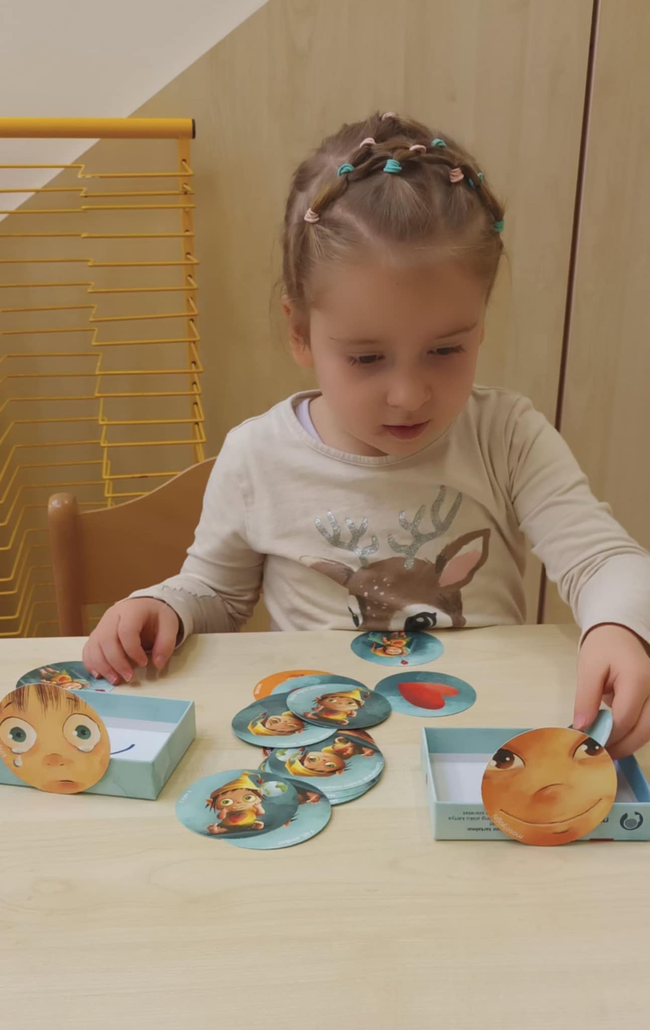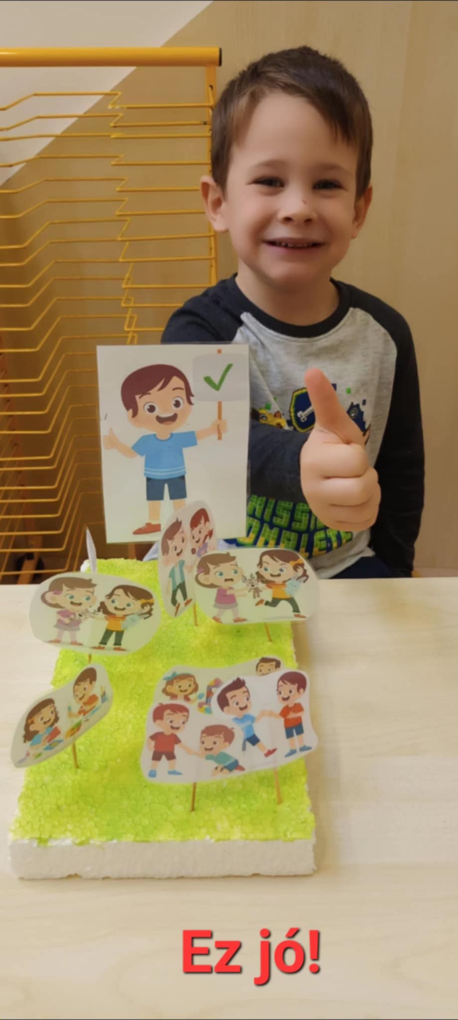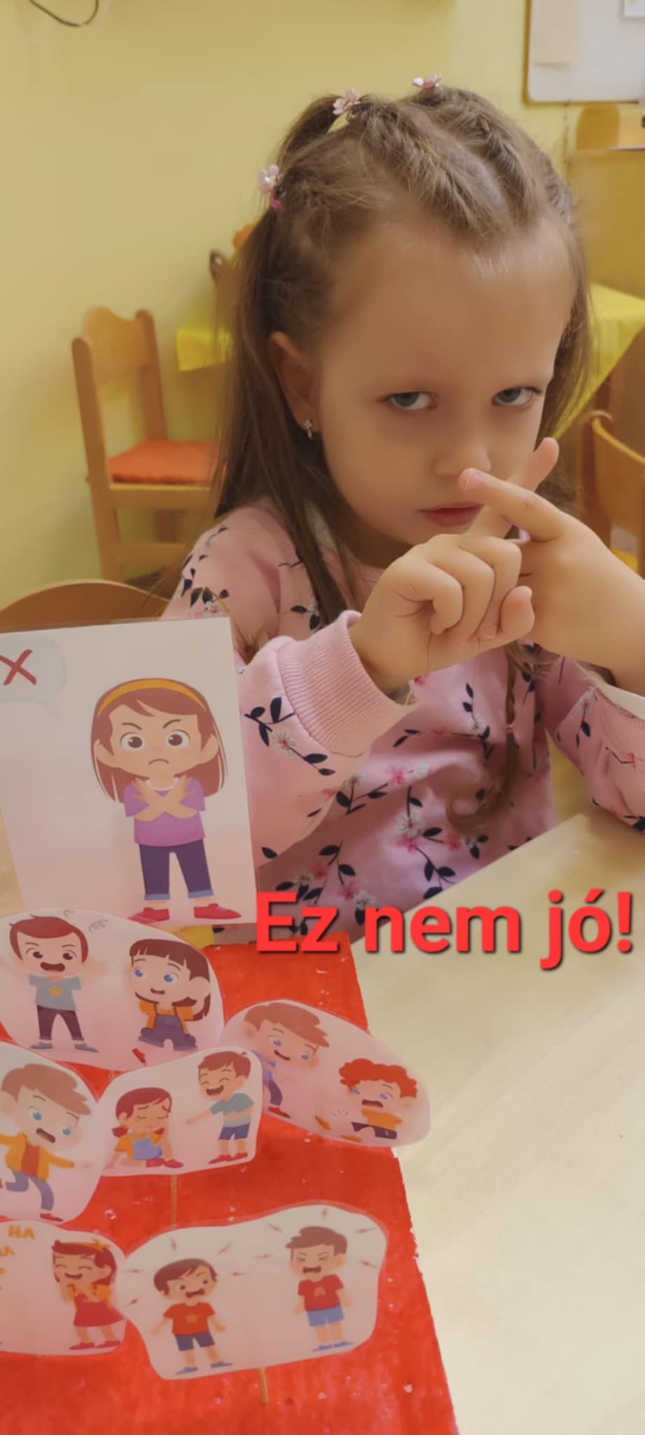 Saját készítésű fejlesztő játékokat vittem be a csoportba, ahol a társas kapcsolatok szabályai kerültek fókuszba, emellett az alap érzelmek, mint a harag, szomorúság, vidámság is helyet kapott.
