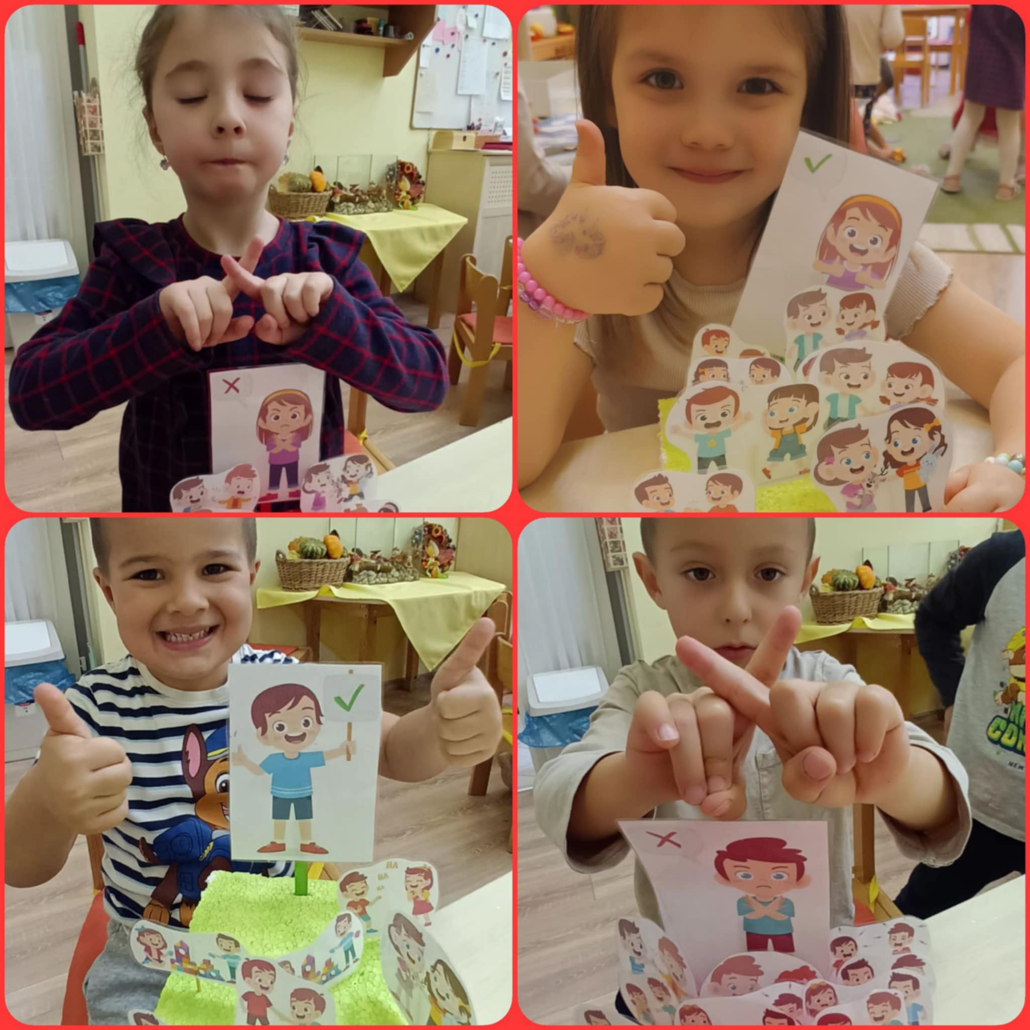 Megbeszéltük, hogy egy barátságban milyen a jó barát. Mit kell tenni, ha összevesznek. Bábjátékkal ráerősítettem a témára, ahol Boldog Dóra játékát elveszi Vili és ezen összevesznek. Békülős varázslásokat is tanultunk, illetve barátságjavító gépeket építettünk. De a legfontosabb az, hogy ismerjük fel, mi a jó és mi nem számunkra. Képek alapján felismertettem velük azt, hogy mit ne tűrjünk el egy kapcsolatban. Ezt kézjellel is megtanultuk, melyet a mai napig hatékonyan alkalmazunk csoportomban és otthon is.