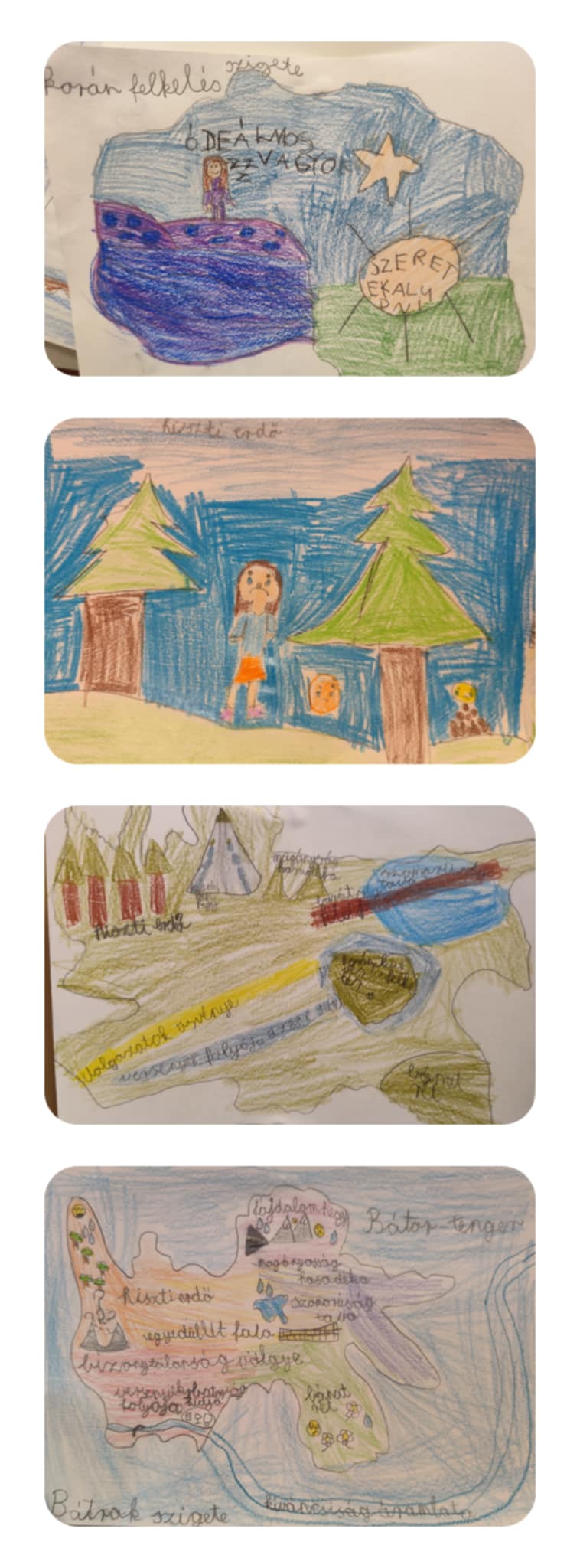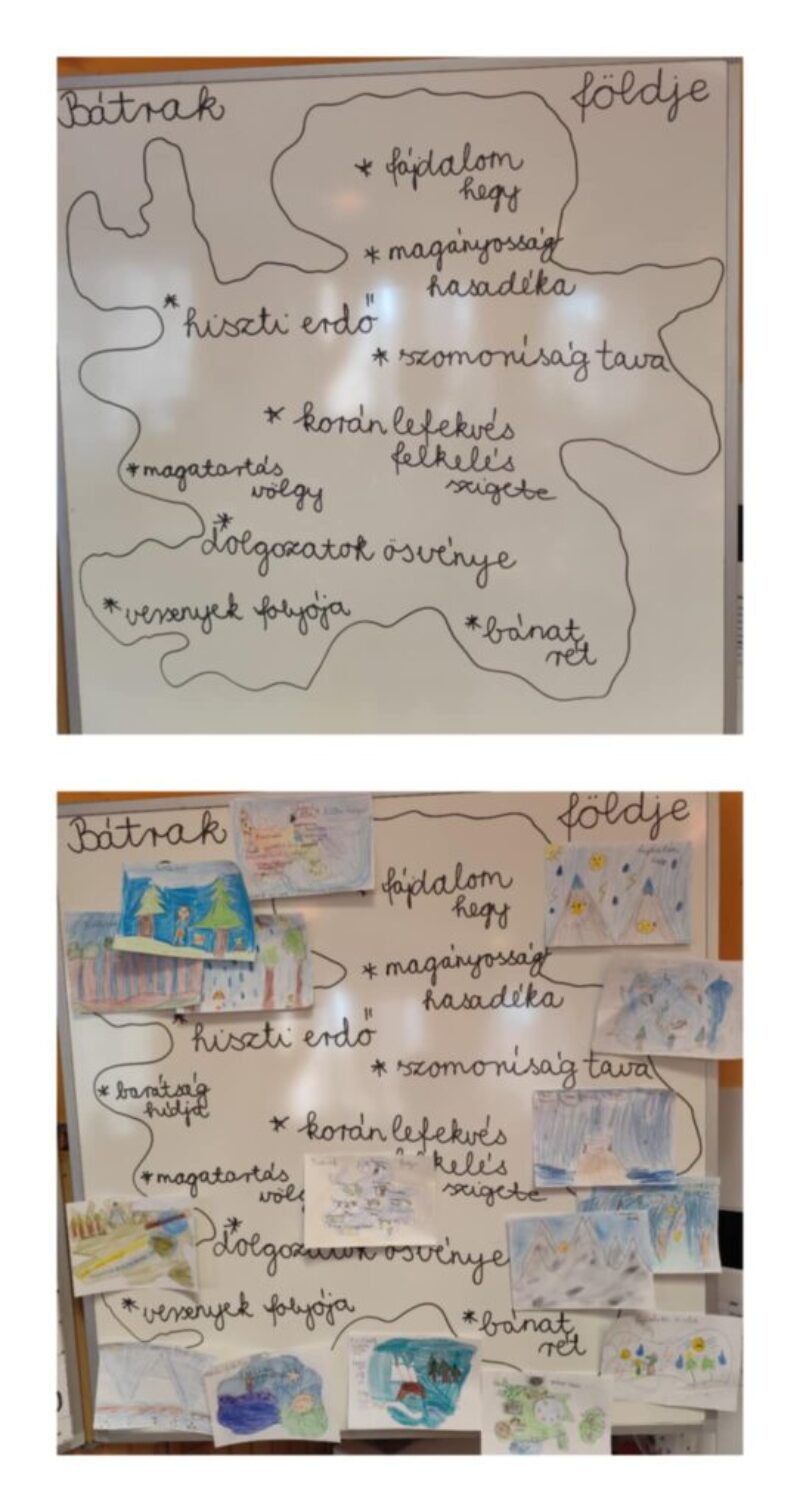 Ezt követően közösen átgondoltuk, hogy egy második osztályos gyermek milyen nehézségekkel találkozhat a mindennapokban. Elkészítettük a „Bátrak Földjét”, egy képzeletbeli, különleges szigetet. A gyermekek különböző helyszíneket terveztek a térképre, amelyek egy-egy kihívást és annak leküzdését jelképezték. Így született meg a „Fájdalom hegye”, a „Magány hasadéka”, a „Hiszti erdő”, a „Szomorúság tava”, a „Dolgozatok ösvénye”, a „Bánat rétje” és a „Versenyek folyója”.