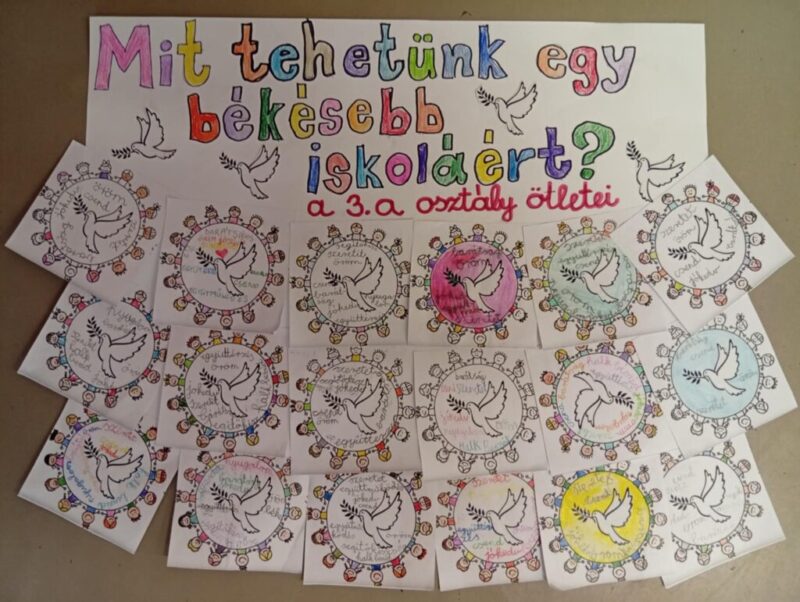 Január elején, az újévi fogadalmak idején, a szünet utáni találkozásunkkor a gyerekek a béke szimbóluma (fehér galamb olajággal a csőrében) köré összegyűjtötték azokat a fogalmakat, amelyekkel ők maguk is hozzá tudnak járulni a nyugodt, békés iskolai légkör megteremtéséhez, fenntartásához. A fogalmak összegyűjtése közösen történt, de a szimbólum köré már mindenki egyénileg válogatta ki azokat, amelyekkel legjobban azonosulni tudott, és célként tűzött ki maga elé.