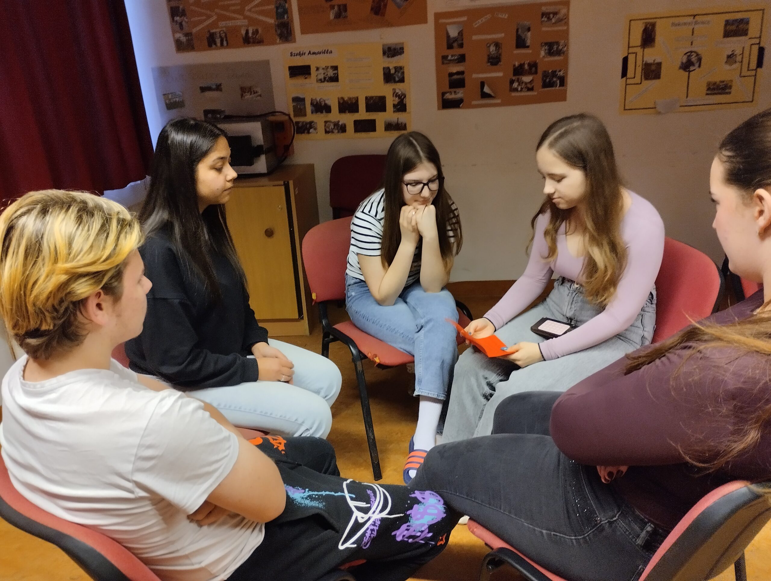 Fontos számomra, hogy a Boldogságóra célirányos, elméleti része se maradjon háttérben. A relaxációs gyakorlatok és a szilenciumok előtti mesék segítették a gyerekeket a lecsendesedésben, a belső feszültségek oldásában és az érzelmi feltöltődésben. Ezek az alkalmak lehetőséget teremtettek arra, hogy a gyerekek megtapasztalják: a megnyugvás, az önmagunkra figyelés és a tudatos jelenlét hatékony megküzdési eszköz lehet a mindennapi kihívások során. A „A belső erőnk nyomában” című foglalkozás során drámai elemekkel különböző nehéz élethelyzeteket jelenítettek meg, majd közösen kerestek rájuk megoldást. A szerepjáték, a közös beszélgetések és a kiscsoportos munka lehetőséget adott az empátia gyakorlására, a nézőpontváltásra és arra, hogy biztonságos közegben próbálják ki különböző megküzdési stratégiáikat.