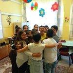 A hónap dalának meghallgatása után 4 csoportban dolgoztunk. Az első csoport boldogságkoktélt készített. A 2. csoportban a gyerekek pozitív fogalmakat gyűjtöttek az ábécé betűivel. A harmadikban az volt a gyerekek feladata, hogy vagy rajzban kifejezve, vagy szavakat felírva gyűjtsék össze, hogy mit tettek ez évben annak érdekében, hogy boldogok legyenek. A negyedik csapat pedig örömbingót játszott. A foglalkozás egész ideje alatt volt egy közös feladat. Az üres aztalra tettem egy üres lapot és filctollakat. Az osztály valamelyik közös élményének a megalkotása volt a feladat.A szabály a következő volt: beszélni nem lehetett, egyszerre csak egy ember tartózkodhatott az asztalnál, s mindenki csak egy dolgot rajzolhatott.( A képeknél feltöltöm a közös alkotást). Az órát szeretetgombóccal zártuk.