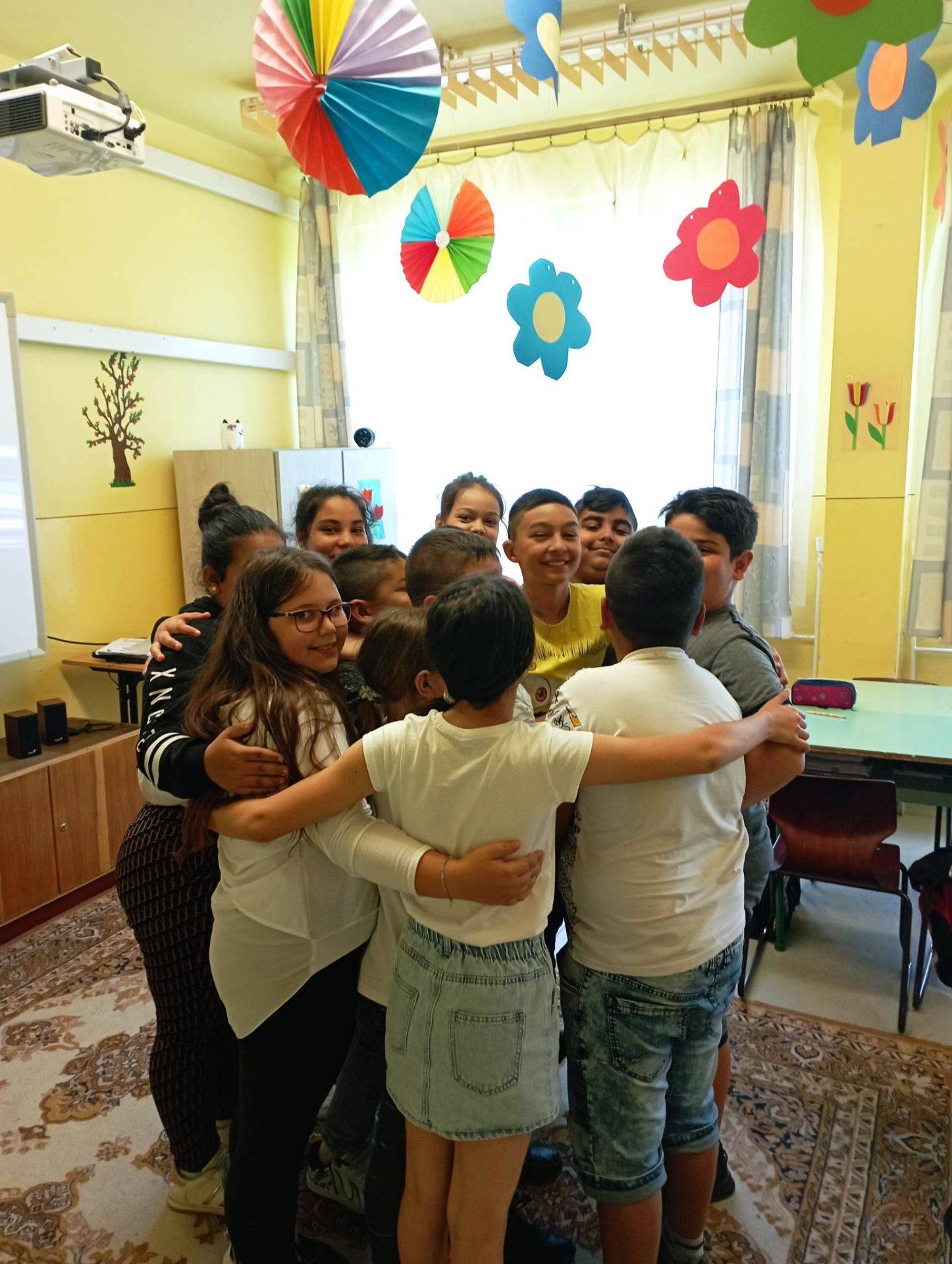 A hónap dalának meghallgatása után 4 csoportban dolgoztunk. Az első csoport boldogságkoktélt készített. A 2. csoportban a gyerekek pozitív fogalmakat gyűjtöttek az ábécé betűivel. A harmadikban az volt a gyerekek feladata, hogy vagy rajzban kifejezve, vagy szavakat felírva gyűjtsék össze, hogy mit tettek ez évben annak érdekében, hogy boldogok legyenek. A negyedik csapat pedig örömbingót játszott. A foglalkozás egész ideje alatt volt egy közös feladat. Az üres aztalra tettem egy üres lapot és filctollakat. Az osztály valamelyik közös élményének a megalkotása volt a feladat.A szabály a következő volt: beszélni nem lehetett, egyszerre csak egy ember tartózkodhatott az asztalnál, s mindenki csak egy dolgot rajzolhatott.( A képeknél feltöltöm a közös alkotást). Az órát szeretetgombóccal zártuk.