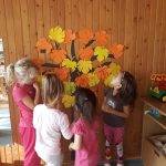 ( Világomban minden…). Zárt körben helyezkedtünk el, hogy érezzék az együttlét fontosságát. Példatörténettel, ötletekkel és saját példával érzékeltettem, mit is jelent hálásnak lenni valamiért, majd a gyerekek mondhatták el sorban, kinek szeretnének köszönetet mondani. Ez után őszi leveleket adtunk körbe egymásnak, míg szólt a zene. Az asztalnál minden kisgyerek lerajzolhatta azt a dolgot, amiért hálás valakinek. A foglalkozás lezárásaként a levelekből egy hálafa készült, amit azóta is szívesen „látogatnak”, nézegetnek.