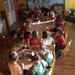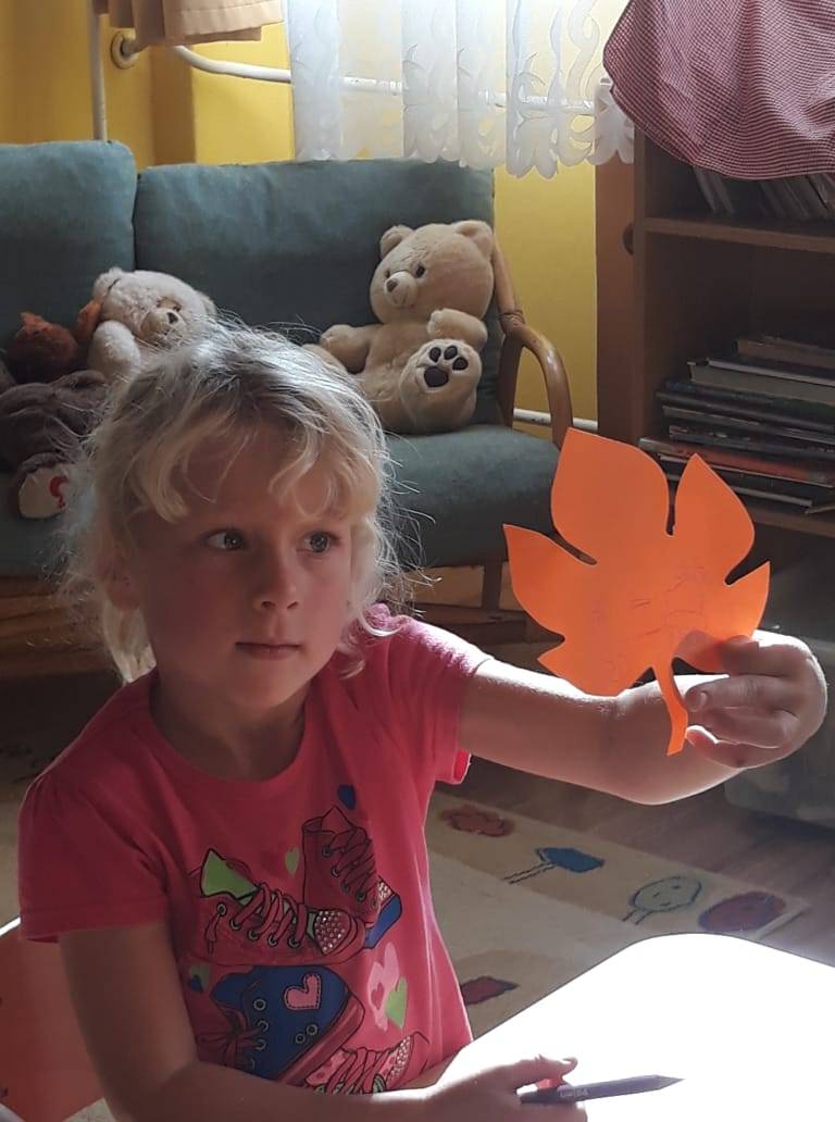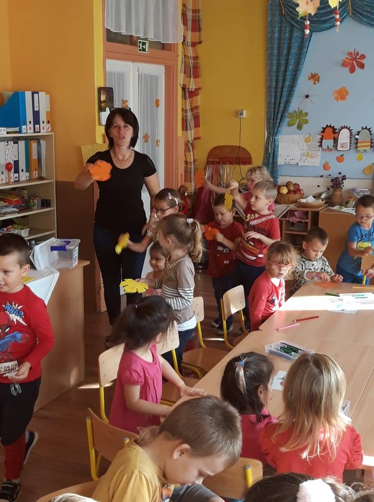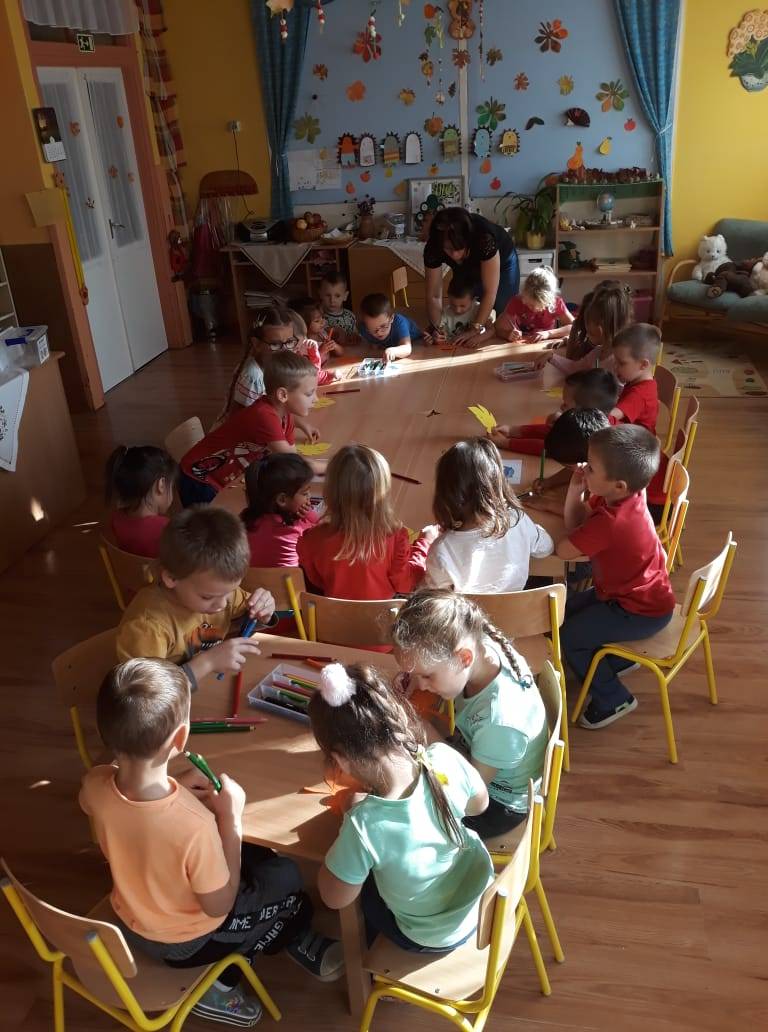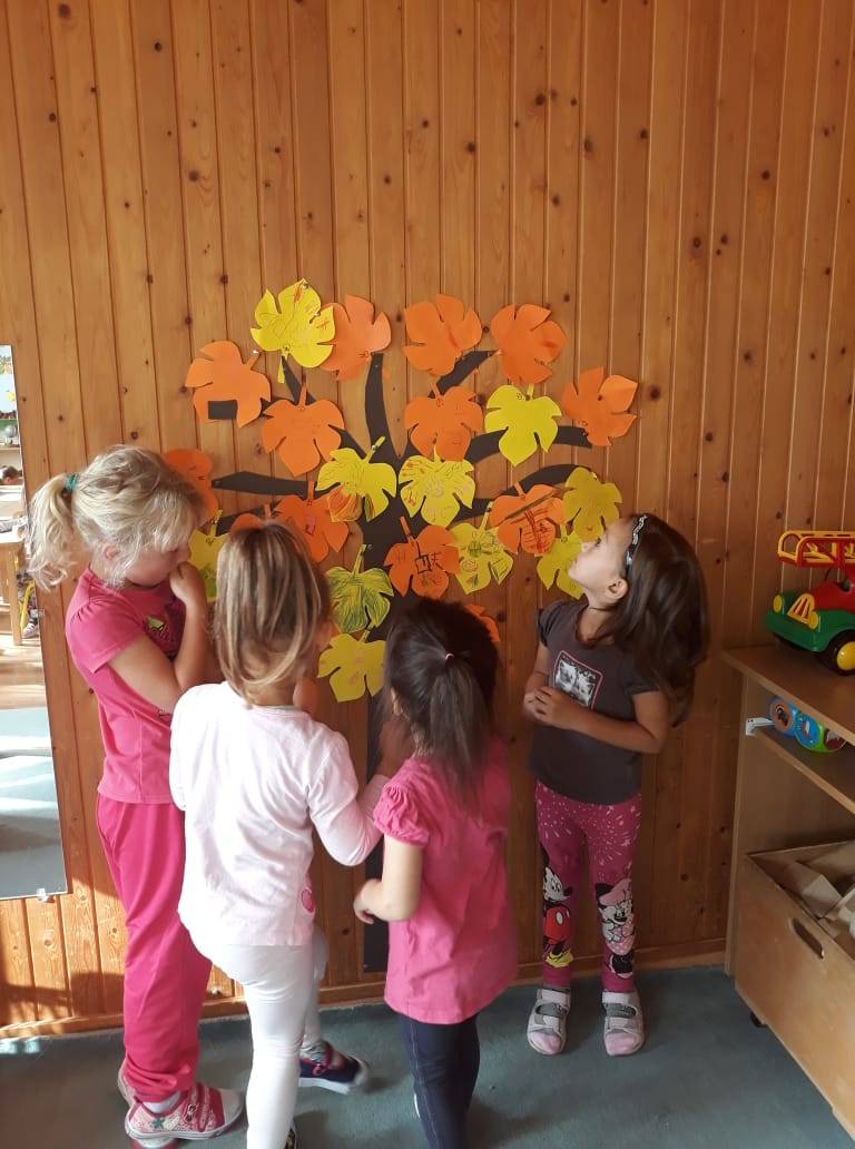 ( Világomban minden…). Zárt körben helyezkedtünk el, hogy érezzék az együttlét fontosságát. Példatörténettel, ötletekkel és saját példával érzékeltettem, mit is jelent hálásnak lenni valamiért, majd a gyerekek mondhatták el sorban, kinek szeretnének köszönetet mondani. Ez után őszi leveleket adtunk körbe egymásnak, míg szólt a zene. Az asztalnál minden kisgyerek lerajzolhatta azt a dolgot, amiért hálás valakinek. A foglalkozás lezárásaként a levelekből egy hálafa készült, amit azóta is szívesen „látogatnak”, nézegetnek.