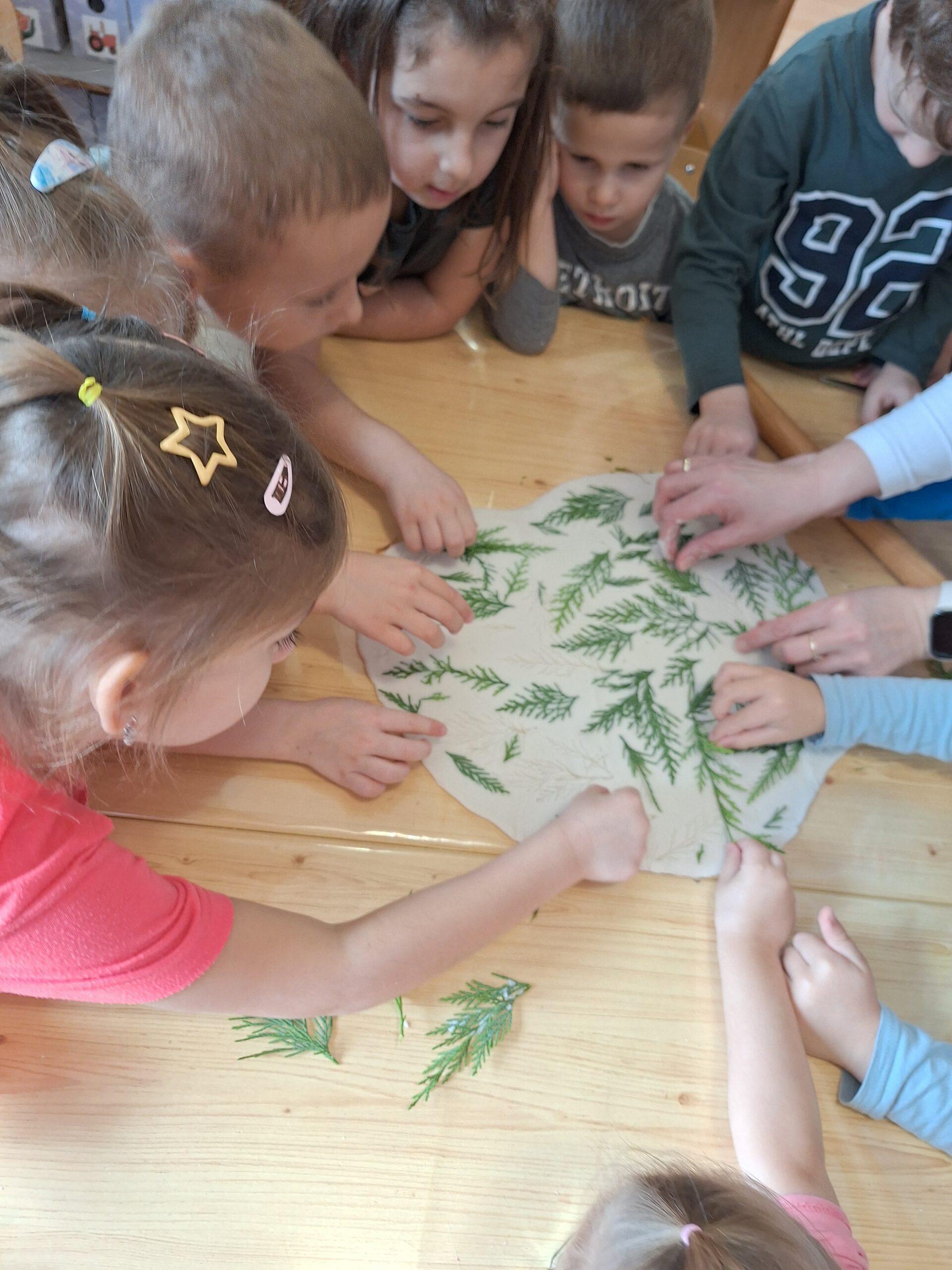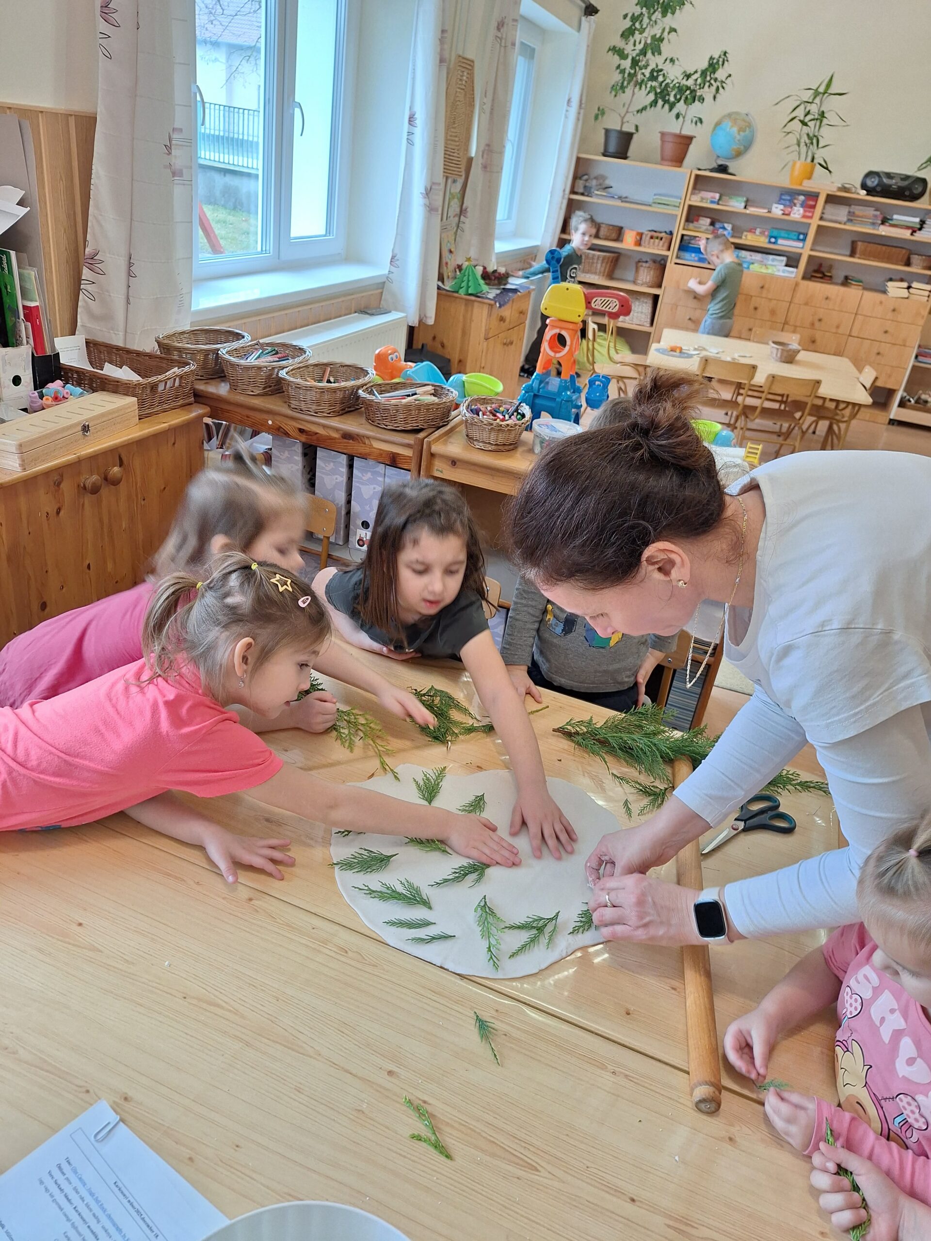 Eszközök: Porcelángyurma alapanyagai, fenyő- tujaág, tálak, sodrófa, és deszka, indukciós főzőlap.