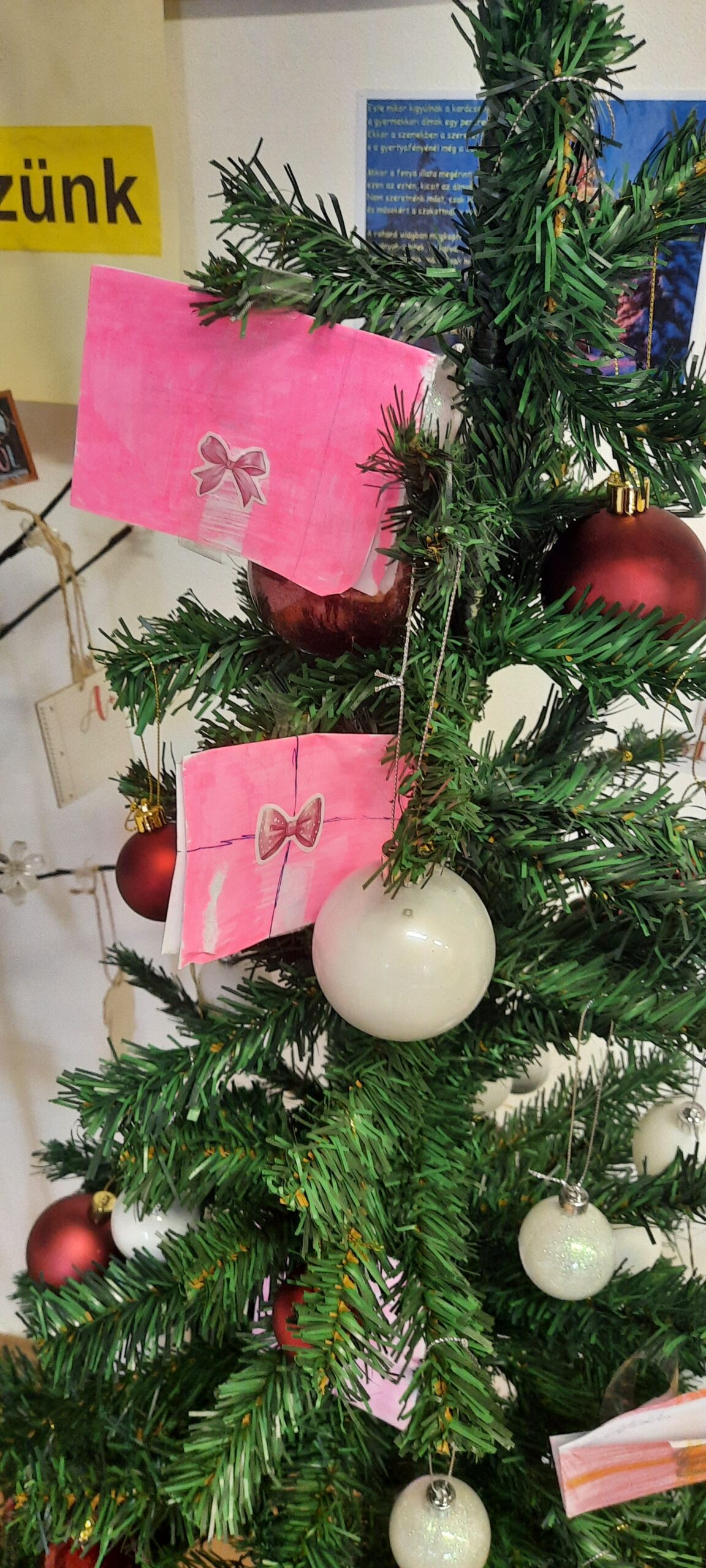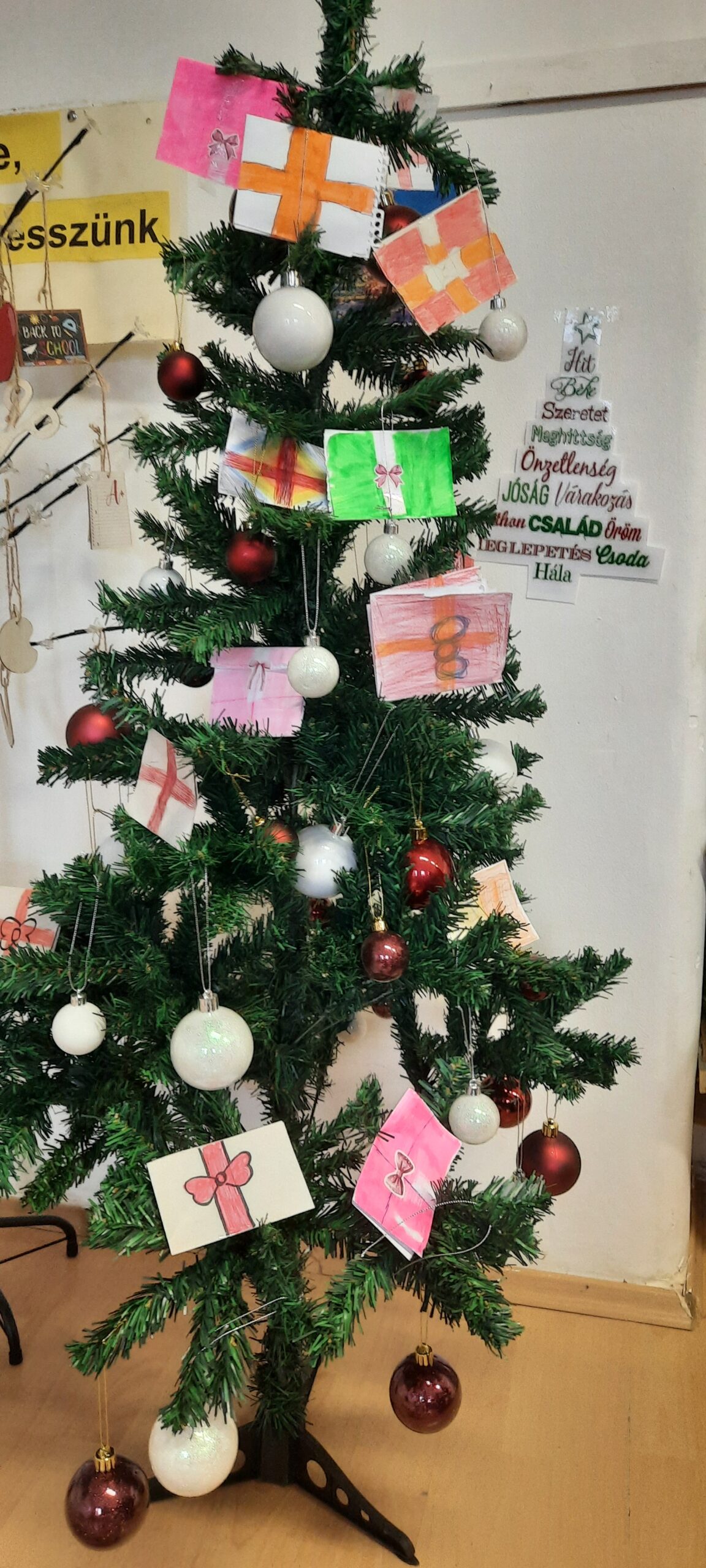 Ezt a vállalást ráírták egy lapra, melyet ajándék formára díszítettek és az osztály karácsonyfájára tűztek!