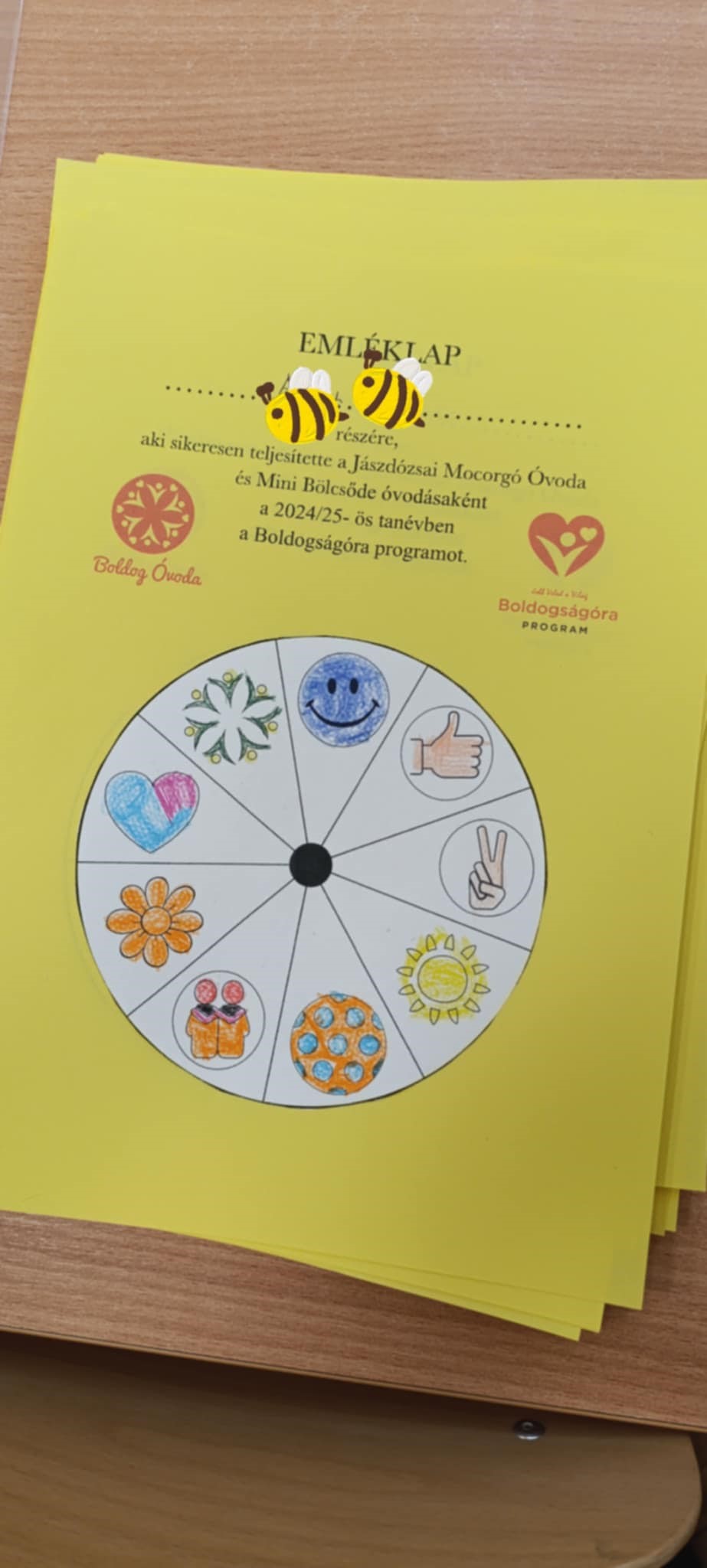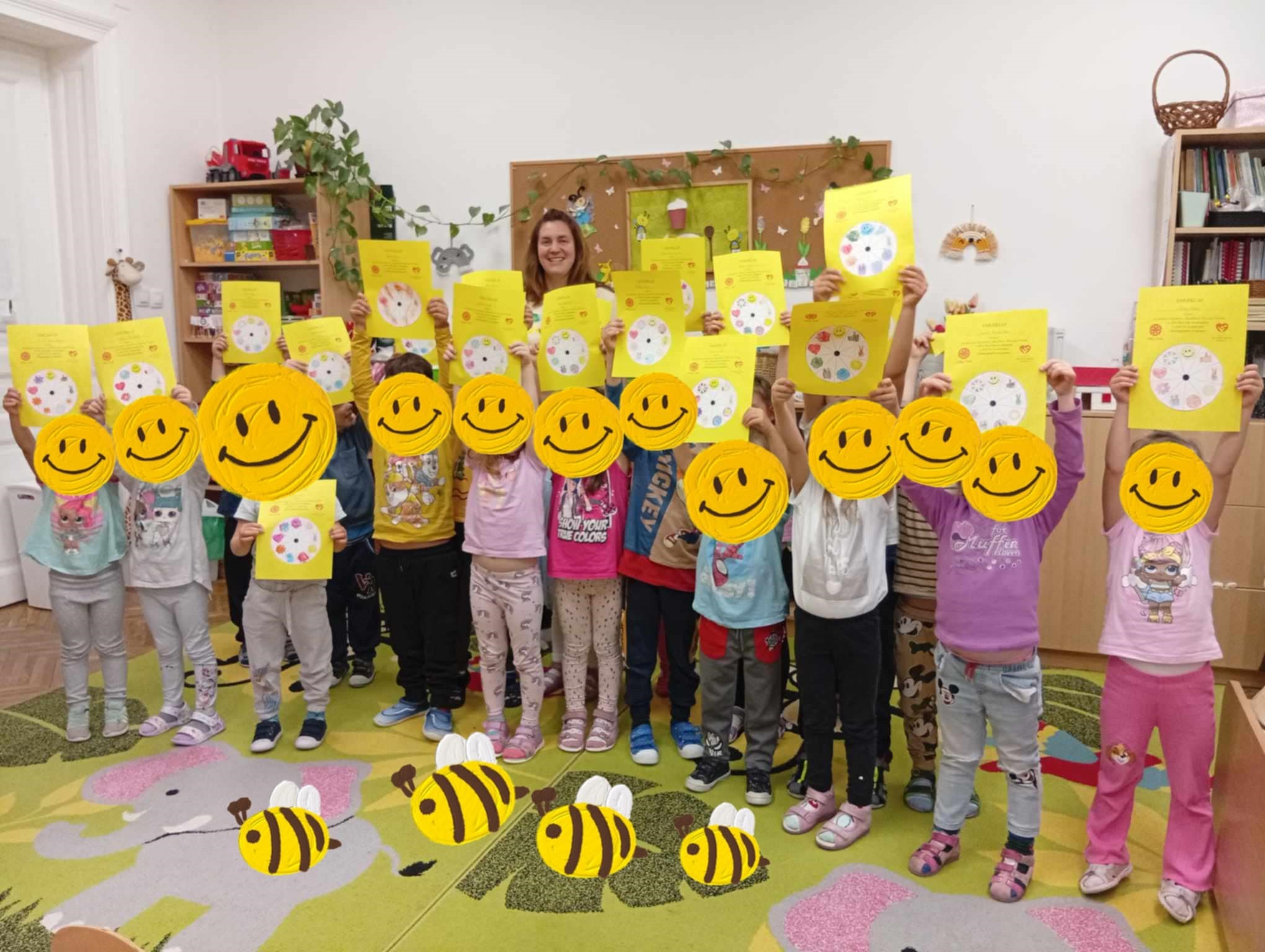 A Méhecskés gyerekekkel végig vettük a Boldogság várába vezető lépcsőfokok jeleit és témáit. Képeket vetítve felidéztük, mikről is beszélgettünk az idei Boldogságórákon. A havi témák kis ikonjait kiszínezhették és mindenki emléklapot kapott a tanév végén. Volt lufis páros játék a gyerekek kívánságára a kedvenc Bagdi Bella dalukra. Hooponoopooztunk, hullámoztunk, tengerparti partit varázsoltunk a csoportszobánkba. A legfontosabbat megtanultuk, hogy a boldogság bennünk van!