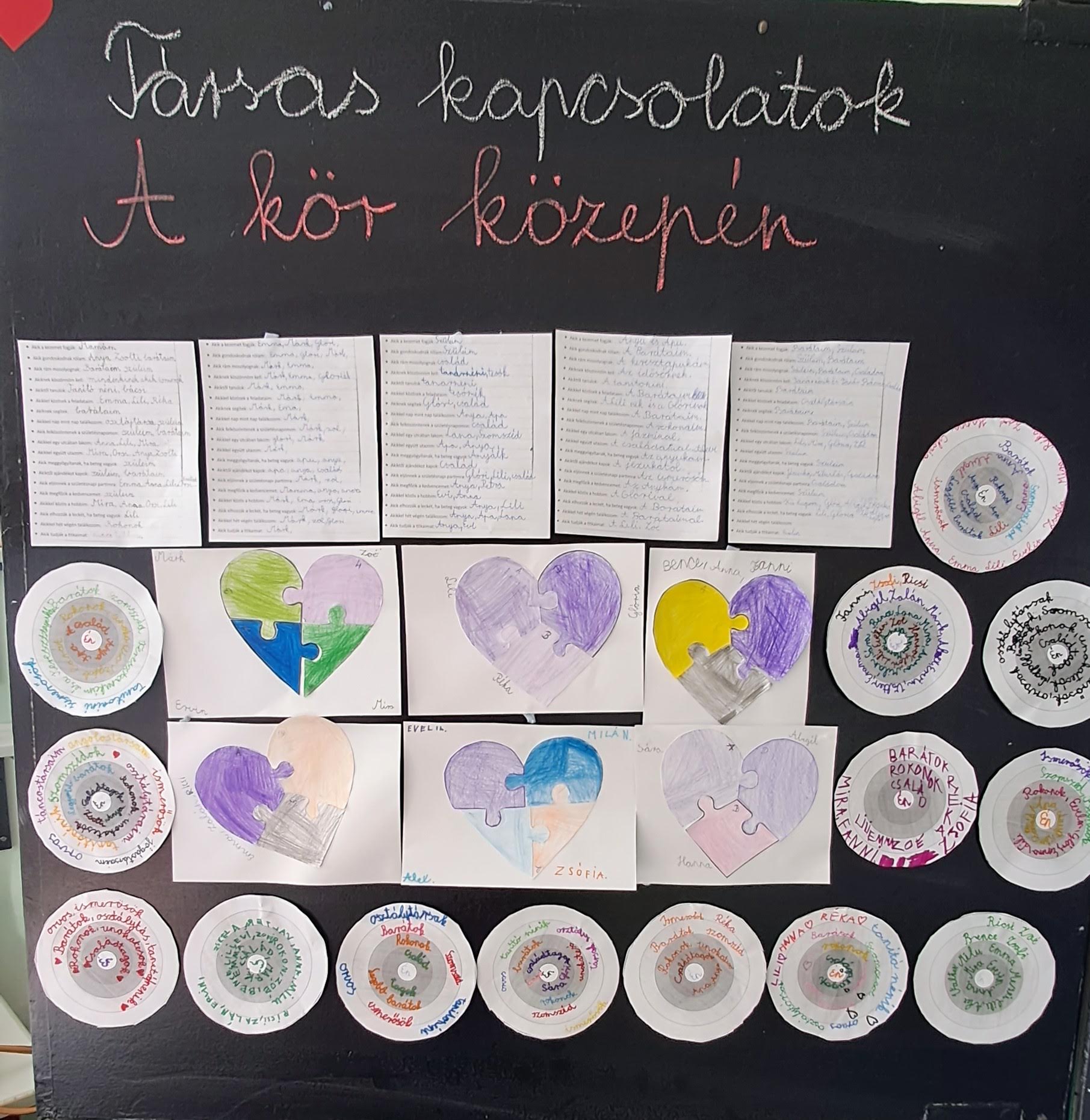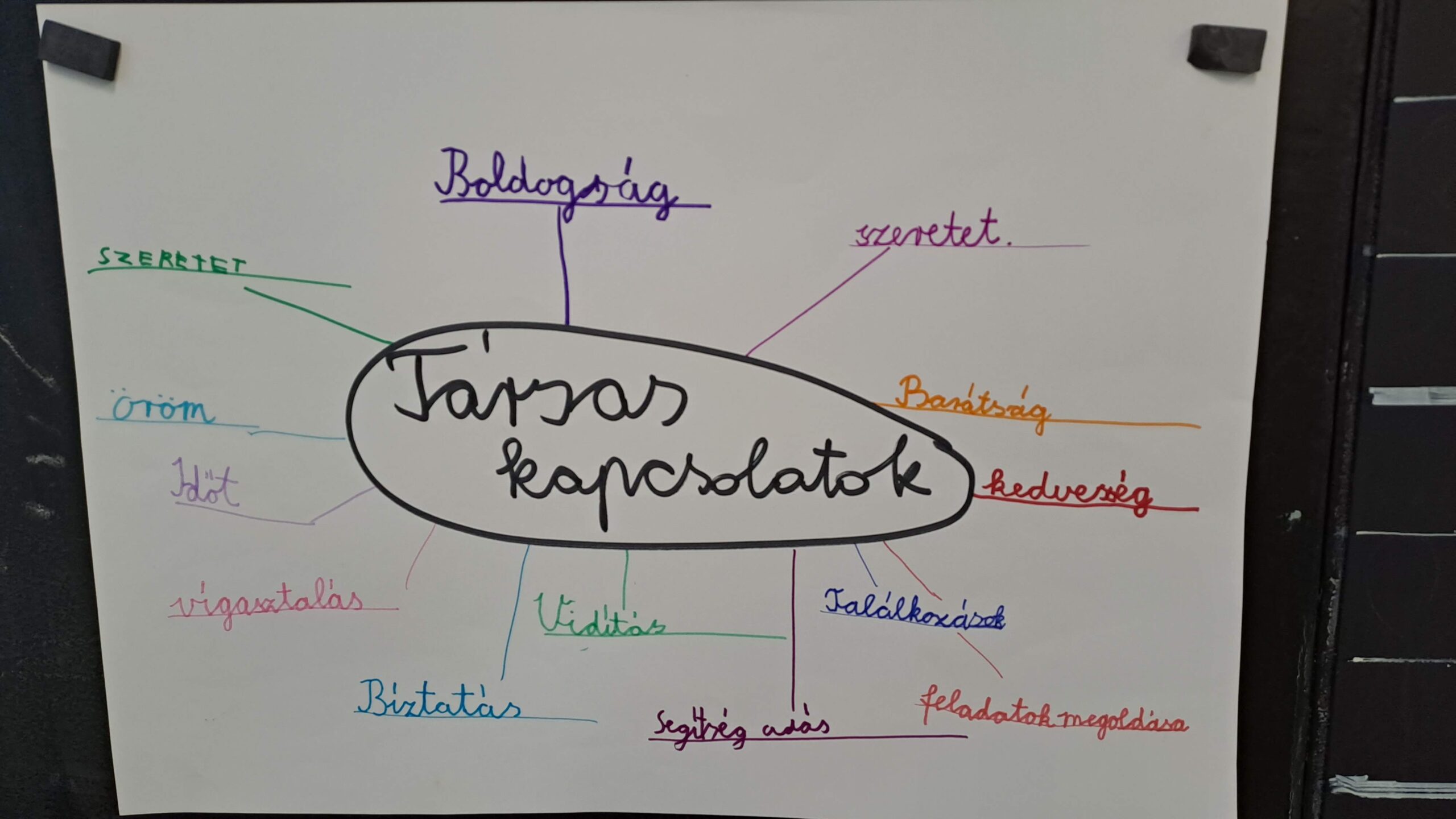 Hosszantartó jólléti szintünk elérésének és fenntartásának legfontosabb tényezője nem más, mint a kapcsolatrendszerünk. Egyesek jól érzik magukat a baráti társaság széles körű hálózatában, míg mások az érzelmi támogatást nyújtó, szorosabb kapcsolatokból álló kisebb hálózatot részesítik előnyben. A harmadikosokkal a beszélgetések, játékos feladatok során rávilágítottunk, hogy ők a társas kapcsolataik felelős szereplői. Tudatosítottuk, hogy a társas kapcsolatok folyamatos törődéssel, ápolással tarthatók karban. Hogy a jó kapcsolat nem magától értetődik, és hogy a konfliktusok, problémák is megoldhatók közös akarattal, kedvességgel. A közelebbi- távolabbi társas viszonyokat többféleképpen ábrázolták, mindenki talált kedvére valót. Gondolattérképet, kördiagramot is készítettünk a kapcsolatok fontosságáról.