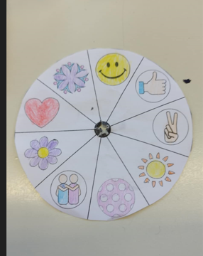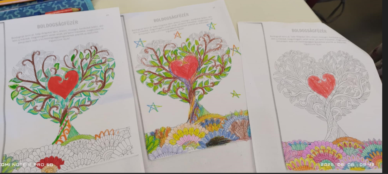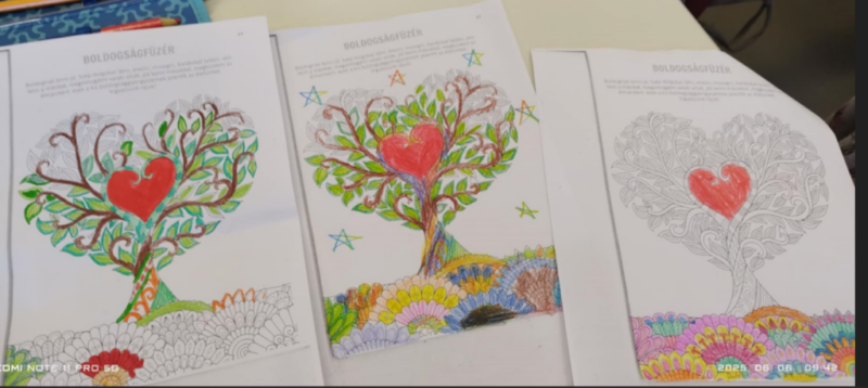 A foglalkozás zárásaként a gyerekek elkészítették a Boldogság kerekét, amelyen az év során feldolgozott tíz témakör mindegyike saját szimbólummal szerepelt. A kerekeket a gyerekek saját elképzeléseik szerint színezték ki, így minden alkotás egyedi és személyes lett. Miközben szorgalmasan dolgoztak, Bagdi Bella néhány vidám és lélekerősítő dala szólt a háttérben, amelyek tovább mélyítették a nyugodt, örömteli hangulatot.