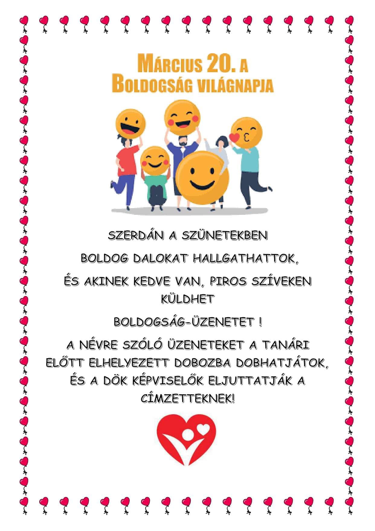 Akinek van kedve piros szívecskékkel üzenhet, a szíveket a DÖK képviselők osztogatják a szünetekben. Aki nem szeretné személyesen átadni az üzenetet, a tanári előtt található dobozba dobhatja! A boldogság diák-nagykövetei kézbesíteni fogják a címzettnek!