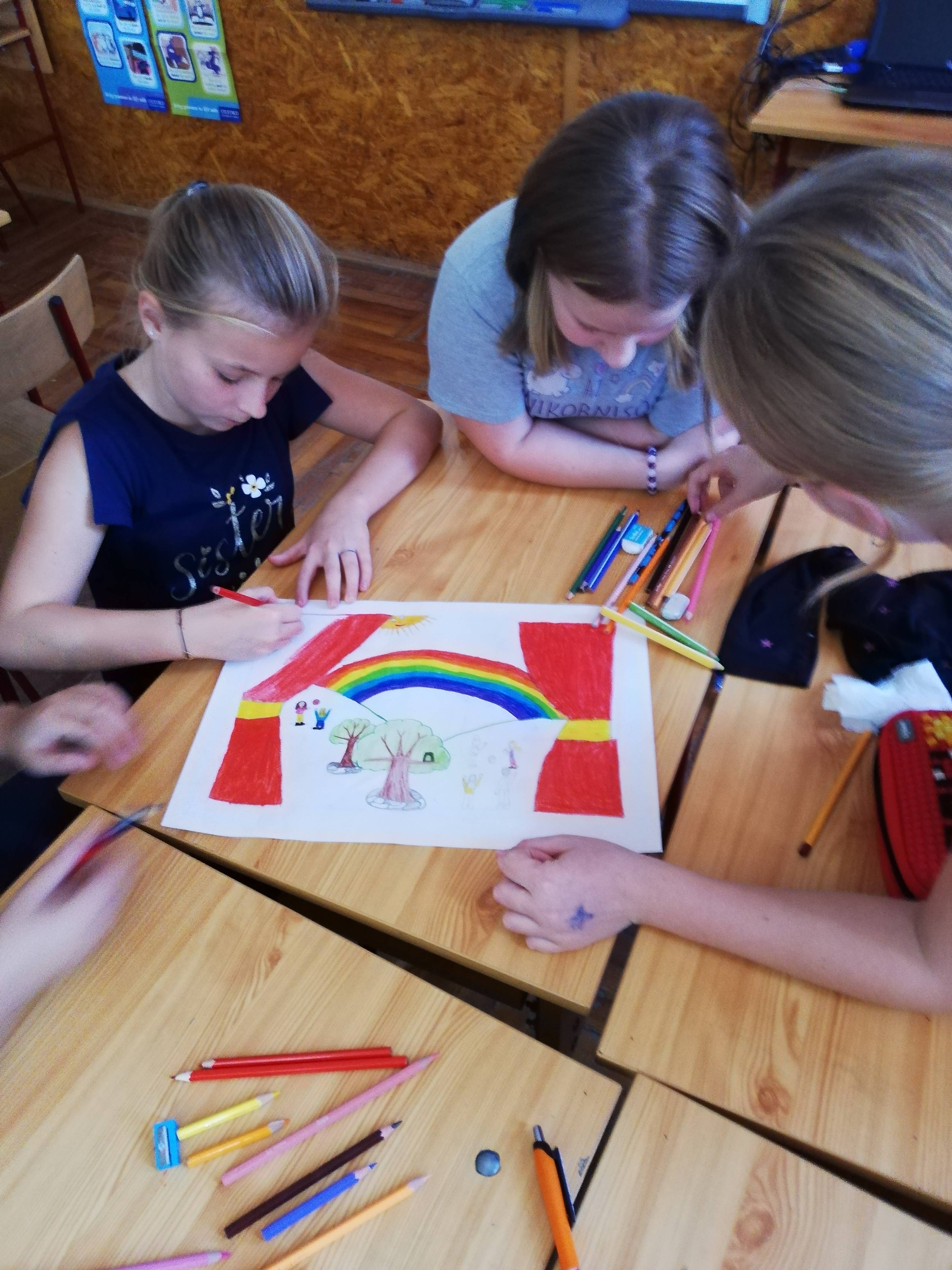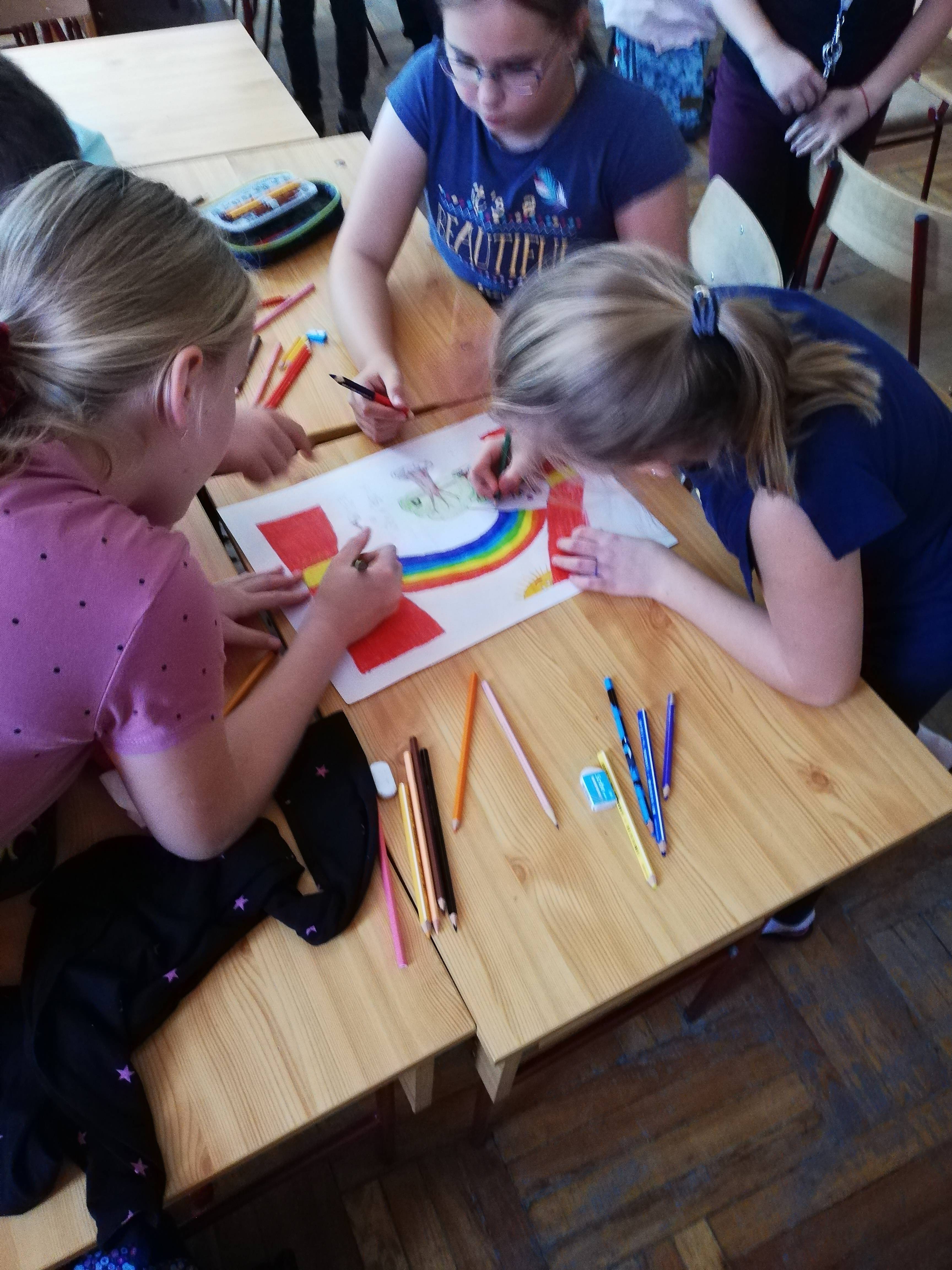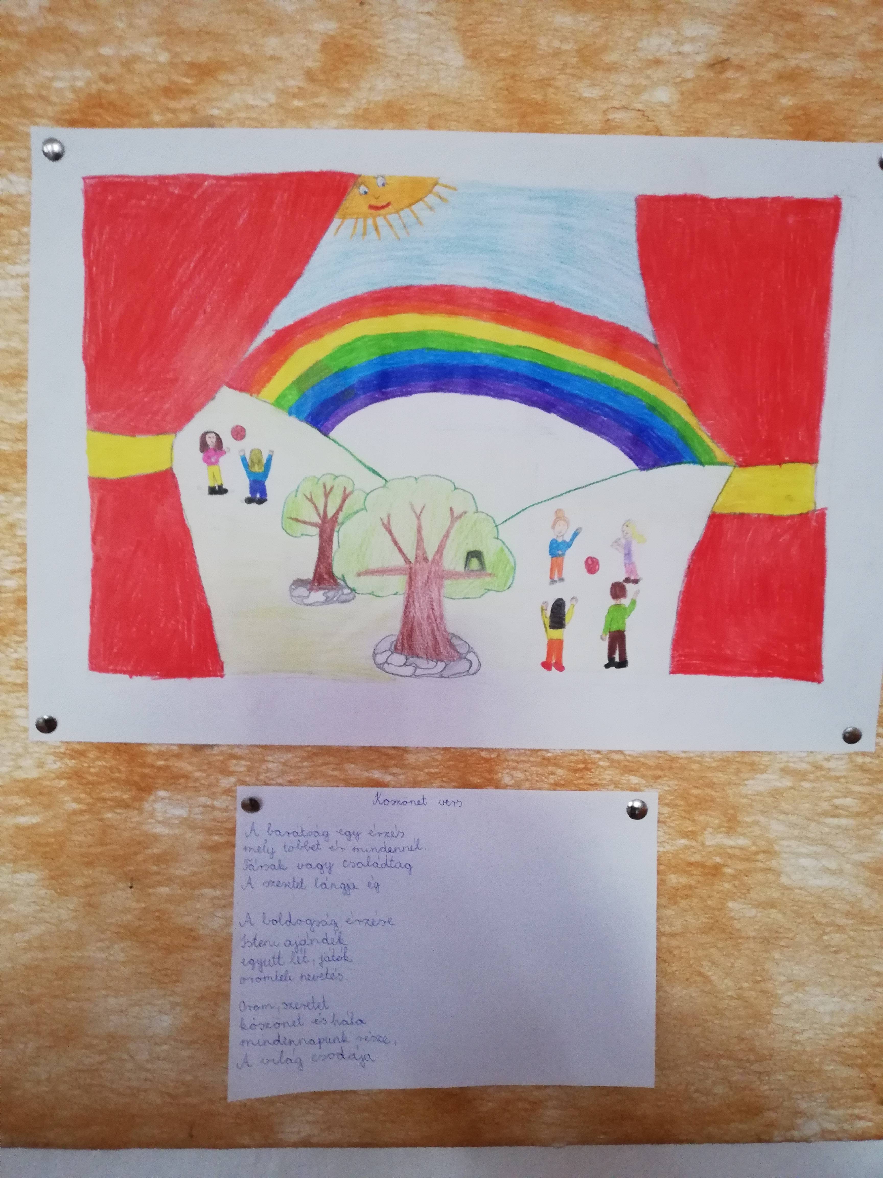 A Boldog Iskola program keretében szeptemberben a Hála gyakorlása volt a Boldogságóra témája az 5. osztályban. Beszélgettünk arról, hogy kinek mit jelent a boldogság, az öröm. Tisztáztuk a hála fogalmát. Majd miután mindenki mondott egy olyan dolgot, ami miatt az utóbbi időben hálás volt, csoportokat alakítottunk. Az egyik csoport rajzzal (Ablak a világra), a másik verssel (Köszönet versben) fejezte ki, hogy számára mit jelent a hála.