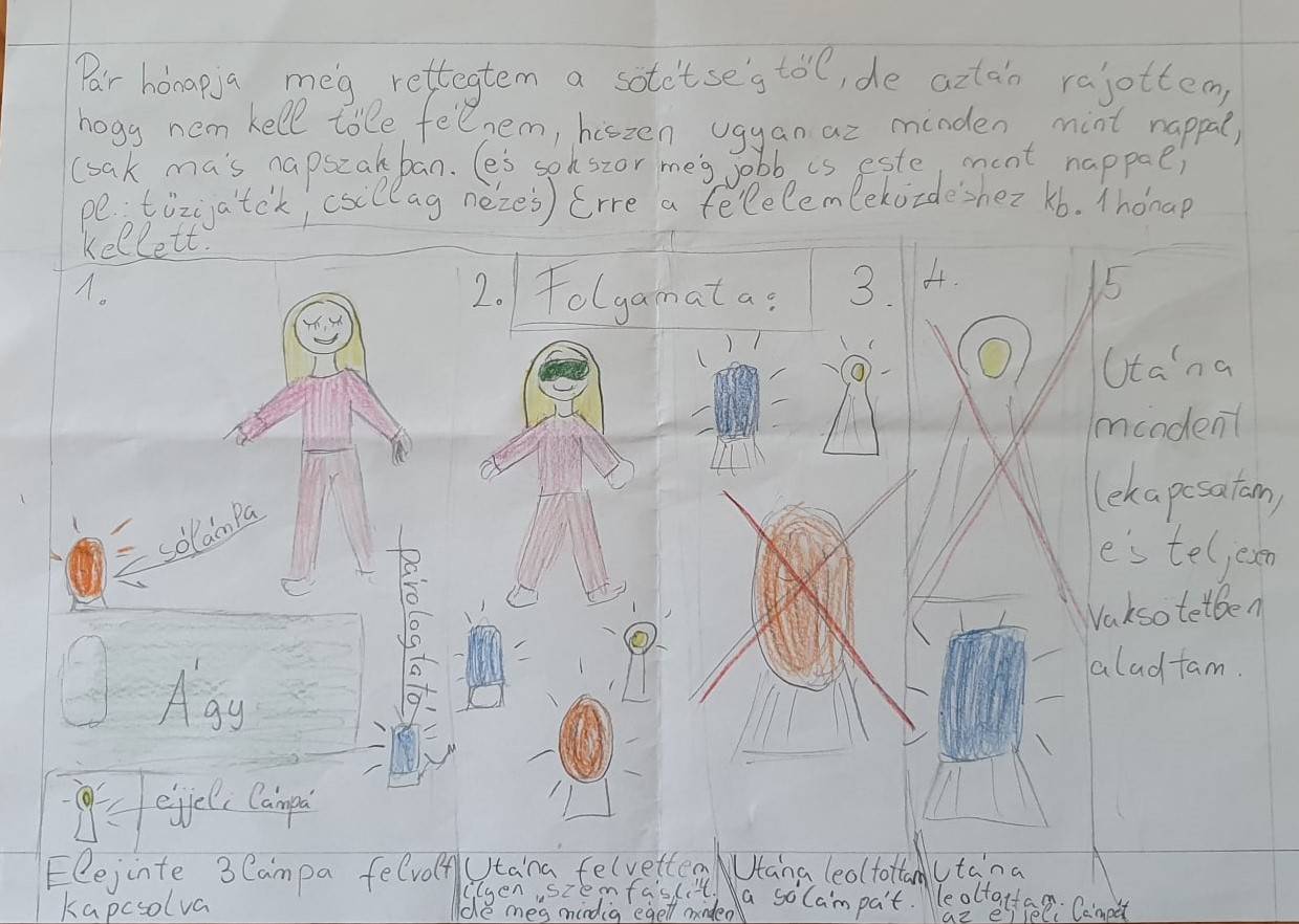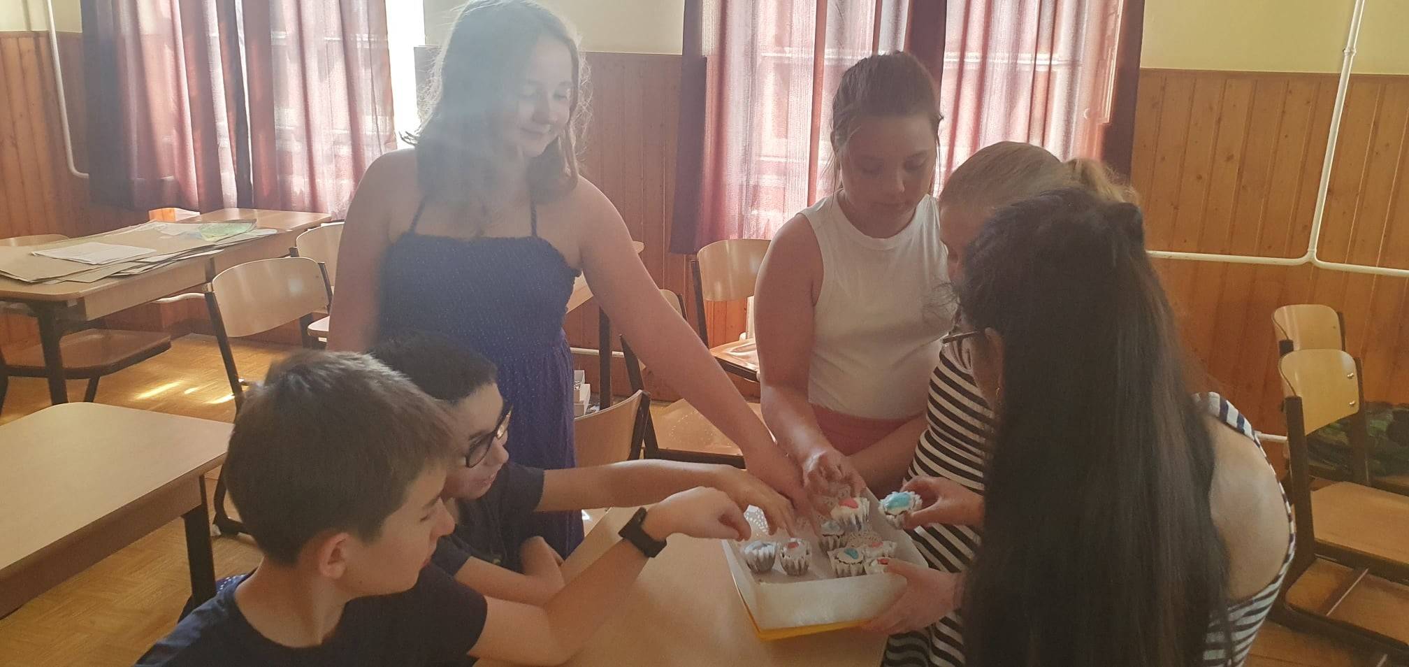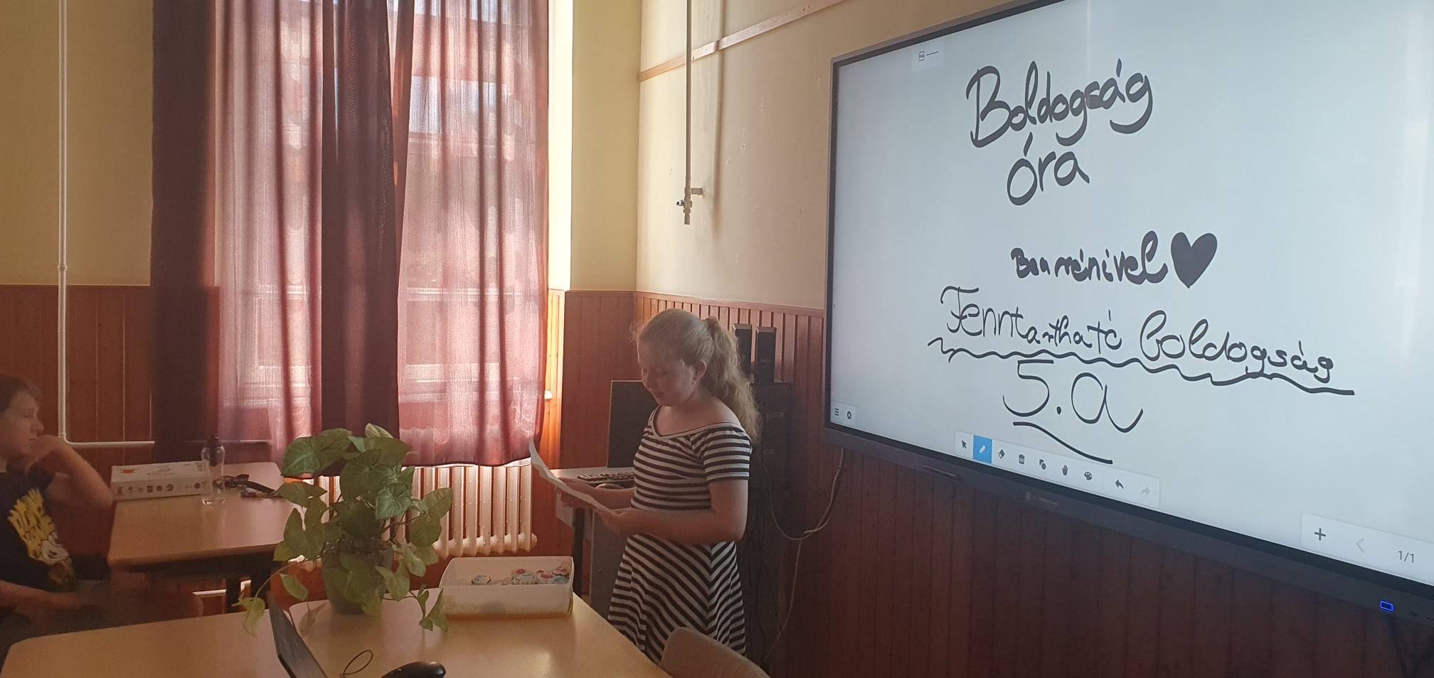 Az egyik kislány utolsó óránkra lerajzolta és elmesélte, hogyan küzdött meg a félelmével, a sötétséggel. Ez az eredmény is a Boldogságórán megismert egyik megküzdési stratégia alkalmazásának sikere! Hálájaként a kis csoportunknak meglepetésből süteményt sütött, melyet jó hangulatban fogyasztottunk el. A Szivecskék 5.a csoportnak van egy mozgáskorlátozott kisfiú tagja is, aki sajnos a tanévben nagyon sokszor hiányzott. A gyerekek szeretettel, odafigyeléssel segítették Őt egész tanévben, támogatták, lelkesítették, apró sikereit tapssal, dicsérettel jutalmazták. Szerencsés vagyok, hogy egy ilyen csupa szív közösségnek lehetek a tagja! Öröm a Velük való együttlét, közös gondolkodás, beszélgetés. Hálás vagyok azért, hogy a Boldogságórák által sokkal jobban megismerhettem a gyerekeket és hozzájárulhattam ahhoz, hogy a tartós boldogságszint-emelkedés elérése felé terelhettem Őket! Hiszem, hogy „Csakis szeretettel lehet eredményesen nevelni.”, mint ahogy Berkesi András is megfogalmazta.