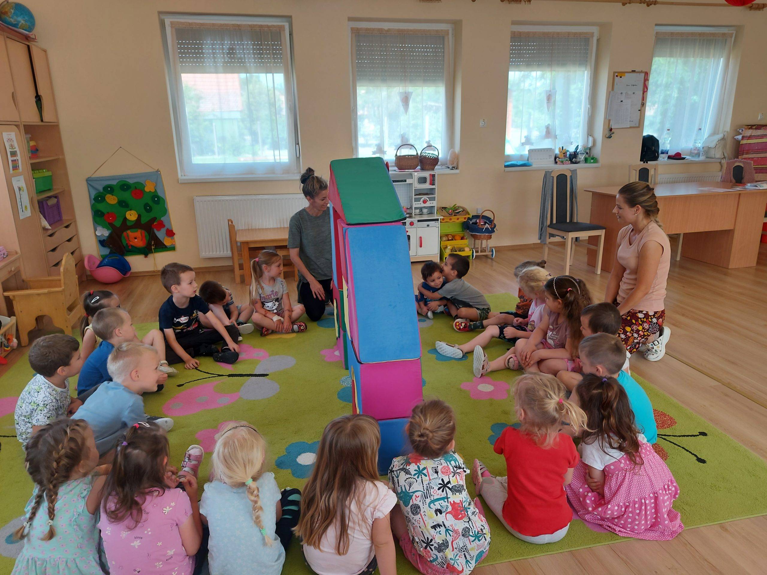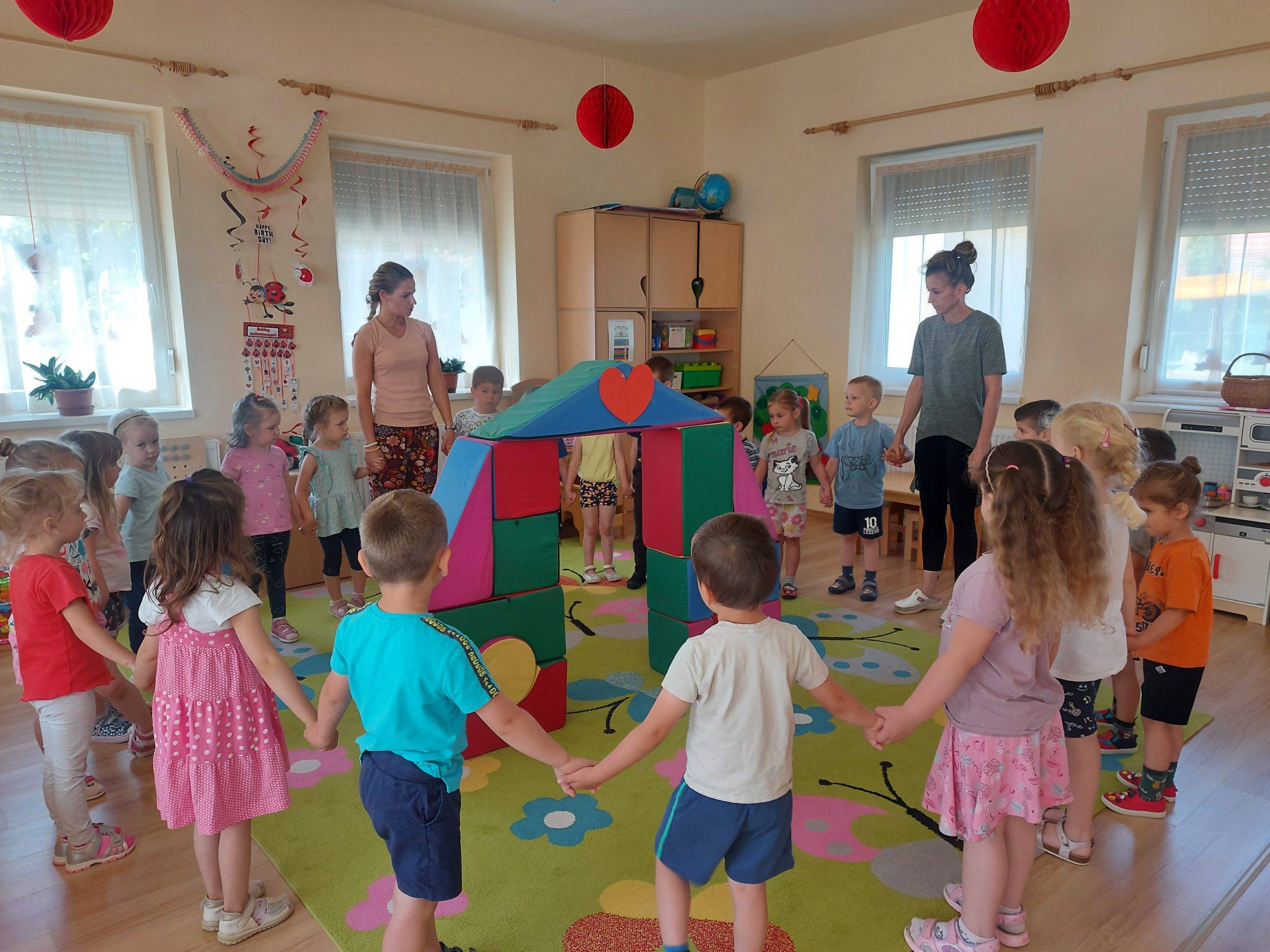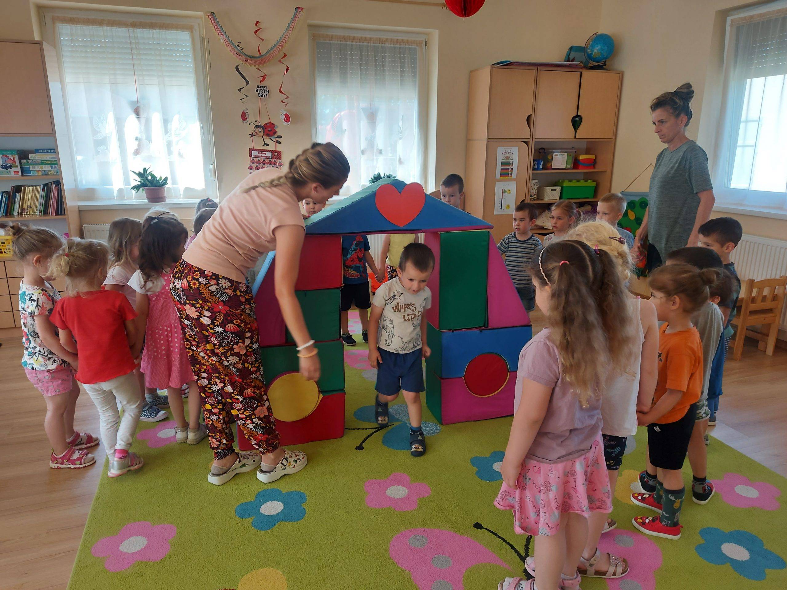 Végül hatalmas szivacskockákból építettem a gyerekeknek egy boldogságvárat, ami körül eljátszottuk a Dombon törik a diót… kezdetű énekes játékot. A várat körbeülve megvalósítottuk az Ölelésláncot – mindenki megölelte a mellett lévő társát és az ölelés körbeért. A vár körül felidéztük a megmászott lépcsőfokokat és felkerült az utolsó szimbólum is a helyére. Átadtam a csoportnak a Hála Oklevelet, mely kikerült a faliújságra a Boldogságtablónk mellé. Végül mindenki áthaladhatott a Boldogságvár kapuján és örömmel mentünk az udvarra, ahol kedvük szerint elkészíthették a saját homok boldogságvárukat.