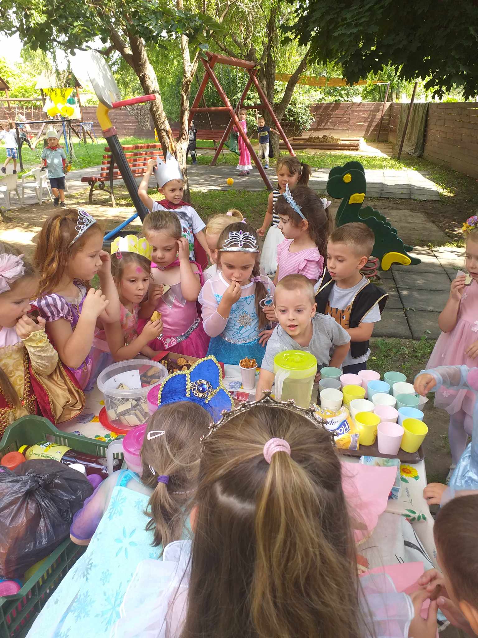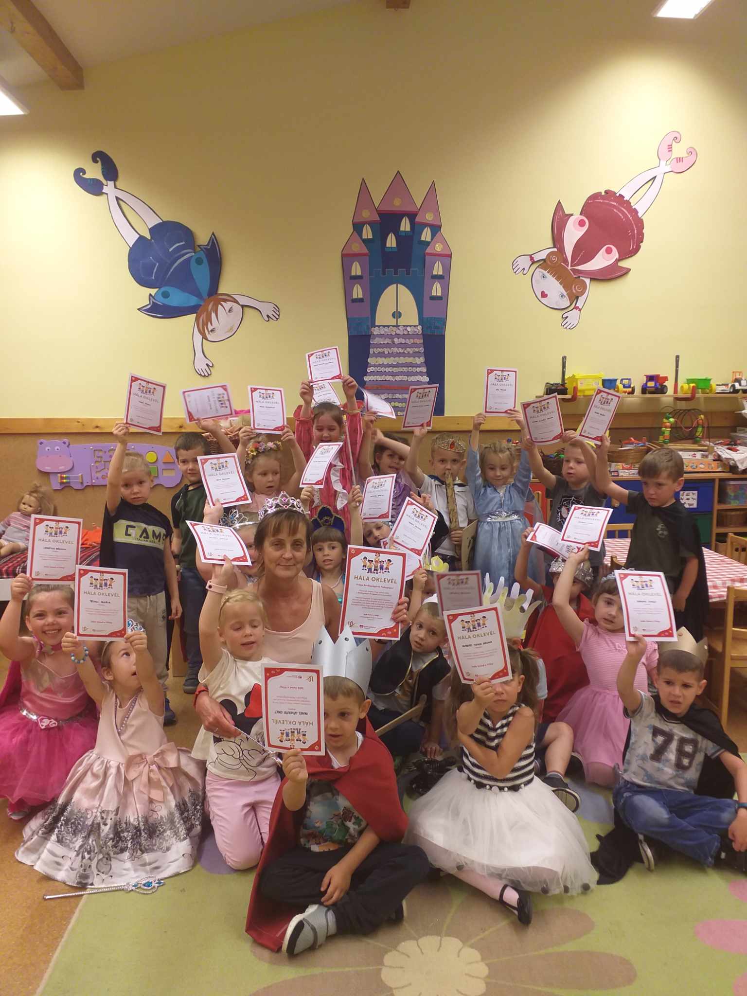 Elérkeztünk az utolsó Boldogságóránkhoz, melyet már nagyon vártak a gyermekek. Kíváncsian kérdezgették minden nap, mikor nyílik ki a Boldogvárunk kapuja. Előző nap már elkezdtük a szervezést, mert megkértem a szülőket, hogy az utolsó órához, aki szeretne, az beöltözhet királylánynak, tündérnek, lovagnak, királyfinak. A gyermekek reggel lelkesen hozták a ruháikat, mutogatták egymásnak. A szülők jelezték, hogy a gyermekek már nagyon várták ezt a napot, véletlenül sem szeretnének kimaradni belőle. Nagy meglepetésemre az egyik kislány készített nekem is egy királylányos karkötőt a mulatsághoz, ami nagyon jól esett. A gyermekek nagyon izgatottak voltak, nem győzték már kivárni a kapunyitást. Örömmel fogadták a varázsládán Boldog Dórát, vidáman üdvözölték. Kezdő relaxációs gyakorlat a „Repül a madár, szárnyalva száll, mert szabad madár” indítottuk el az órát. Azért választottam ezt, mert itt a nyár, amikor kicsit szabadabban élhetünk. A közös éneklést is a gyermekek kívánsága szerint választottuk ki, mert ez már az utolsó, a végéhez érkeztünk a Boldogságóráinknak. Már nem is kellett semmit mondanom, maguktól énekeltek, táncoltak. A szeretetfolyosón mindenki végig haladt, még mi felnőttek is. Örömömre szolgált, hogy milyen kedvesek tudnak lenni egymással szemben, egyre többen nyilvánították ki saját véleményüket. A mesehallgatási szokásainkat megtartva a mesepárnáikon ülve helyezkedtek el a gyermekek, meggyújtottuk a mesegyertyánkat, majd Dórával közösen mondták el, a már ismert mondókát, meghallgatták a mesét. Most nem szemléltettem, hagytam, hogy saját képzelőerejüket használják. A mese végén a Boldogságvárunk lépcsőfokait számláltuk, majd felidéztünk sok közös élményt. A „Mi vagyunk a Harangosok” közös alkotásunkat ismét elővettük. Jó volt látni, mennyire tetszett nekik. Felértünk a 10. lépcsőfokra. Minden kisgyermek választott egy szimbólumot, ami a legkedvesebb volt számára. Vére kinyílt a kapu, mehettünk a mulatságba. A” Harangosok” miután beöltöztek, az egész óvodában végigvonultunk, varázspálcámmal átváltoztattunk valamennyi dolgozózót tündérré, királylánnyá, ami mindenkinek mosolyt csalt az arcára. Az óvoda udvarán zenés, táncos napot tartottunk. Vidám hangulat vette kezdetét, ahol nemcsak mi, de a többi csoport is bekapcsolódott. A bálban természetesen az evés-ivás sem maradt el, minden ropogtatni valót elfogyasztottak a gyermekek. Az asztaloknál a boldogság kerekét készítették el, amit haza is lehetet vinni. Összegzés: A Boldogságórákat minden alkalommal várták a gyermekek A napi tevékenységeiken túl, mást is kaphattak a gyermekek, melyek jobb jókedve derítették őket, kicsit közelebb kerülhettünk egymáshoz. A mai nap megelégedéssel töltött el, ahogy láttam a vidám gyermek arcokat. Az egyik szülőtől visszajelzést is kaptam” Ez volt a legjobb nap az évben, melyet már nagyon várt a gyermeke, végre kinyílt a vár kapuja, ahol nagyon jól érezte magát.” JOBB VELED A VILÁG