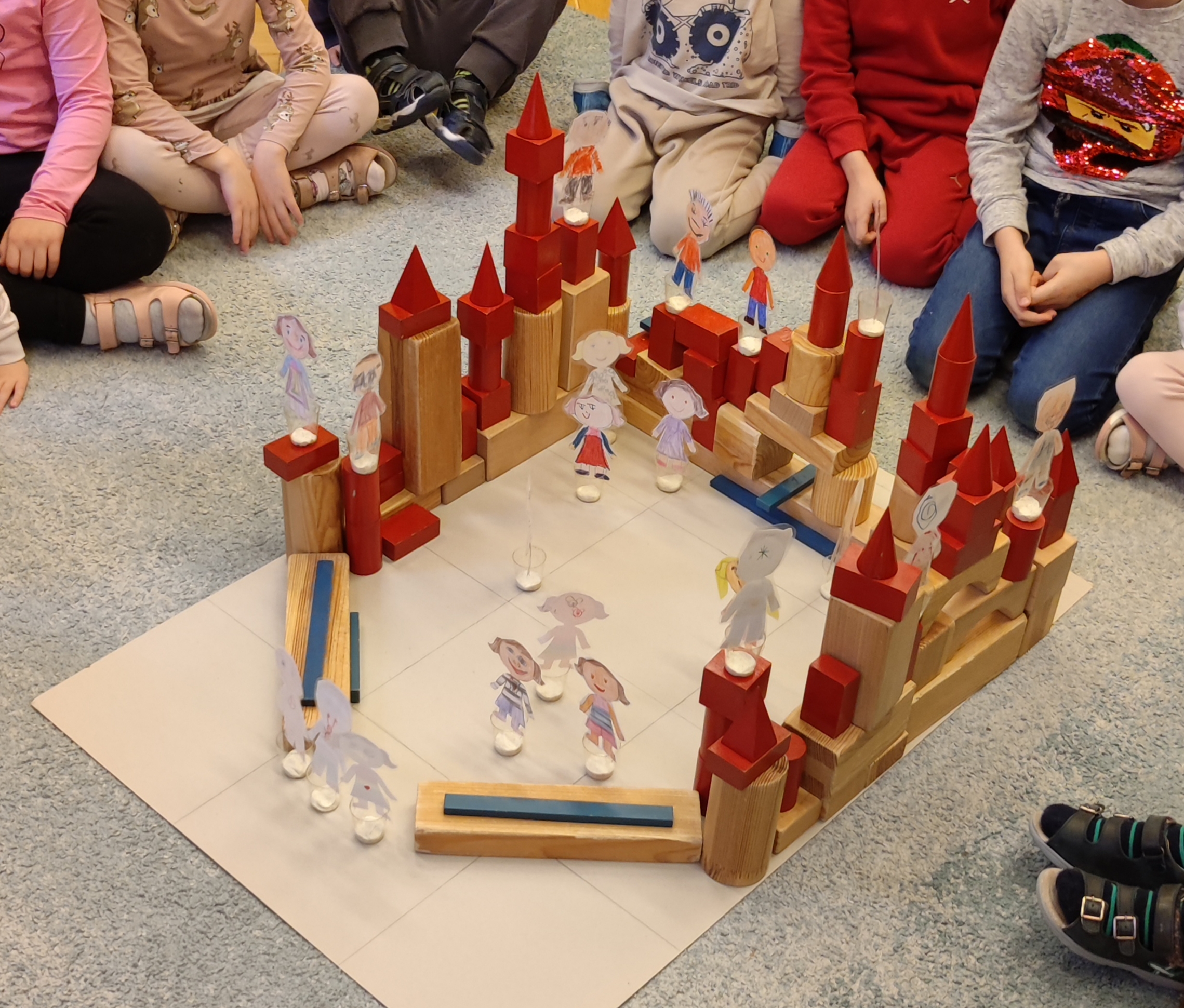 Boldogvárat építettünk a szőnyegen. Mindenki részt vett ebben. Terveztek, javítottak, újra terveztek, építkeztek, ötletetek, majd megépült a közös vár. Lerajzolták saját magukat, amit lamináltam és talpakra ragasztottam, így a munka végén elhelyezhették saját magukat is Boldogvárban. Kértem, hogy gondolkodjanak, mit vagy kit vinnének magukkal a várba, mivel tennék gazdagabbá Boldogvárat? Elhangzott a család, nevetés, okos gondolatok, vigasztalás, ölelés, barát, ötlet, puha takaró, vidámság, kutya, kedvesség, mosoly. Megfogalmazták a saját célkitűzéseiket és azt is megbeszéltük, hogy mi az álom/vágy és a cél közötti különbség. Tudják, hogy az álom teljesülhet erőfeszítés nélkül is, de a célért meg kell dolgozni. A vágy csak álom, a cél már terv.