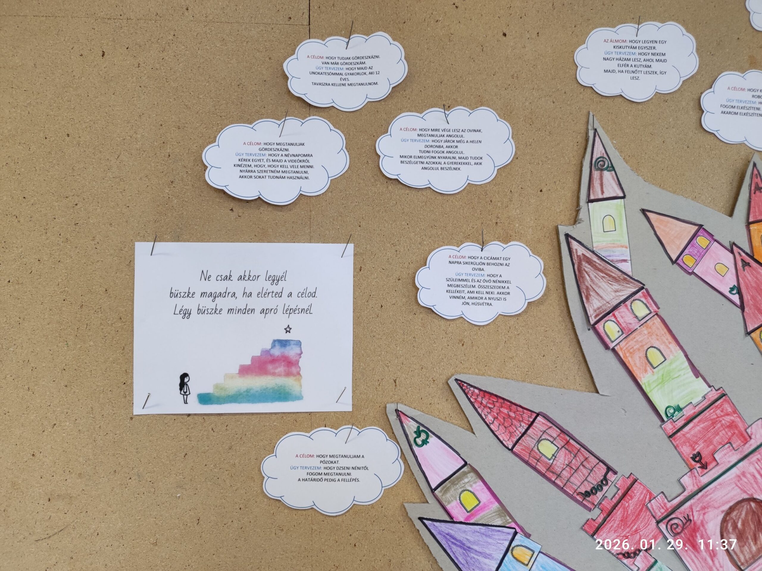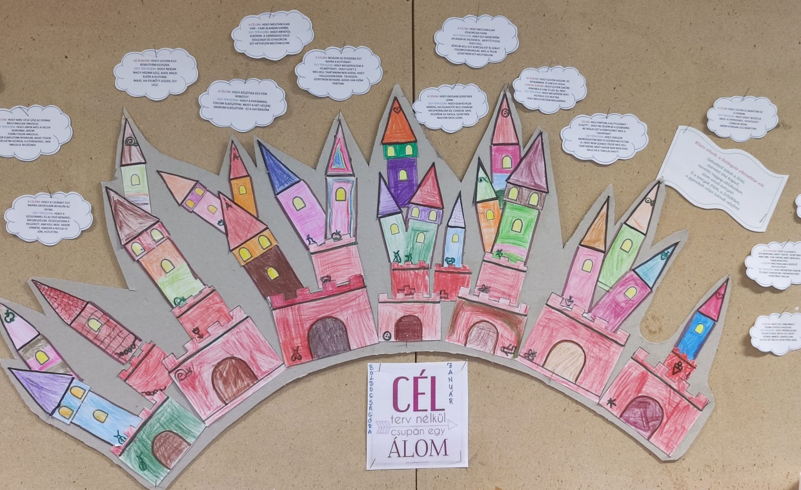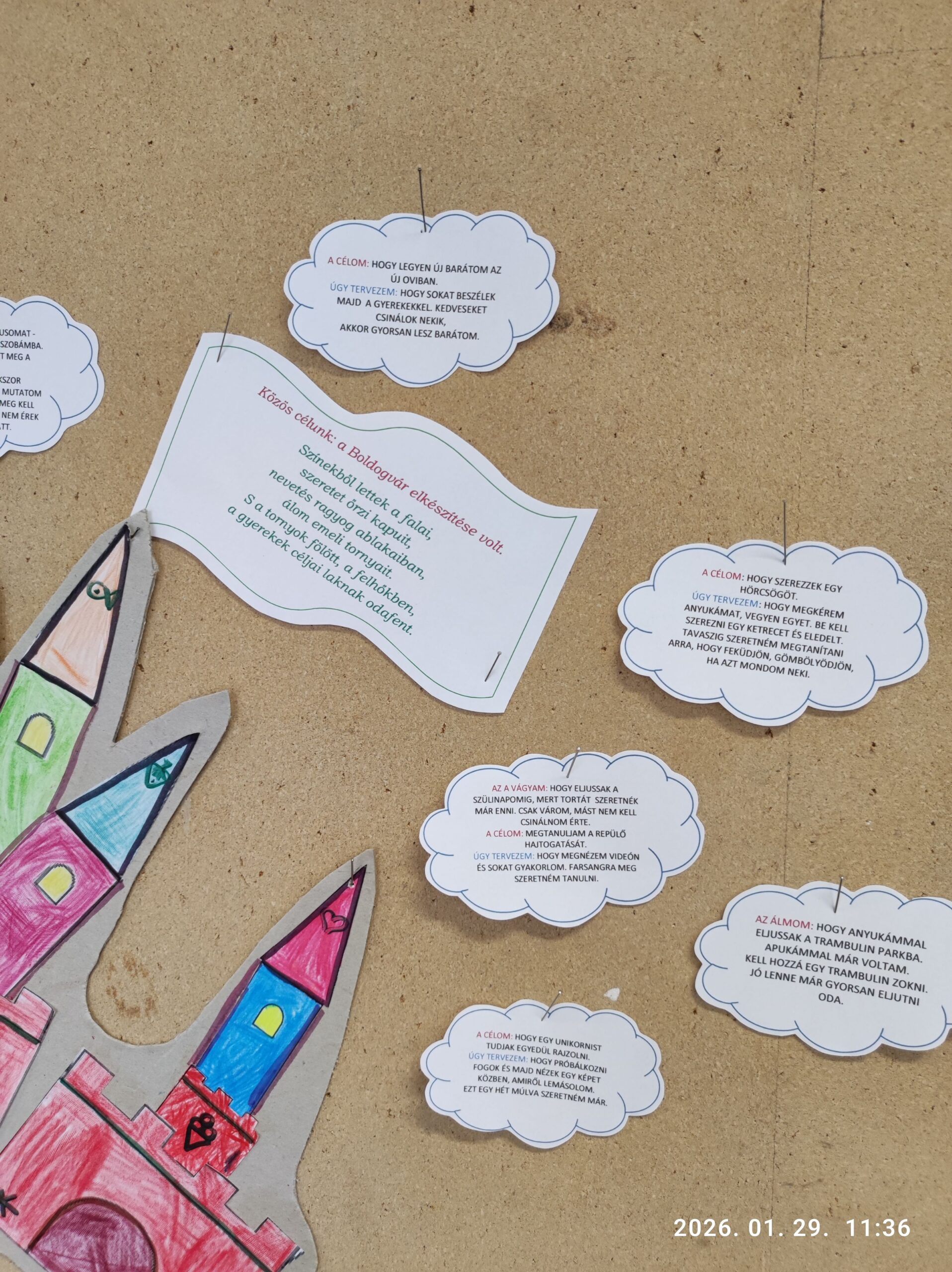 Boldogvár témája több tevékenységben is előkerült, a fantáziájukra hagyatkoztam. Térben is építettünk egy Boldogvárat és síkban is megalkottuk azt. A nagy kartonra ragasztott vár fölé felhőkbe írtam az egyéni céljaikat. A hónap során a szülőket is bevontam a tevékenységbe. Azt a feladatot kapták, hogy próbálják kitalálni, melyik felhőben megjelenő cél tartozhat a saját gyermekükhöz.