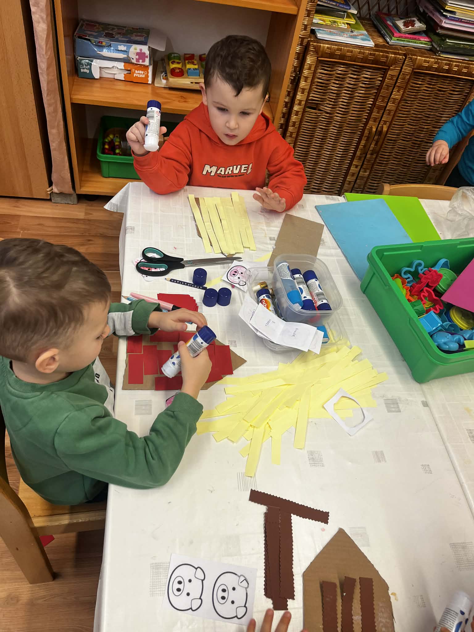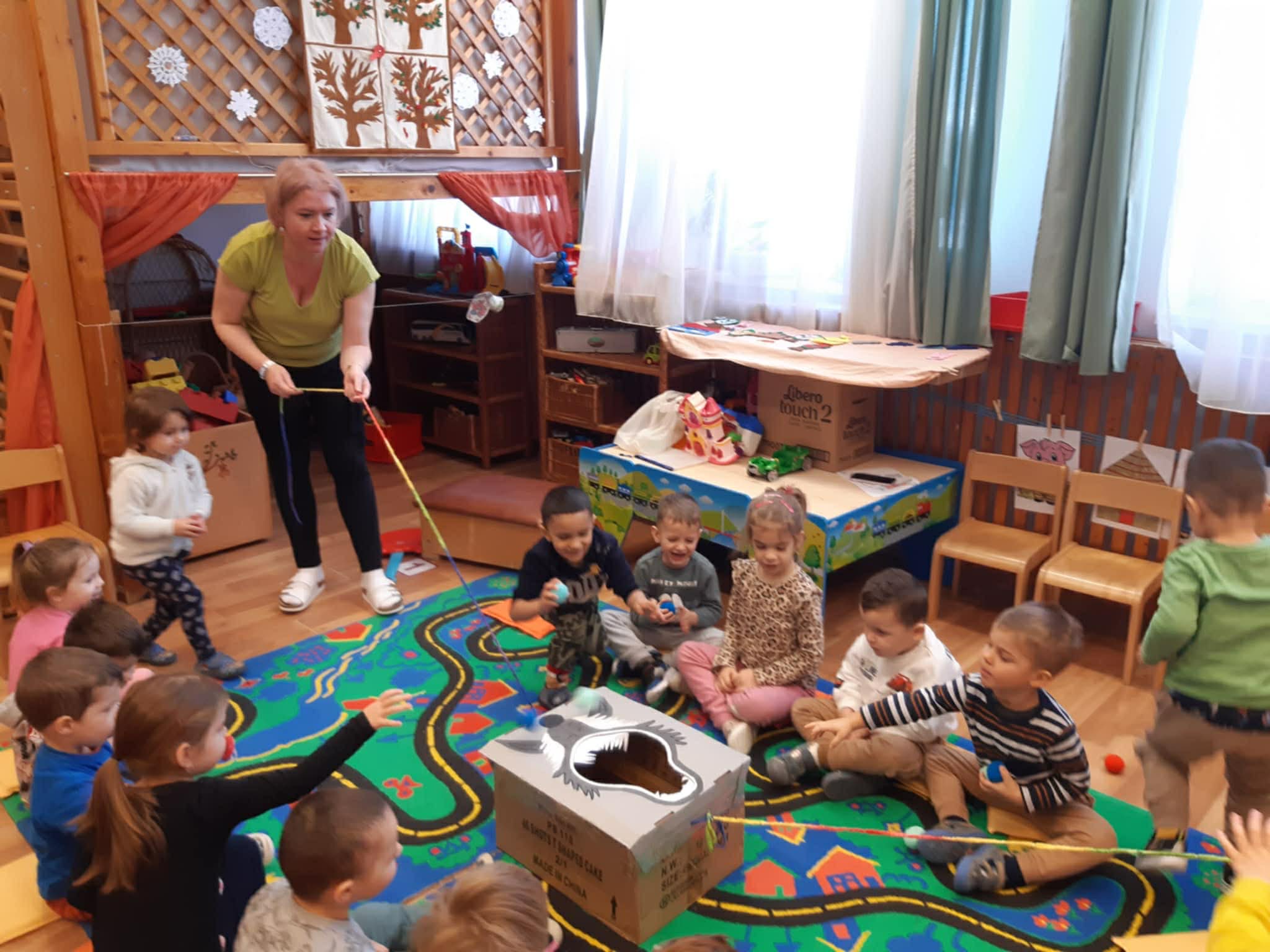 A heti meséhez kapcsolódva egy kartondobozból készült, festett farkas szájába dobhatják a puha kislabdákat.