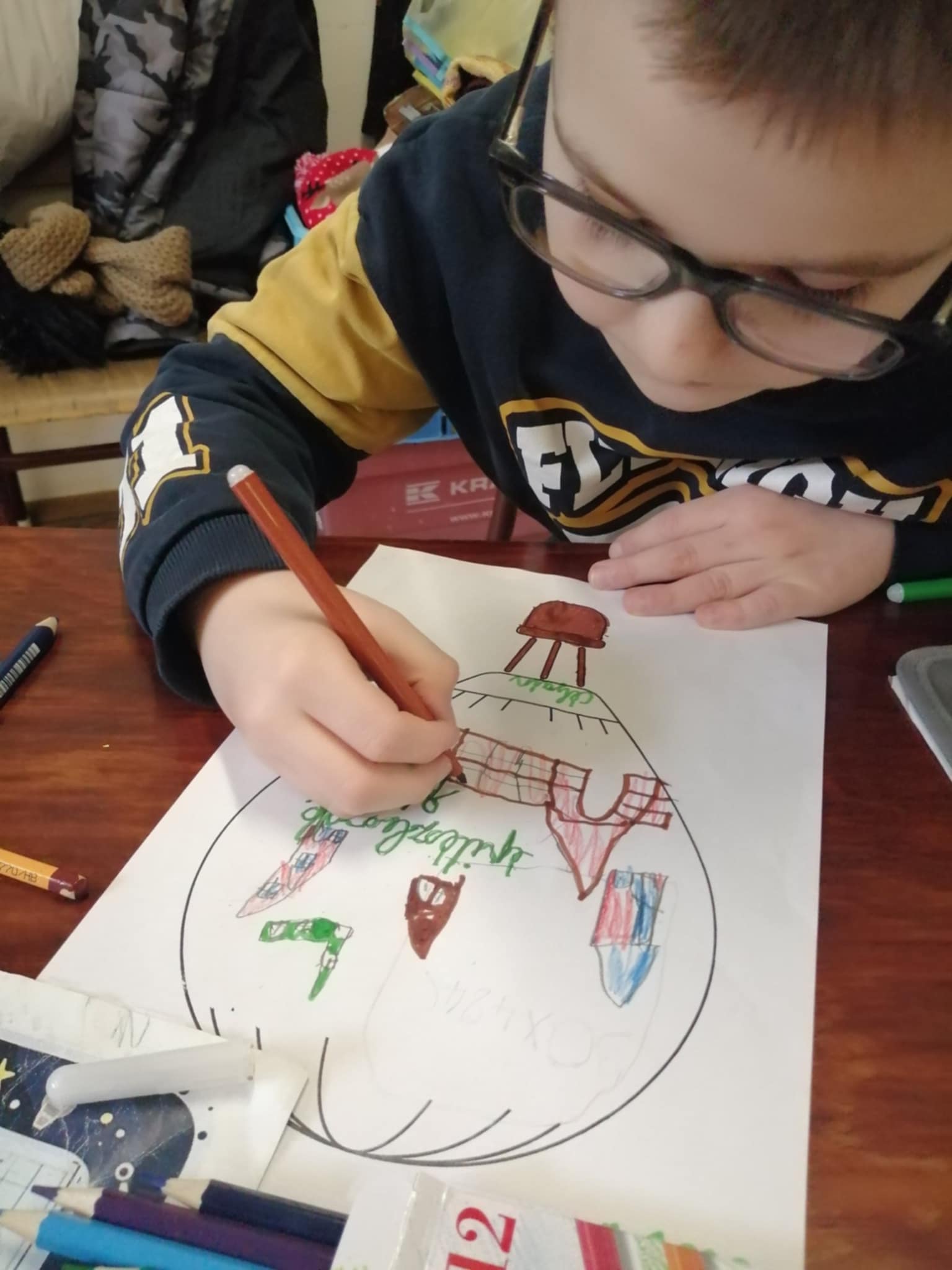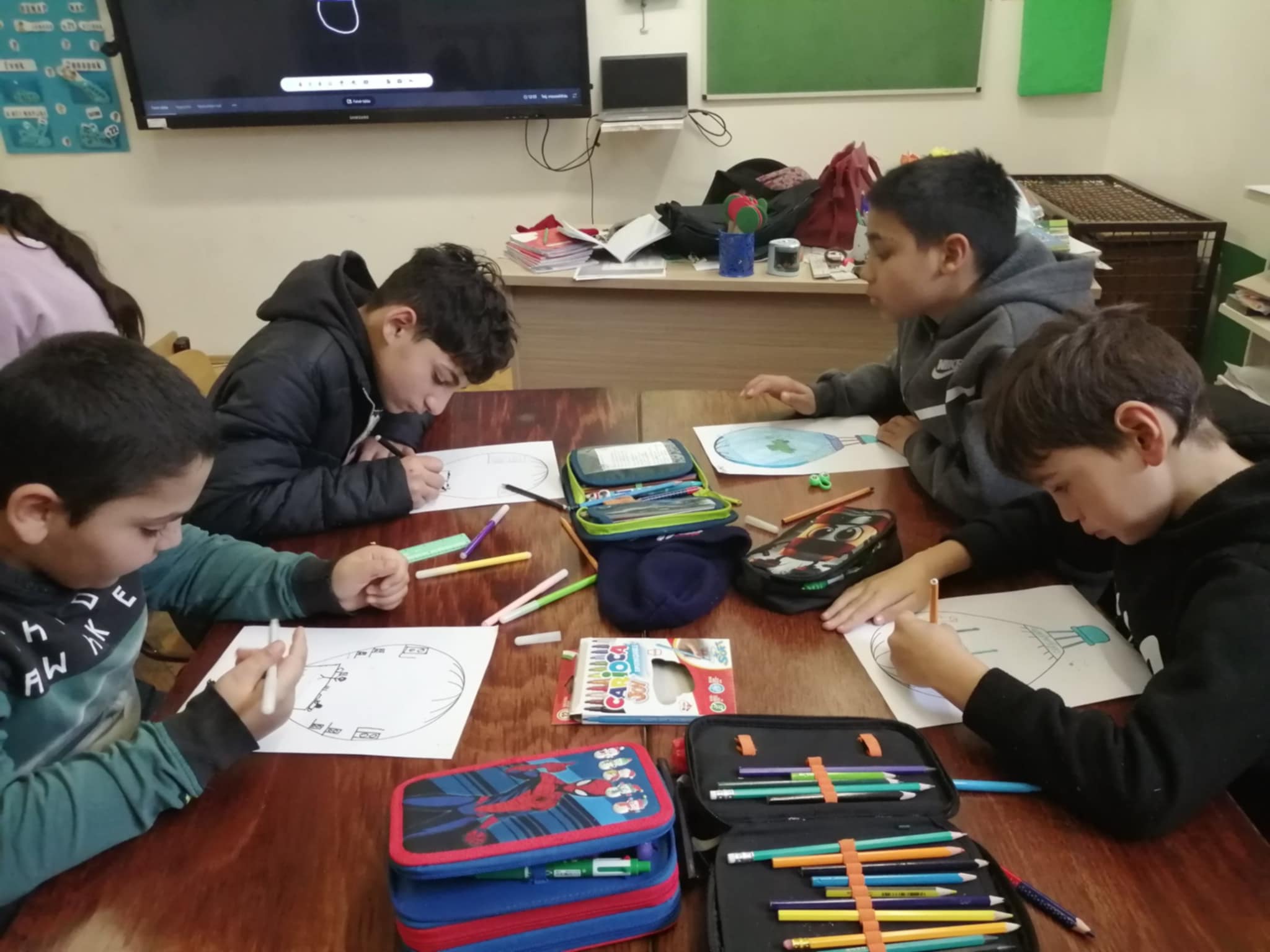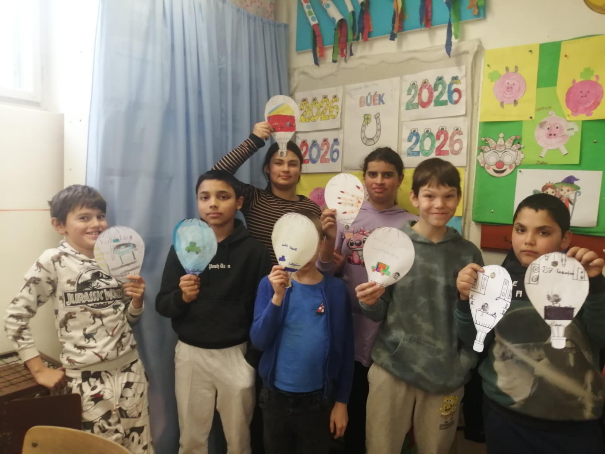 Másnap a hosszú távú céljainkkal foglalkoztunk részletesen. Asztalokhoz ülve mindenki lerajzolhatta egy lassan repülő légballon felületére, az ő legfontosabb célját, vagy céljait. Az IKT kompetenciák fejlesztésének elősegítésére, a feladat folytatásaként lefotózták egymást a tanulók, és a kinyomtatott képekből apró, kerek arcképeket vágtak ki, melyet a léghajó kosarába ragasztottak, amint éppen a céljuk felé repülve, kinéznek a világra. A gyerekeknek nagyon tetszett a kerek kicsi kép, szerintük ez az ő „Avatárjuk”. Erre én nem is gondoltam. A műalkotásokat végül belamináltuk, és kitettük a tanterembe, hogy szem előtt tudjuk tartani a céljainkat.