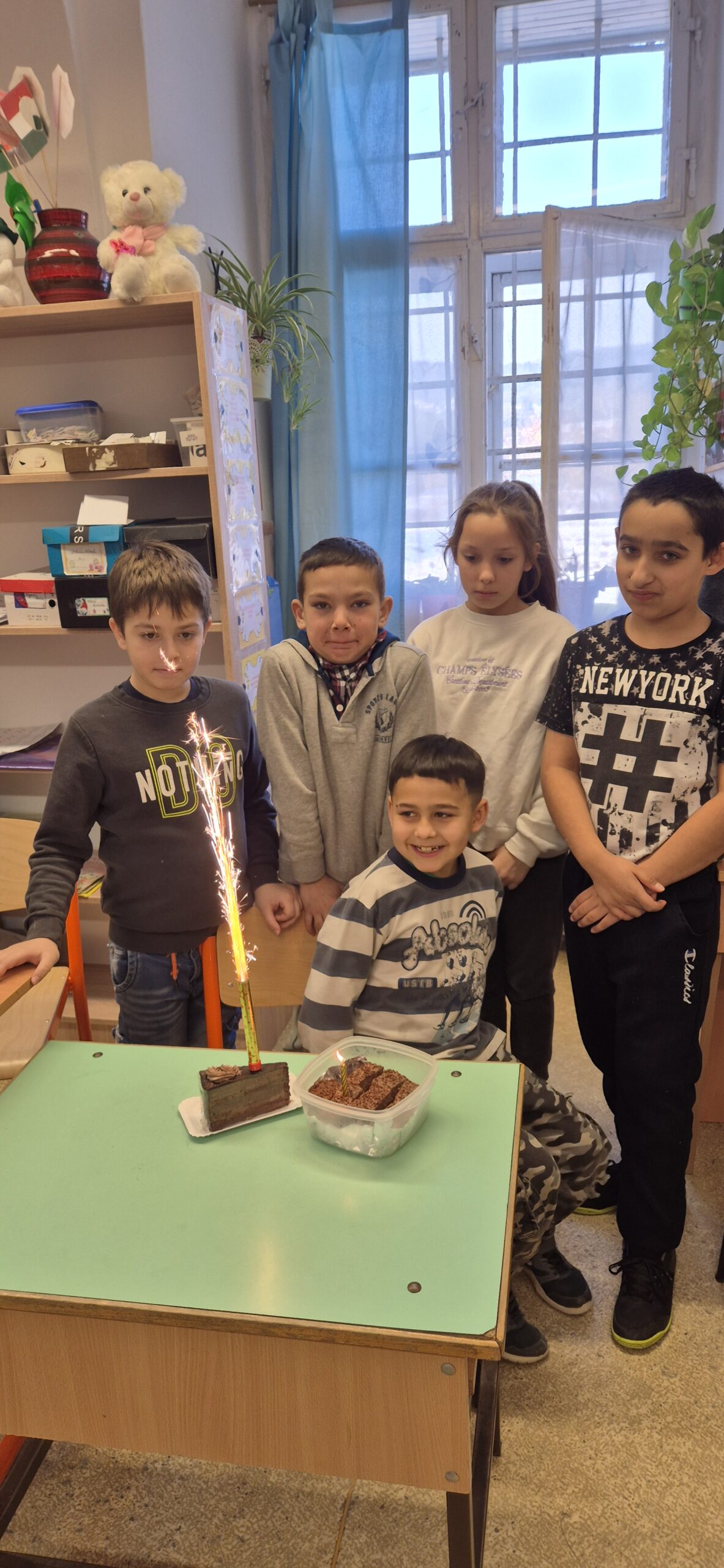 Egyik tanulómnak szülinapja volt, megünnepeltük tűzijátékkal, tortaszelettel, így éppen kapóra jött a csokitorta feladatlap, amit még ajándékba el is készítettek neki a többiek.