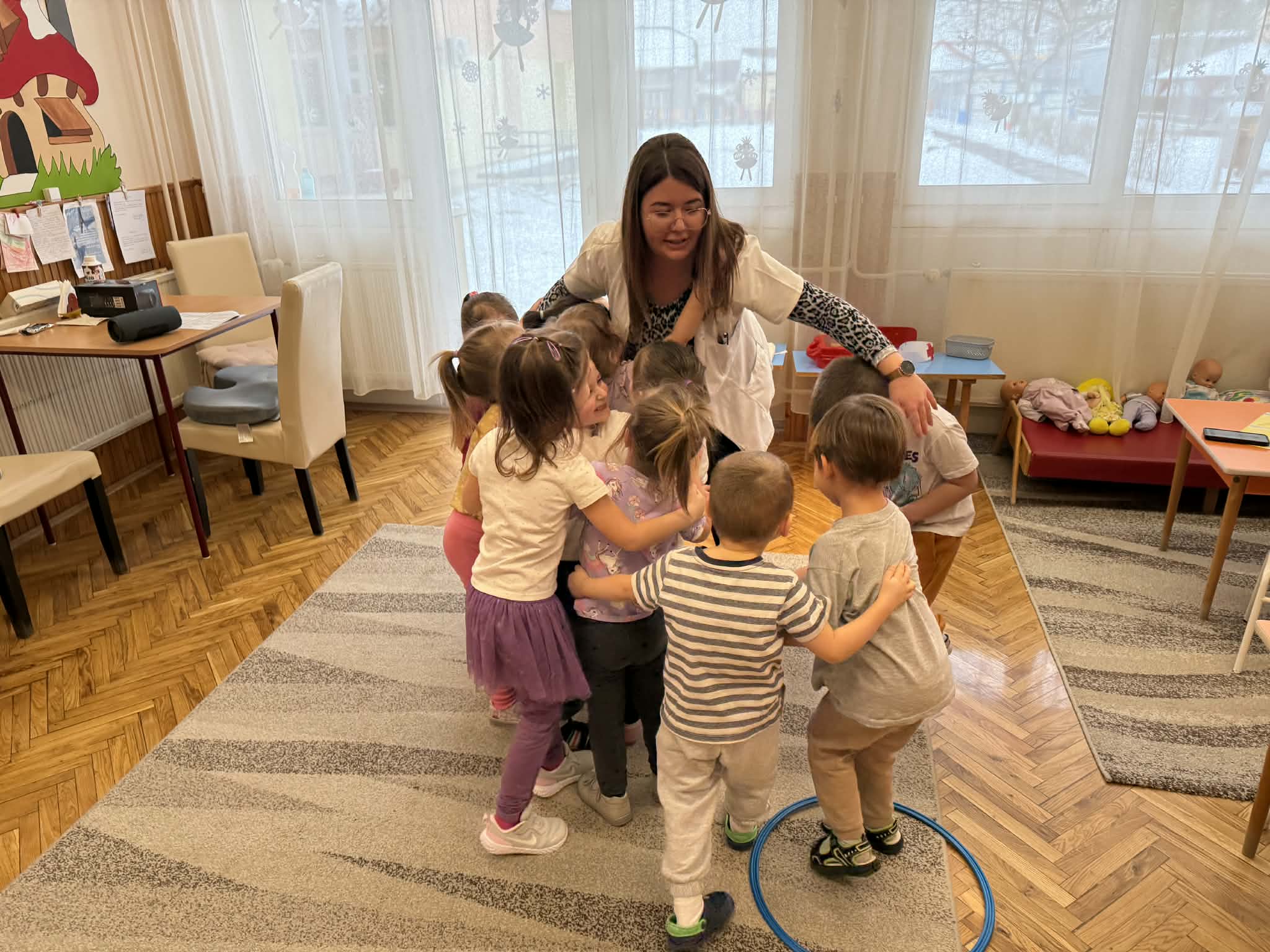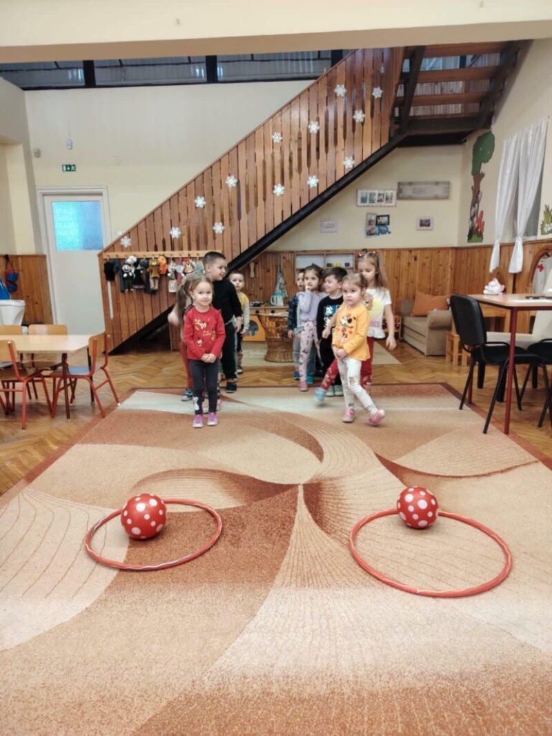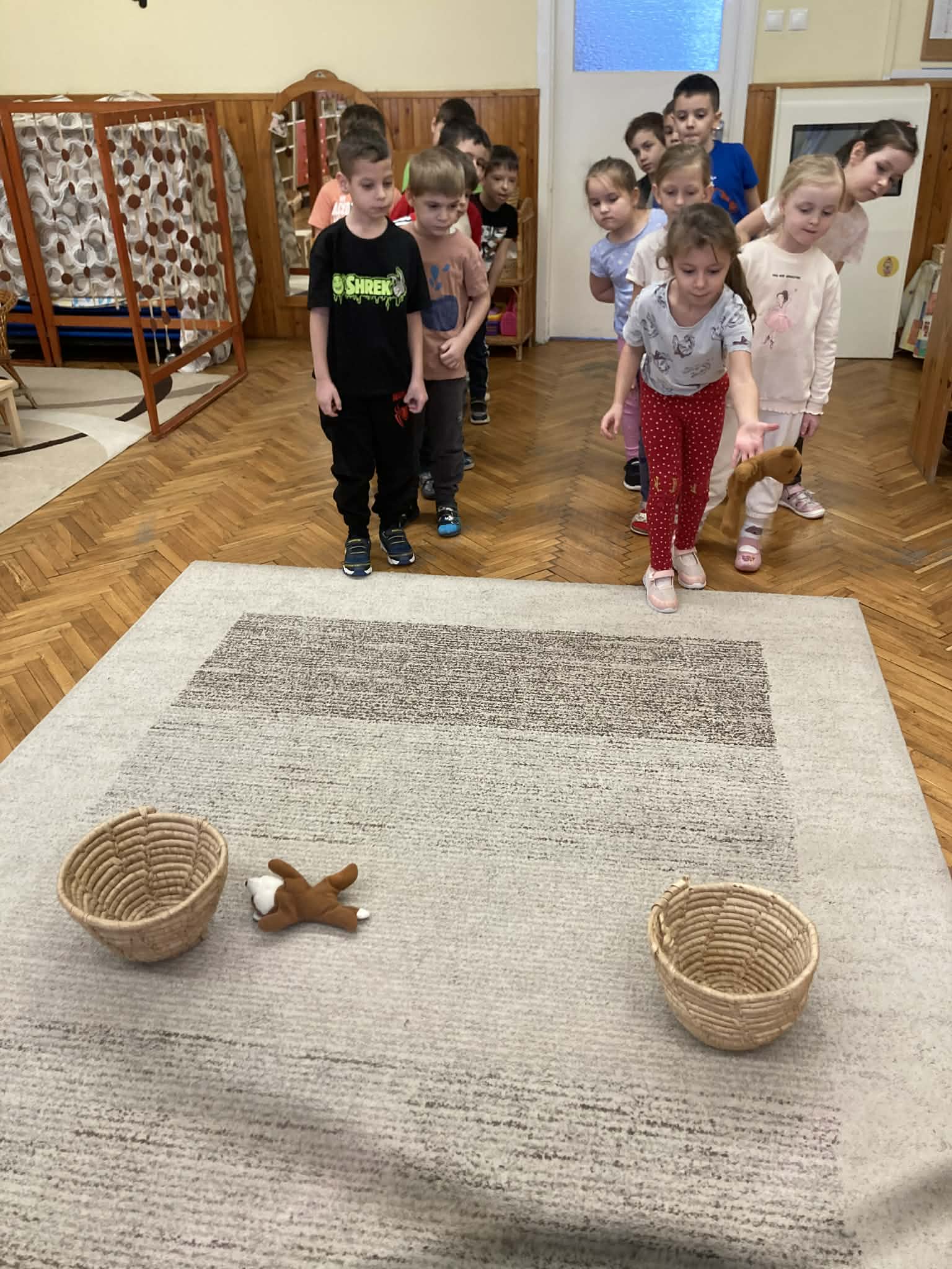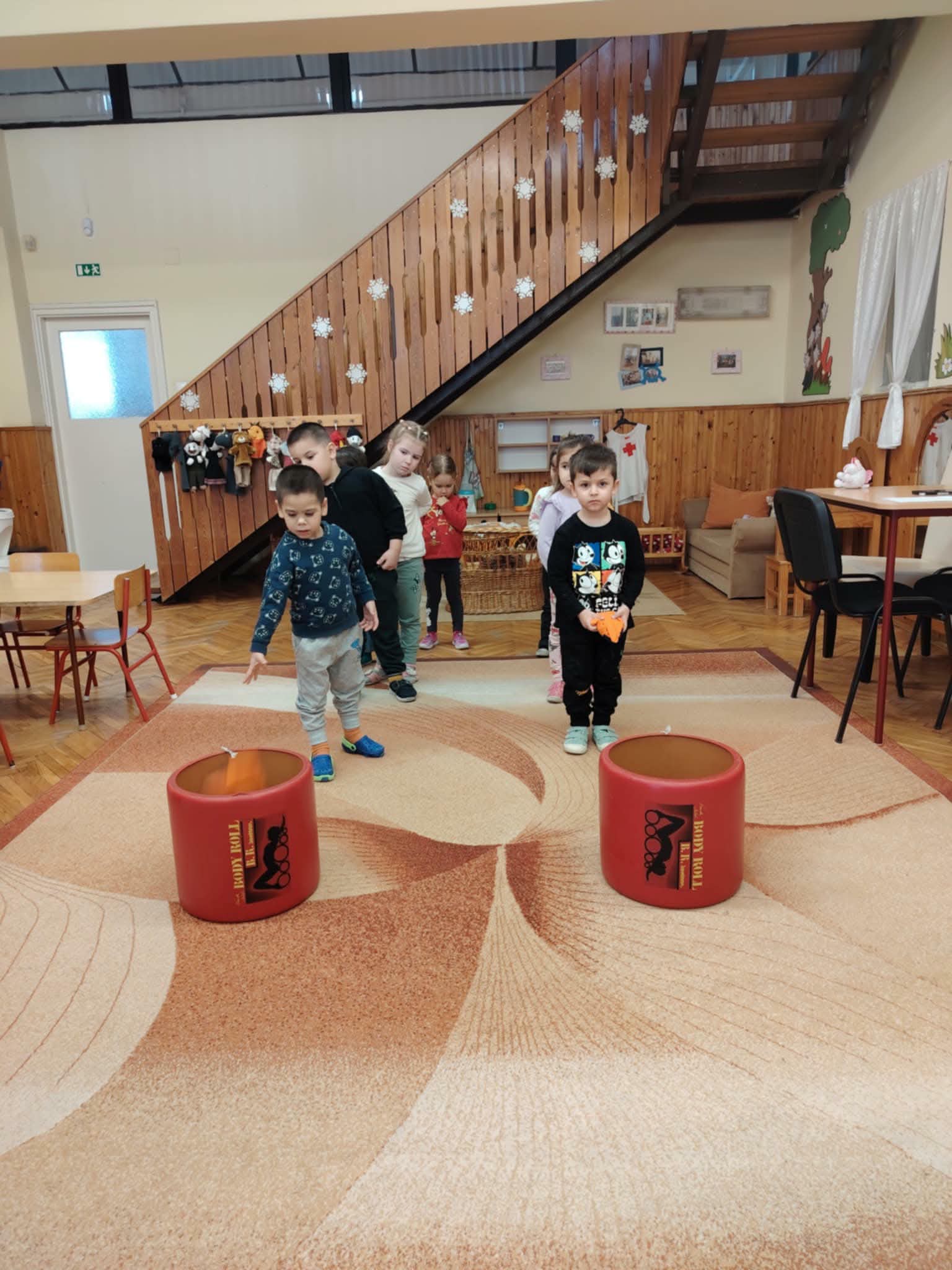 A Napsugár csoportban hasonló játékot játszottak. Annyi különbséggel, hogy babzsákkal kellett célbadobni kosárba.